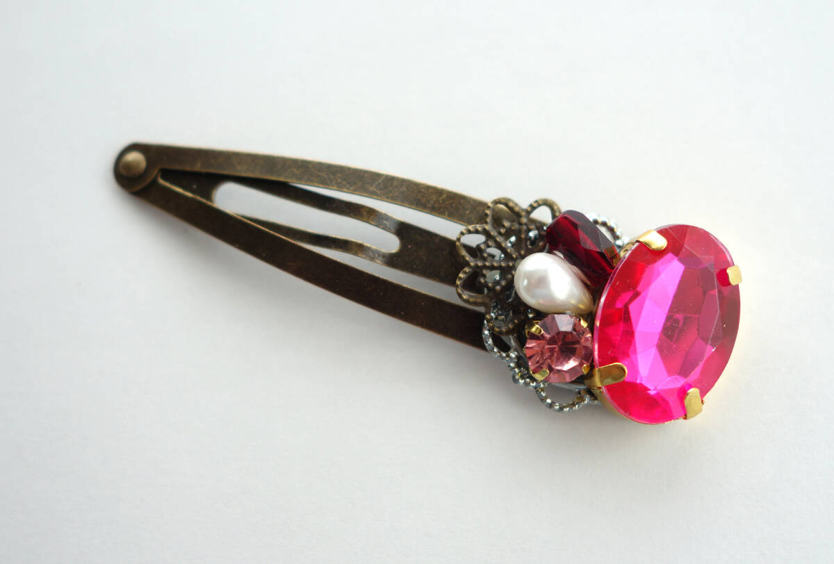 ローズピンクのオーバル型台座付きアクリルビジューとホワイトのドロップ型パールビーズ、ダークレッドのチェコガラスビーズ、ライトピンクの台座付ガラスビジュー、メタルパーツでキラキラビジューパッチンピンを作りました。