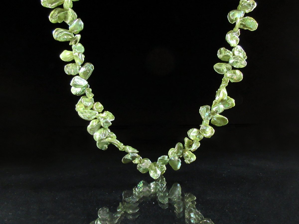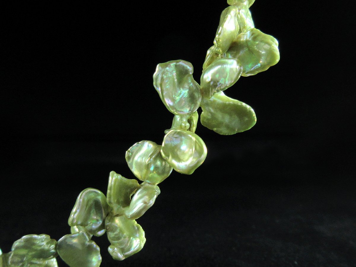 ライトグリーンの光沢のある様々な形の淡水真珠が重なった高級感