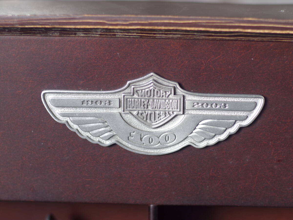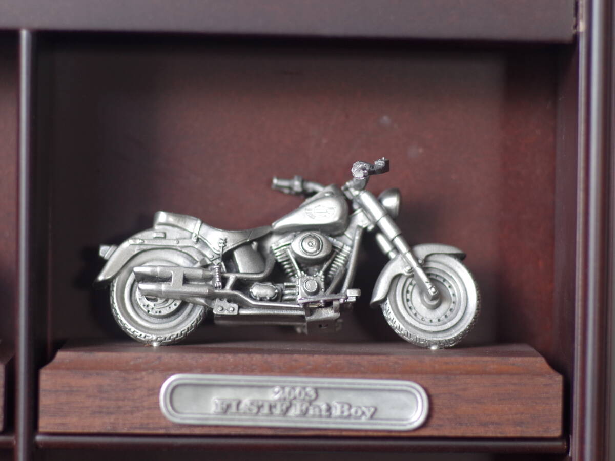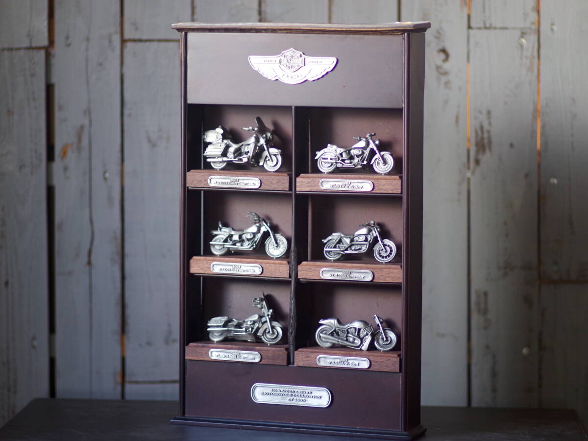 こちらは2003年にHarley-Davidson 100周年を記念して作られたダイカストモデルです。1903-2003年の100年間でハーレーダビッドソンを代表するバイクのダイカスト模型が木製の棚に陳列されています。