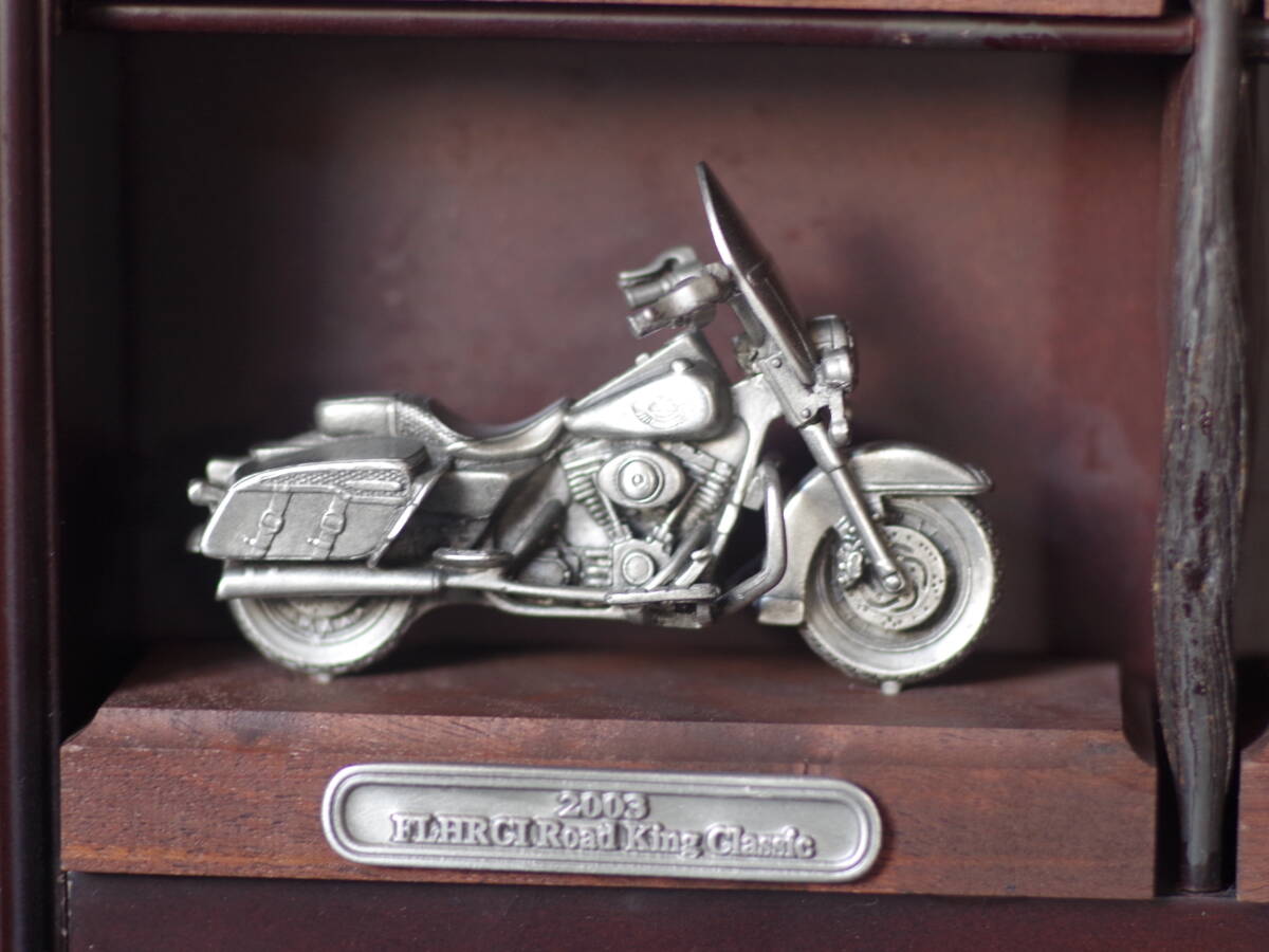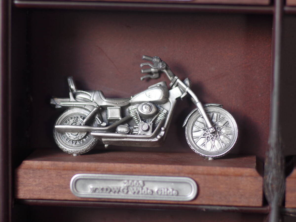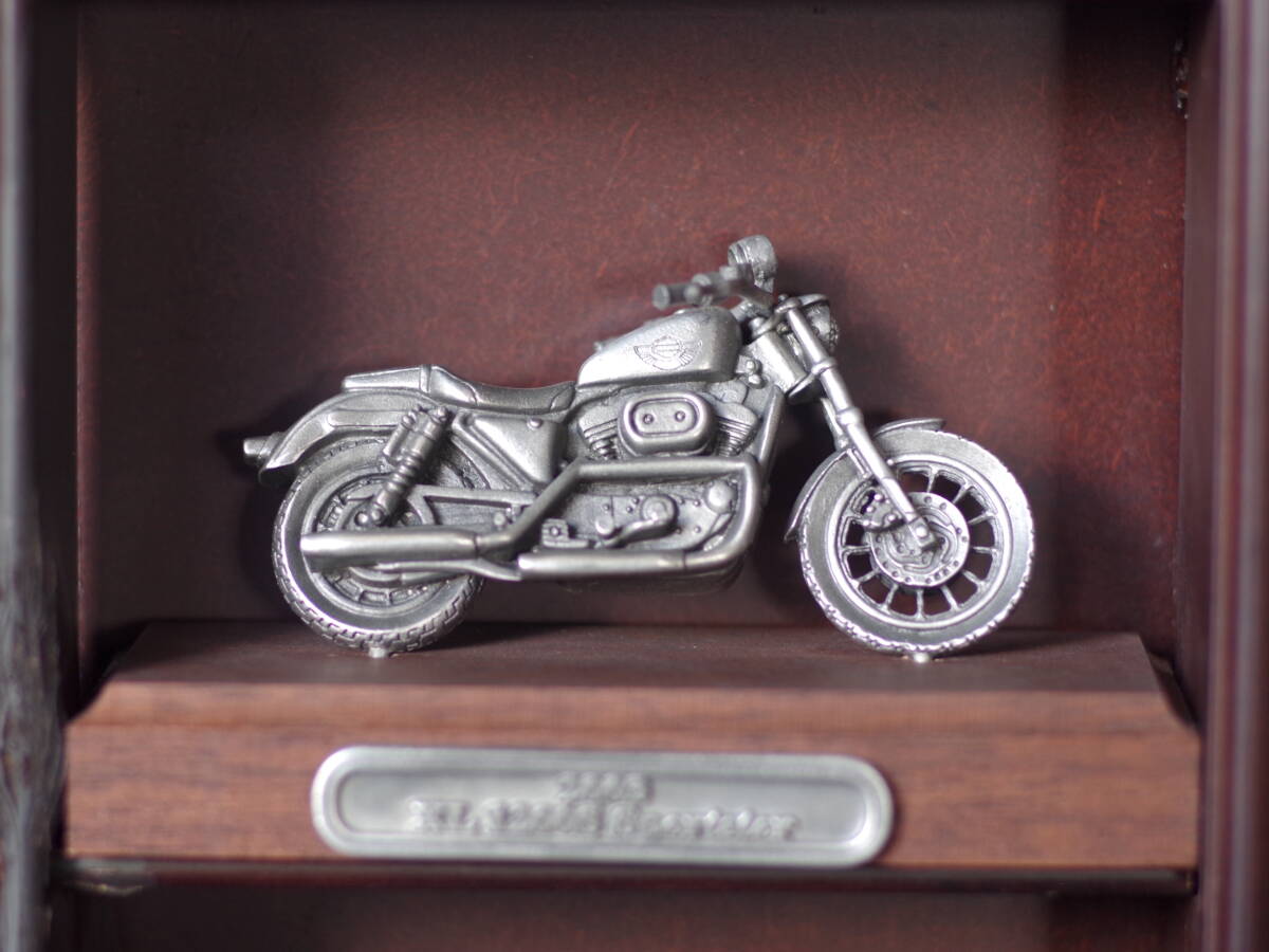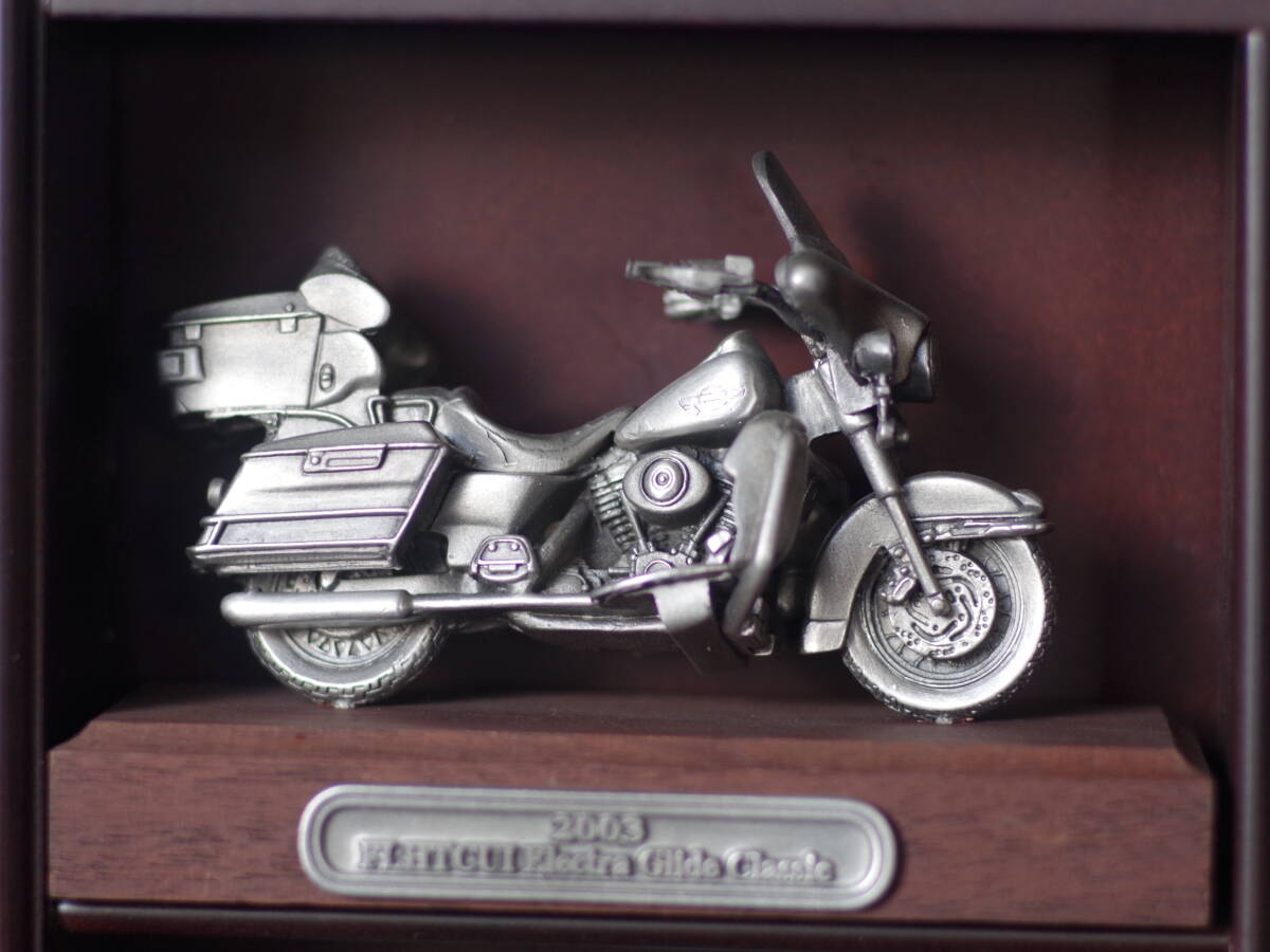 こちらは2003年にHarley-Davidson 100周年を記念して作られたダイカストモデルです。1903-2003年の100年間でハーレーダビッドソンを代表するバイクのダイカスト模型が木製の棚に陳列されています。