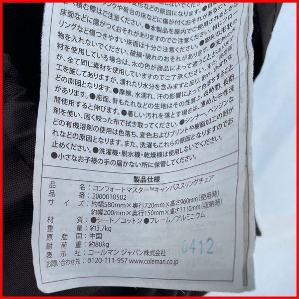 ⑦ 状態良好 Coleman/コールマン 2000010502 コンフォートマスター キャンバススリングチェア(ブラウン)現行モデル 本州限定送料込(JYKE)