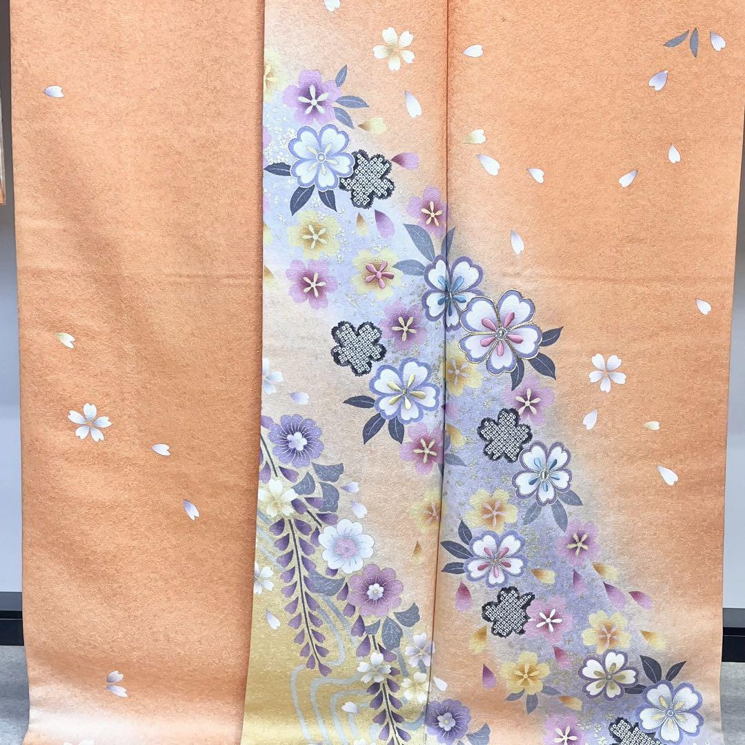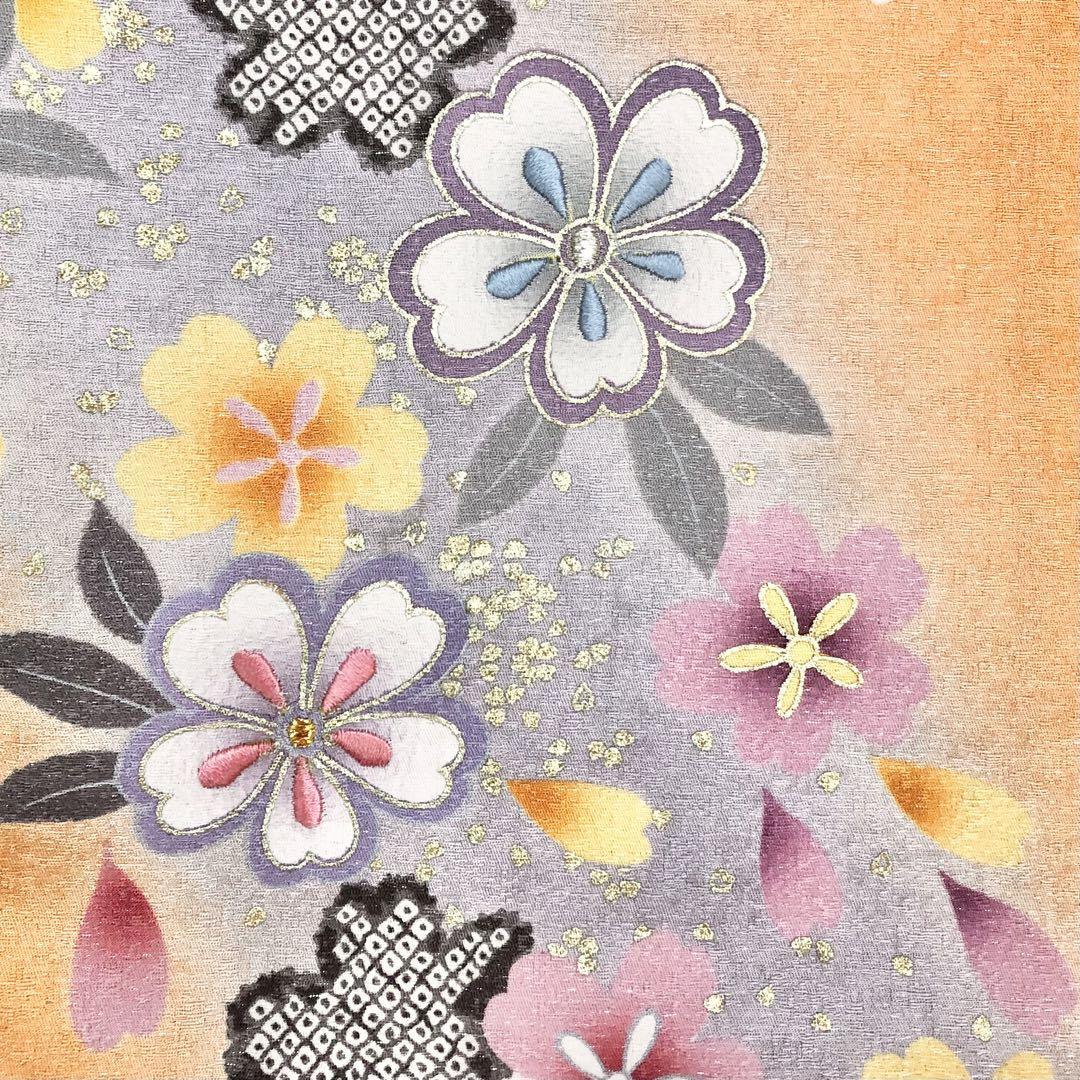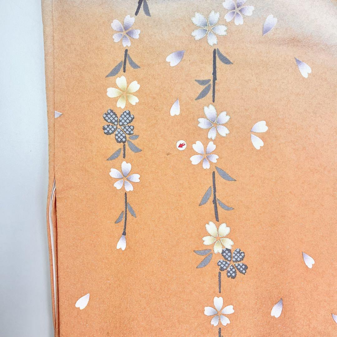 オレンジ色の鮮やかなお色にグラデーション、銀通し、美しい桜の花模様がデザインされた素敵な柄裄のお品でございます。
