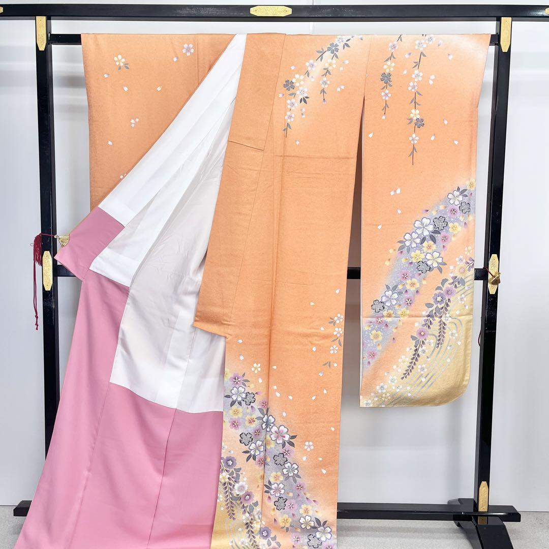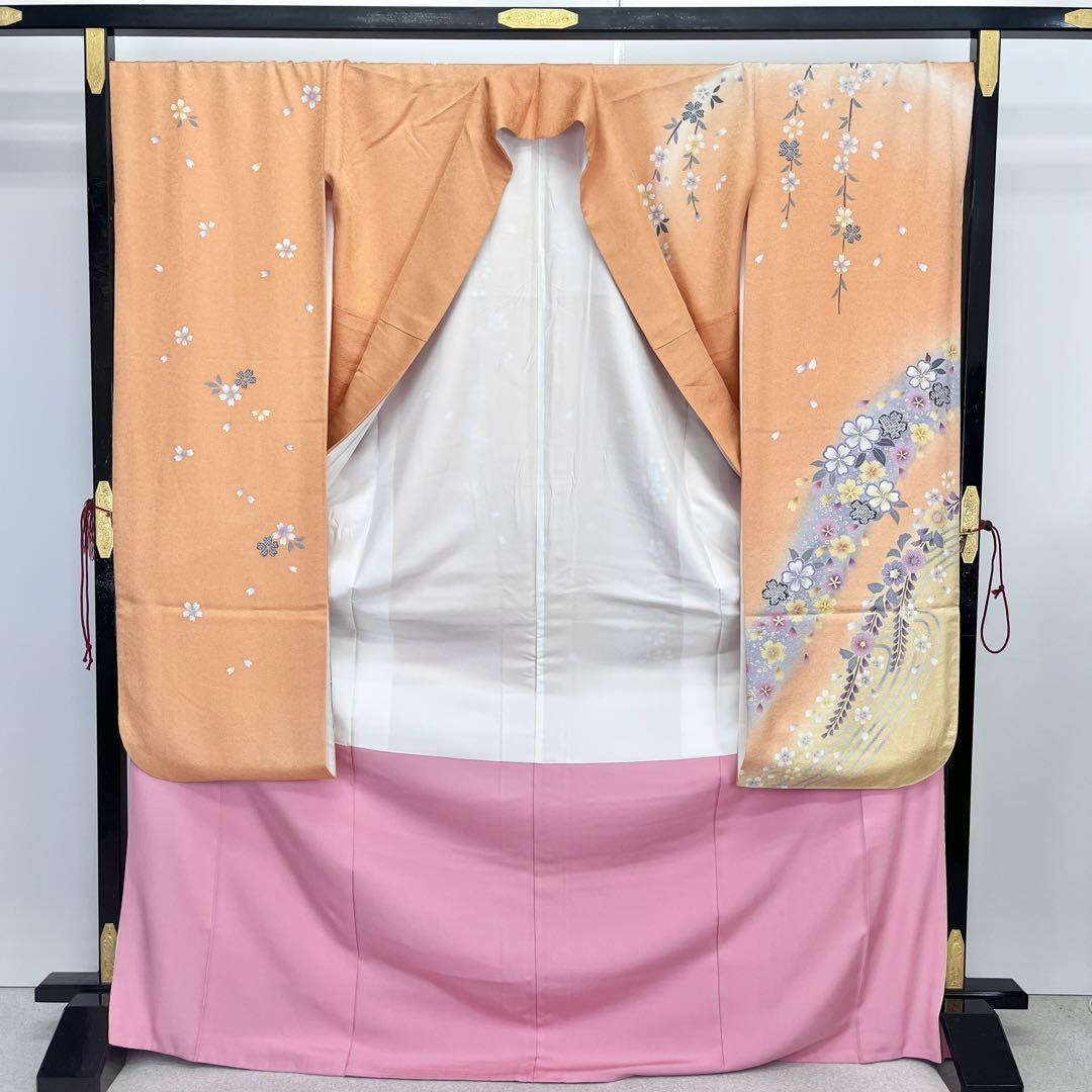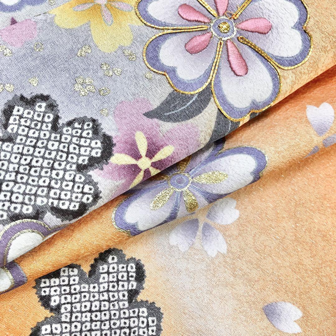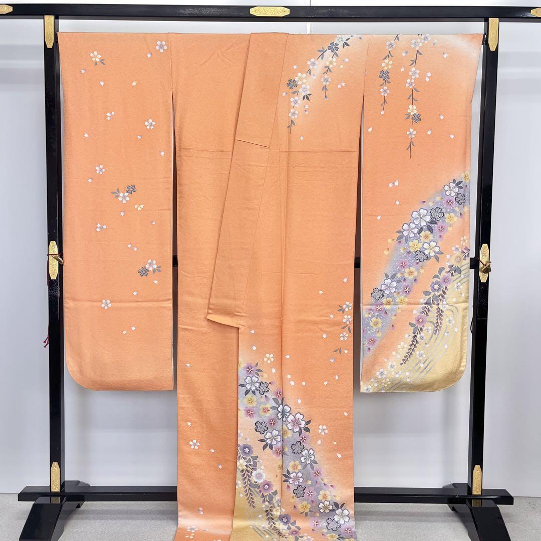 オレンジ色の鮮やかなお色にグラデーション、銀通し、美しい桜の花模様がデザインされた素敵な柄裄のお品でございます。