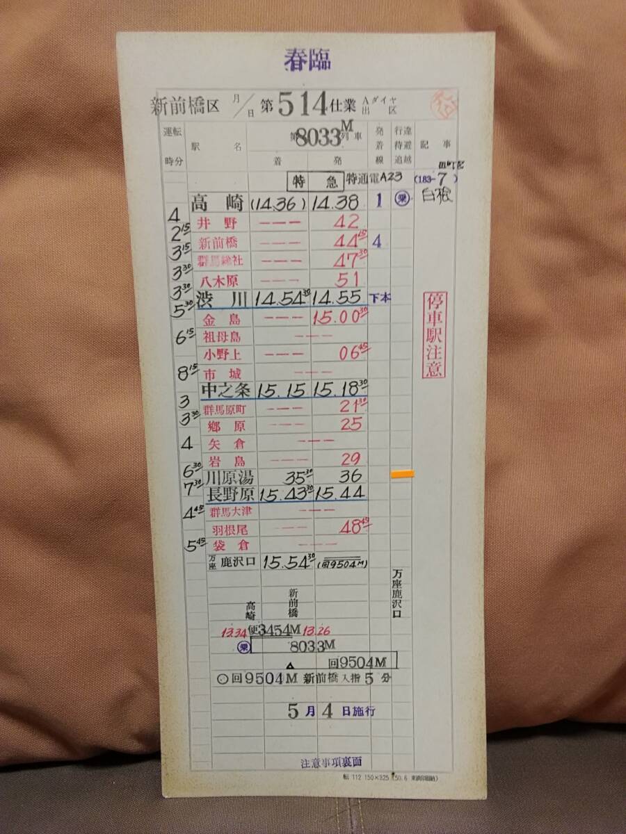 運転士時刻表 スタフ 新前橋電車区 第514仕業 8033M 高崎ー万座・鹿沢口 183系7両 特急白根 田町電車区  をお譲りします。