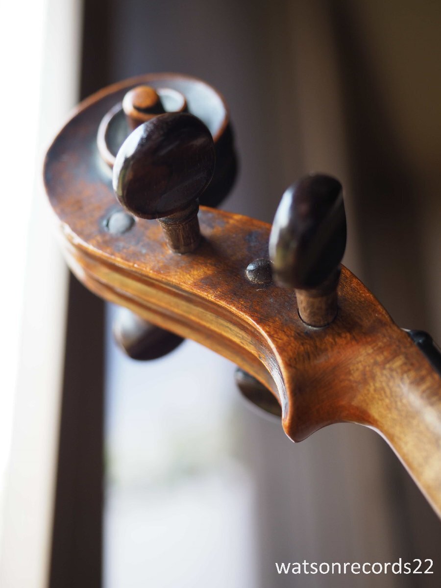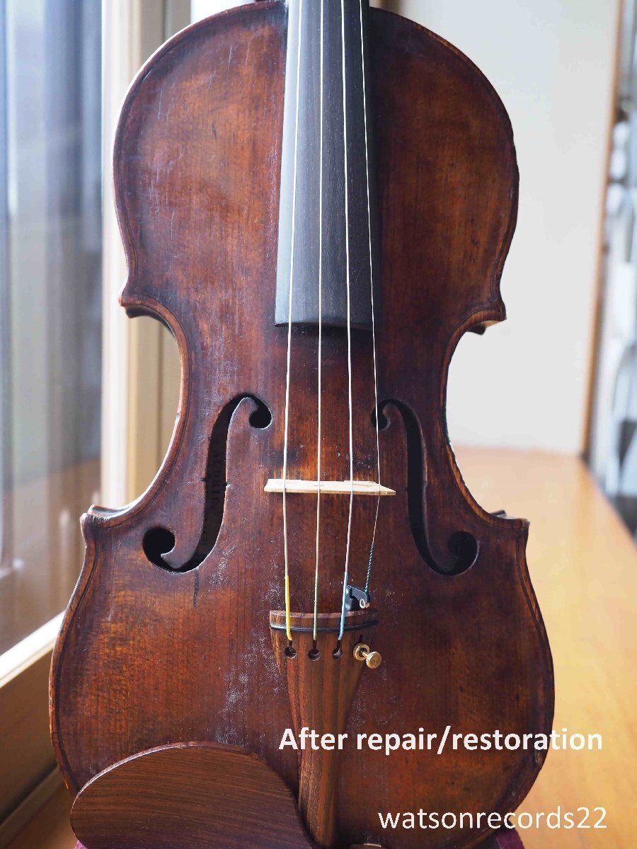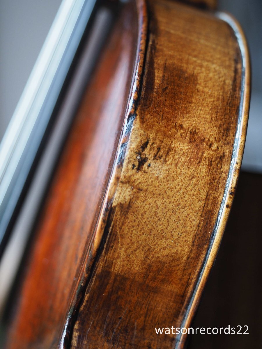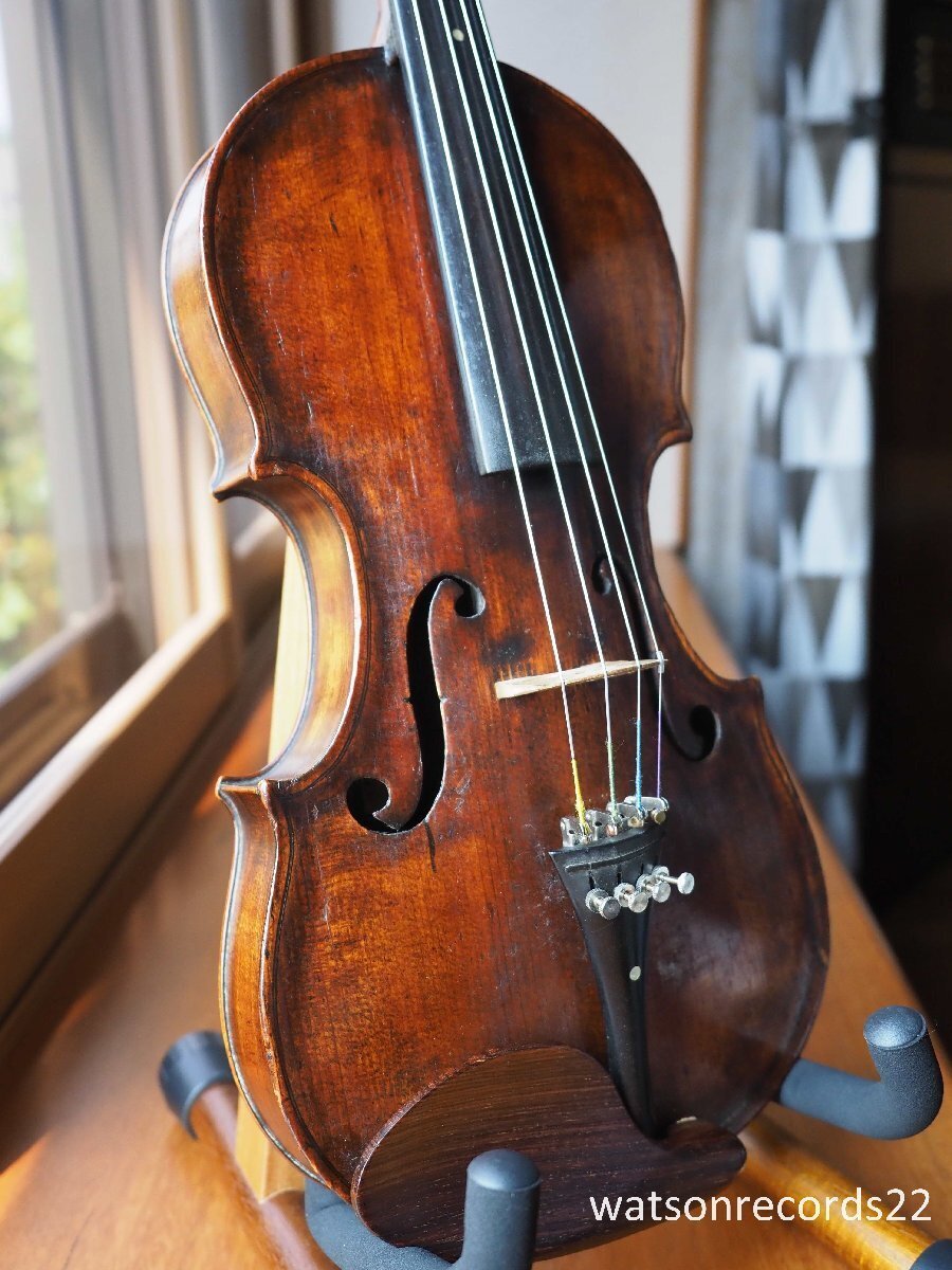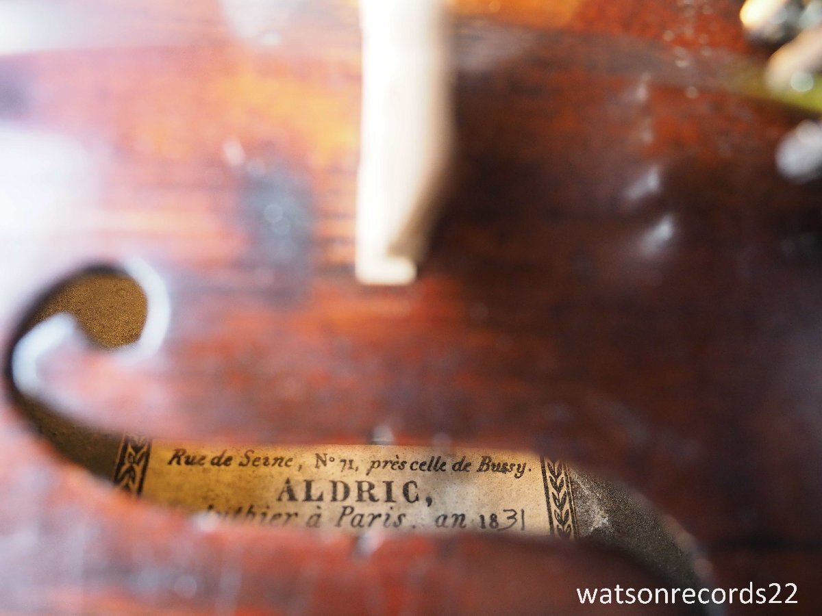 私がフランスでバイオリンの個人コレクターから入手した古い美しいフランスの工房製バイオリンで、ラベルの内側には "Rue de Seine, N°71, prs celle de Bussy, ALDRIC, Luthier Paris, 1831 "と書かれています。このヴァイオリンには、古いミレコート製作者の典型的な黄金色の下地に、非常に美しい濃い琥珀色のニスが塗られており、非常にエレガントなヴァイオリンである。このヴァイオリンには現在も過去もサウンドポストの破損は見られない。木部は美しく、特にバックのニスは際立っている!ボディバックの長さ:35,8cm