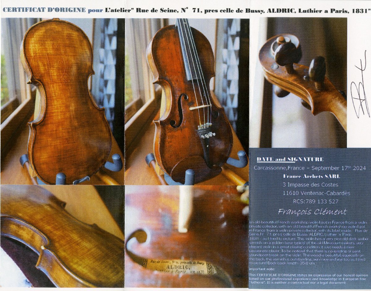 an old beautiful French workshop violin I got in France from a violin private collector, with its label inside: " Rue de Seine, N°71, prs celle de Bussy, ALDRIC, Luthier Paris, 1831 " as I tried to picture. This violin has a very nice old dark amber varnish on a golden base typical of the old Mirecourt makers, very elegant violin in a great playing condition, it just needs a new passionate player. To be noticed that there is no existing or past soundpost break on the violin. The wood is beautiful, especially on the back, the varnish is outstanding, very nice arching too as I tried to picture! Body back length: 35,8 cm.