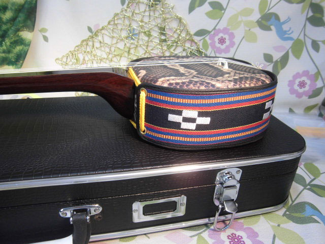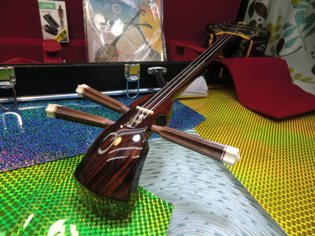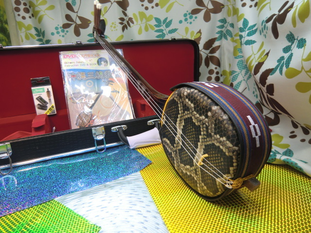 **(送料無料) 59.800円 紫檀沖縄三線人工皮張りとハードケース、DVD付教則本、調弦チューナーセット
