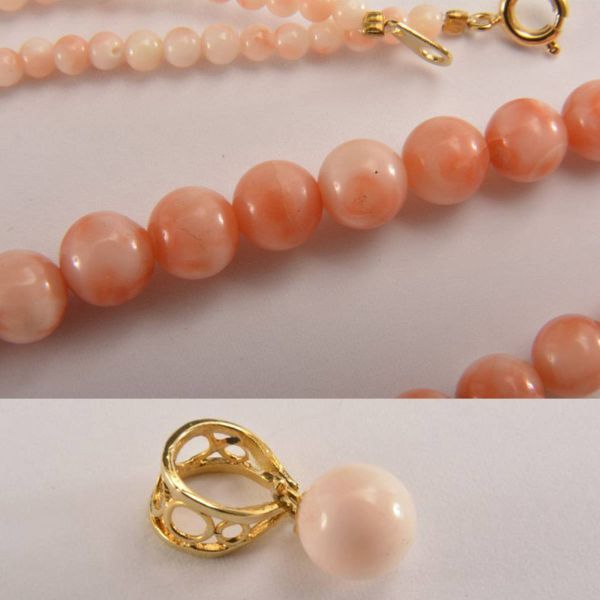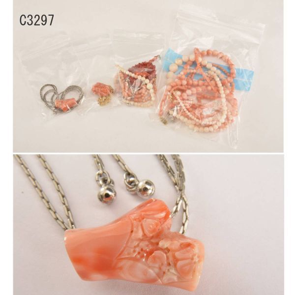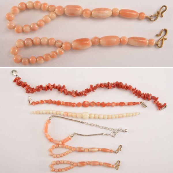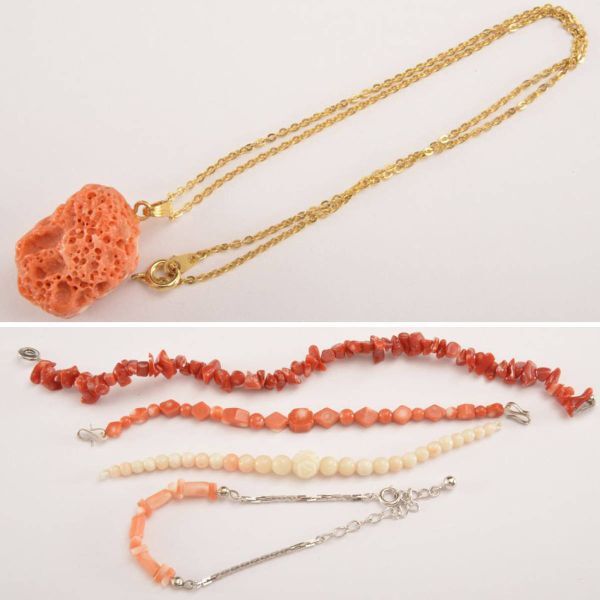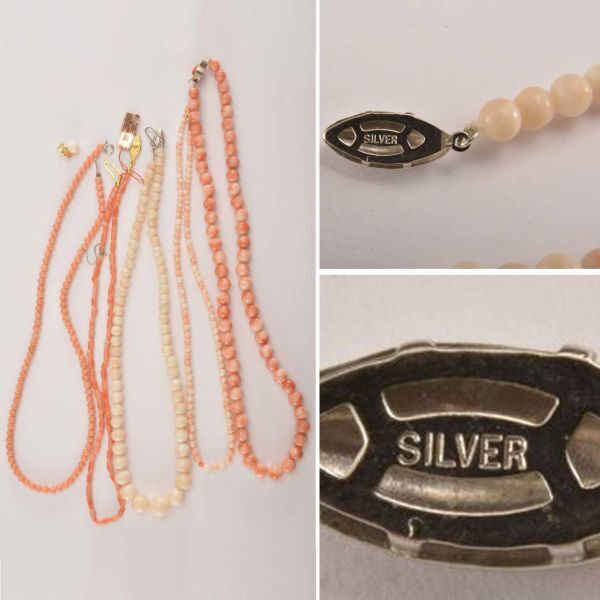 状態:玉型は所々に小さい亀裂あり。他、大体良好。1点は留め金具に「SILVER」の刻印あり。箱無し。サイズはネックレスをご参照下さい。1本は45センチ程。他は大体40センチくらいです。全品サンゴです。