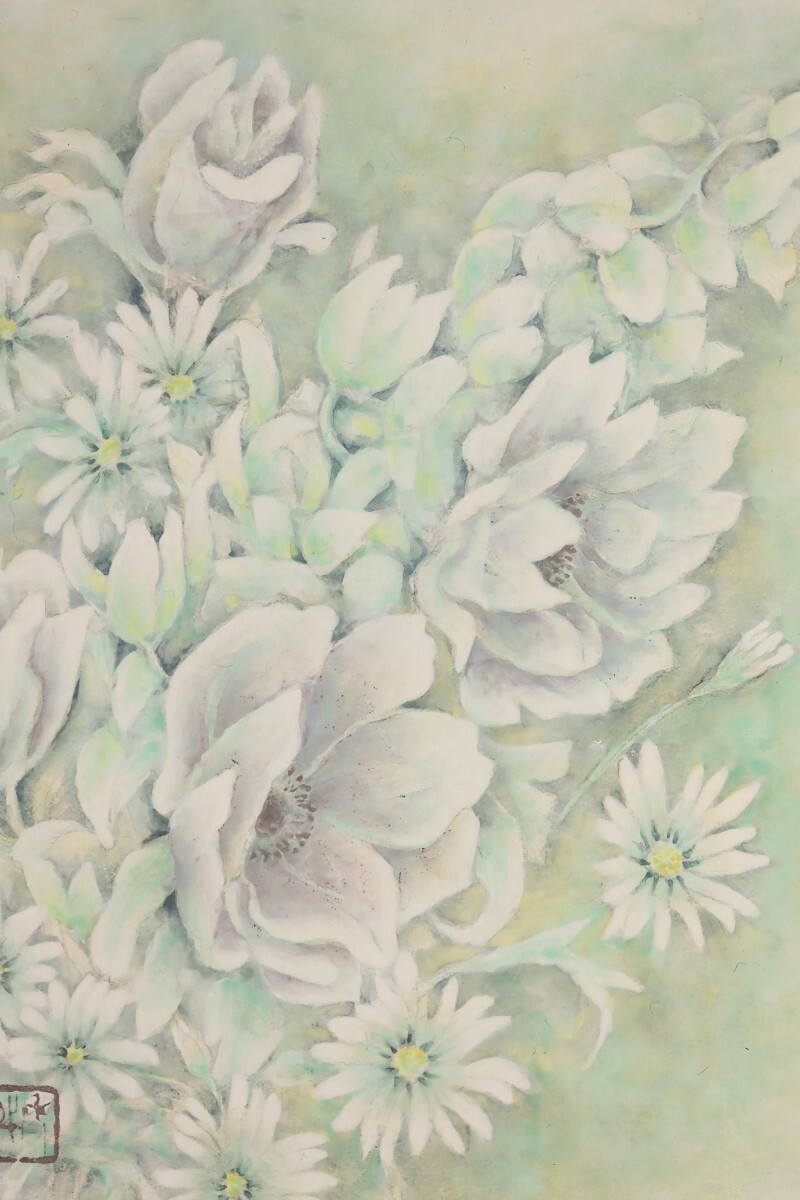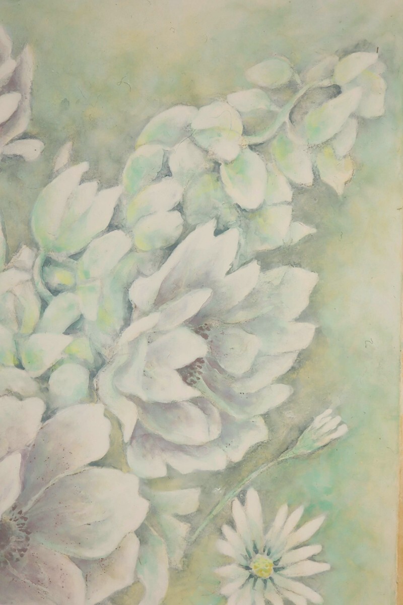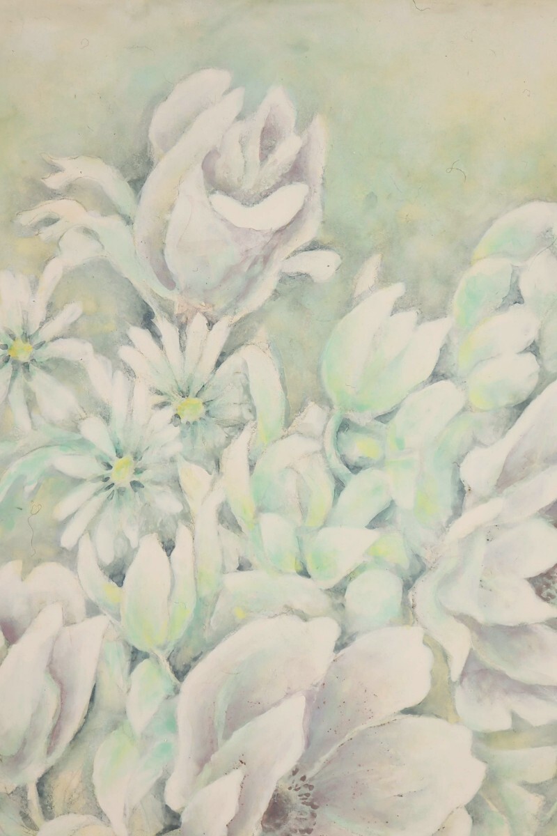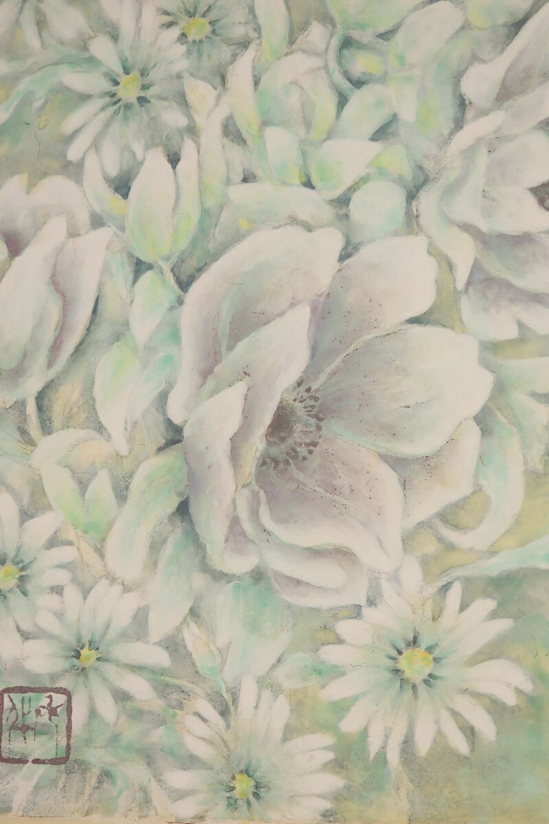 淡く柔らかな色調、幻想的な雰囲気のある花々の作品。