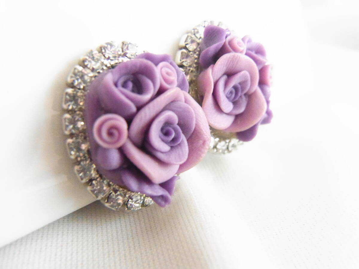 ♪ビンテージ/ヴィンテージ 紫色 パープルトーンのセルロイド?のような素材のお花をクリアラインストーンが囲み輝く レトロイヤリング