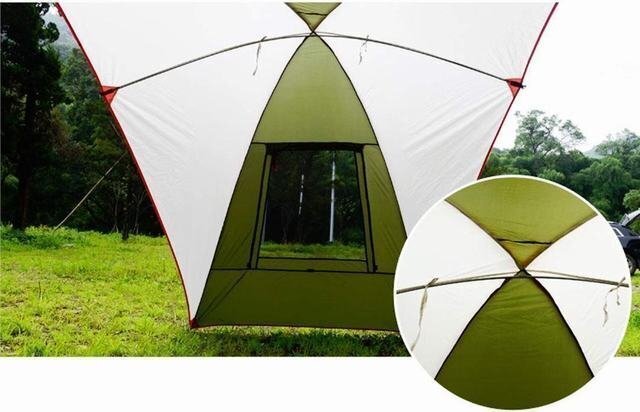 初心者でも簡単に組み立てるキャンプタープです。シートを広げて、フレームで固定して、車もしくは近くの木などに縛って、簡単に設営できます。