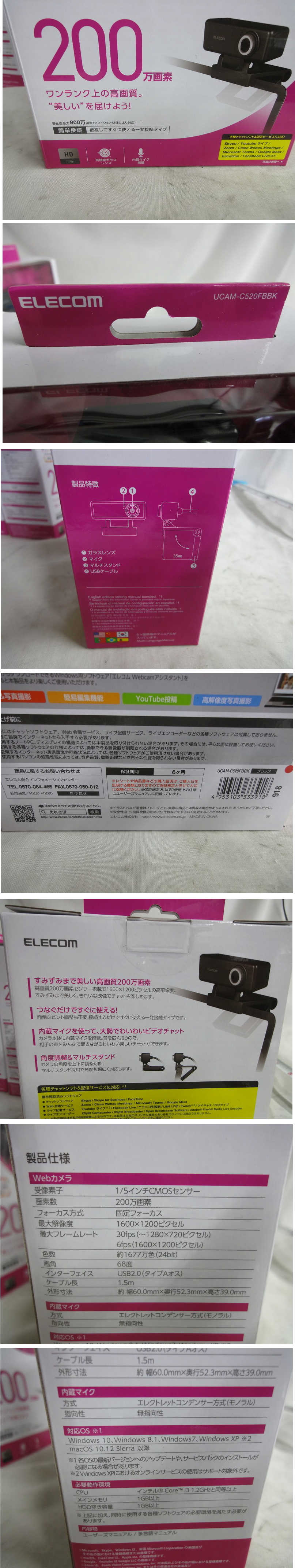 | 商品名 | Kムも1707 新品 ELECOM ウェブカメラ UCAM-C520FBBK HD PC周辺機器 高画質 200万画素 マイク内蔵 映像機器 計4点セット |