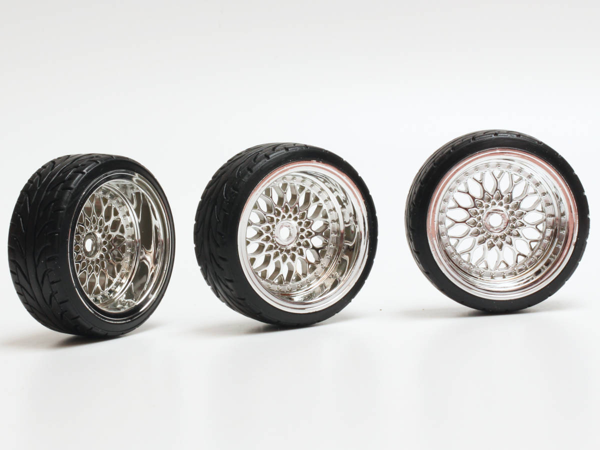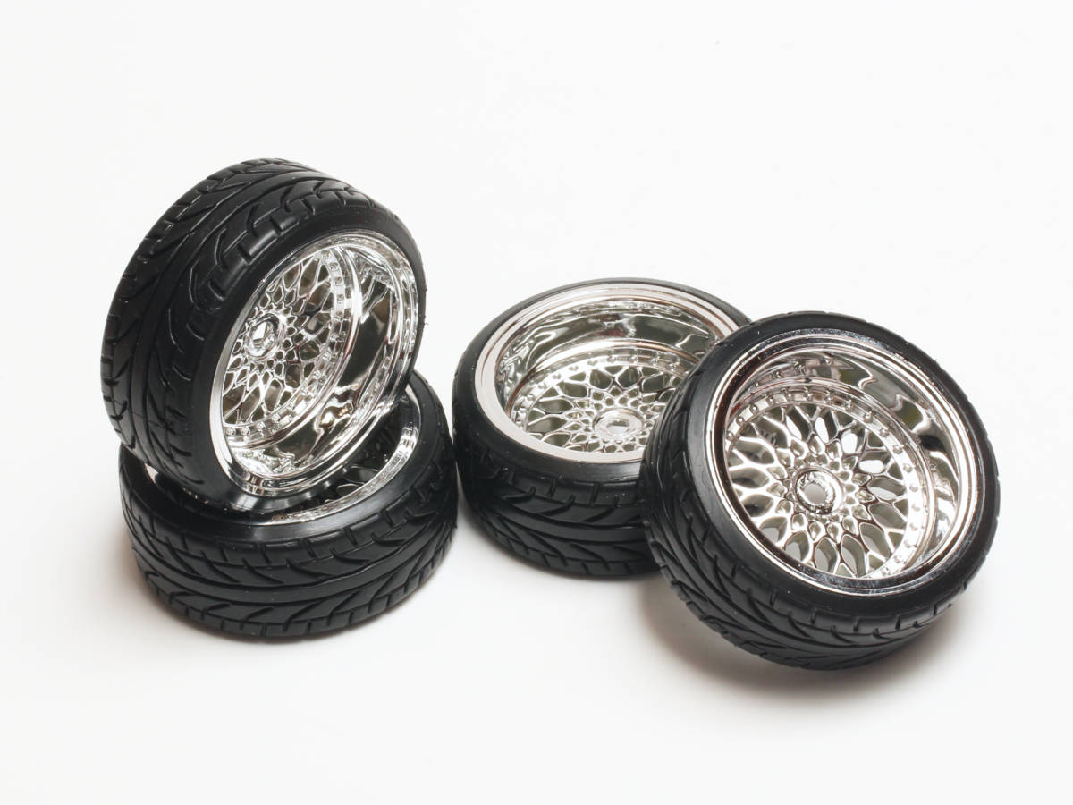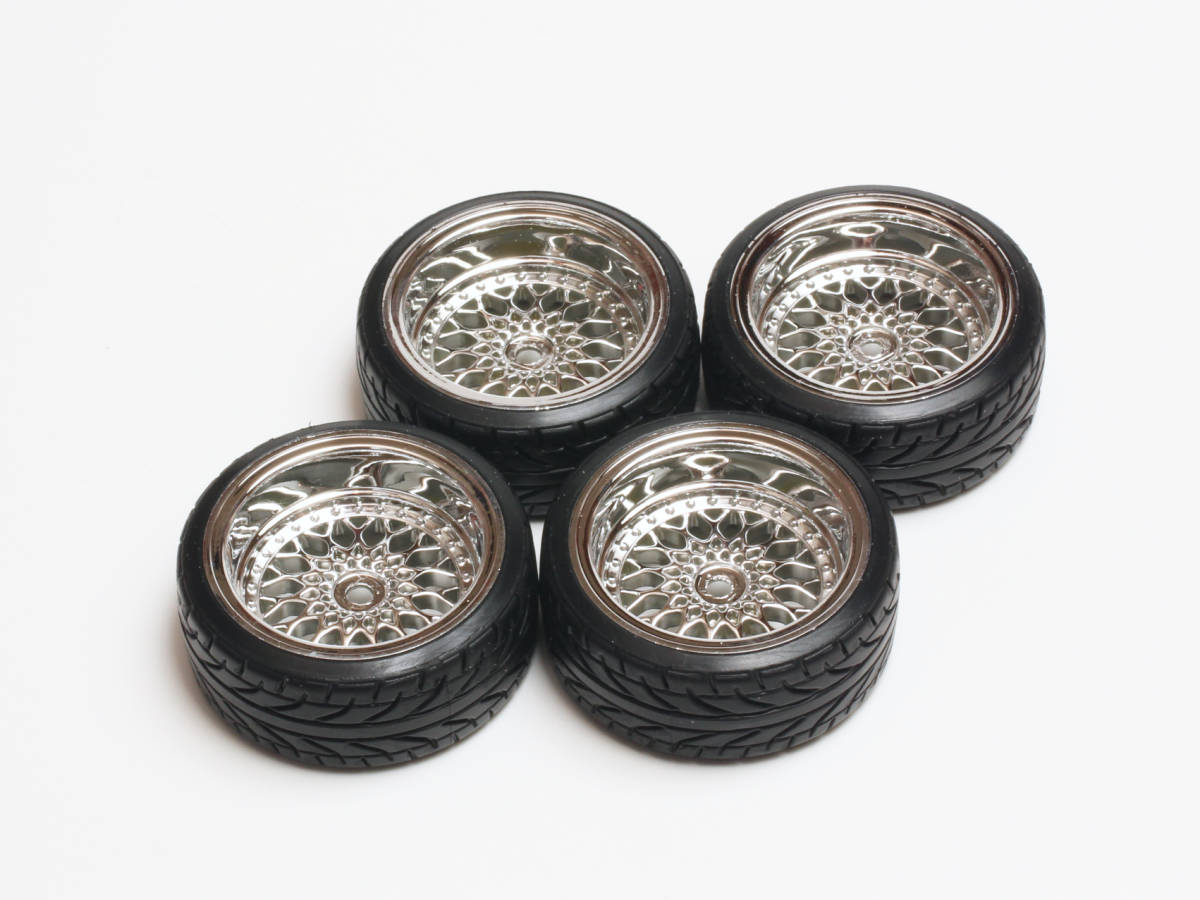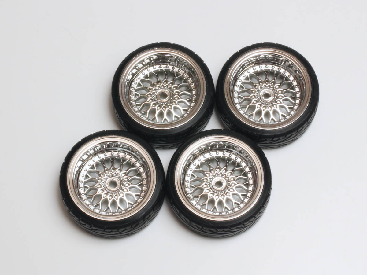 1/10 ドリフト カー用 ハードタイヤ組込み済み シルバーメッシュ超激深リムホイール4本セットです。