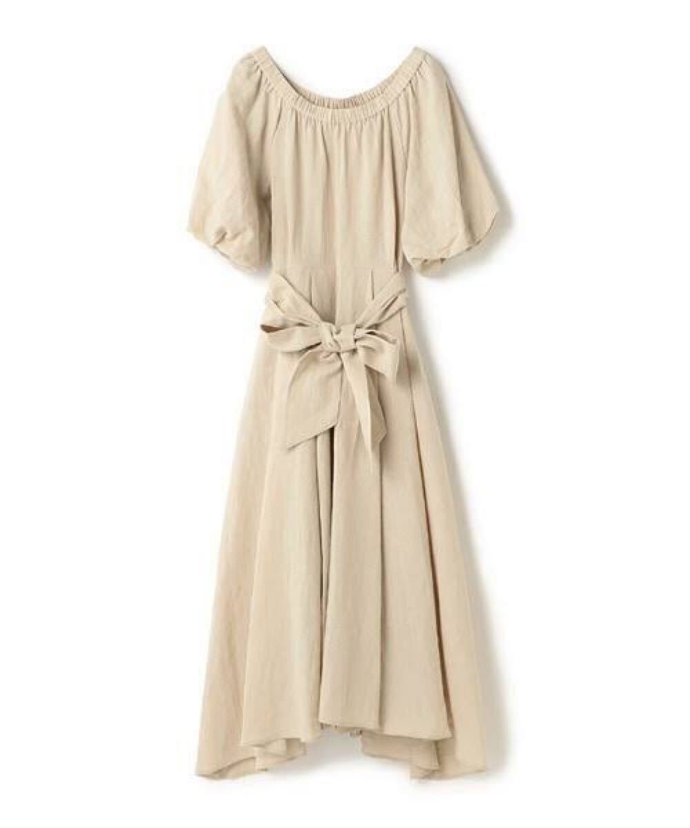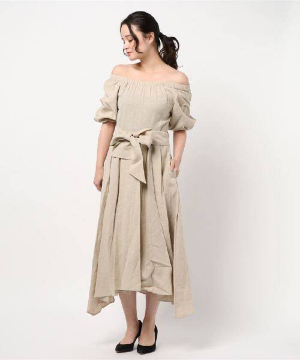 オフショルとして着られる2WAYデザインで今季注目の女性らしいデコルテラインの骨見せも叶うアイテム。落ち着いた色味なので、メイクやアクセを変えることで様々なシーンに対応します。キャップやスニーカーと合わせてカジュアルに着こなすのもおすすめ。また、スカート部分には裏地がついているので透ける心配もありません。共布ベルト付きでウエストマークすればメリハリのあるコーディネートに。ロング丈ワンピースは着るだけでこなれ感を演出。たっぷりと生地を使ったバルーンスリーブはフェミニンさを表現しました。ネックレスやアクセサリーなど小物使いしやすくお出掛けシーンにおすすめです。