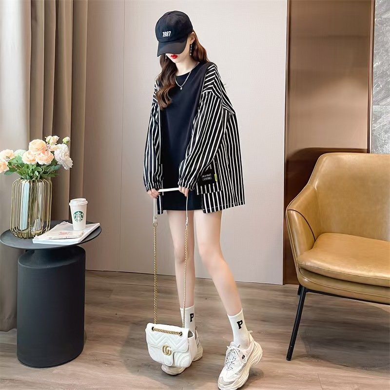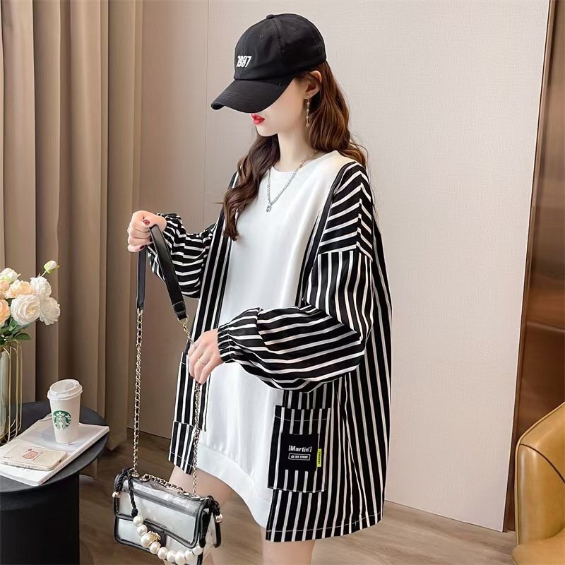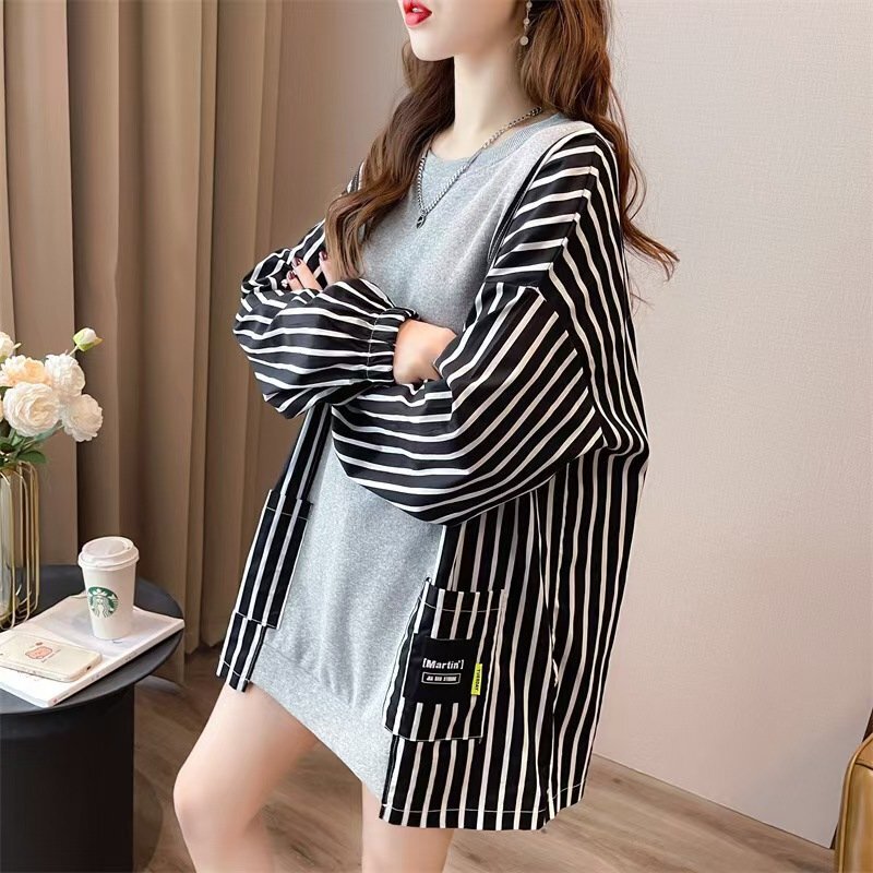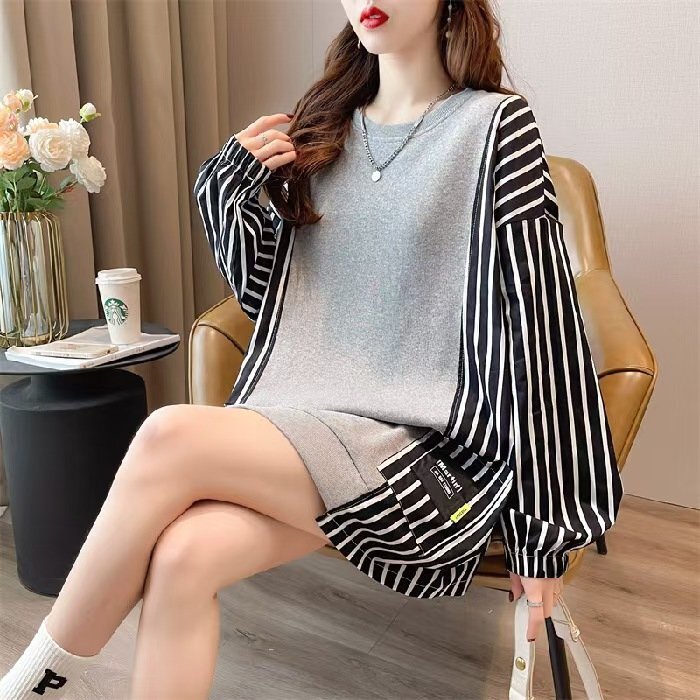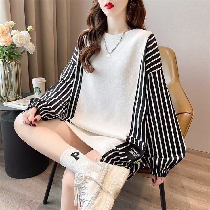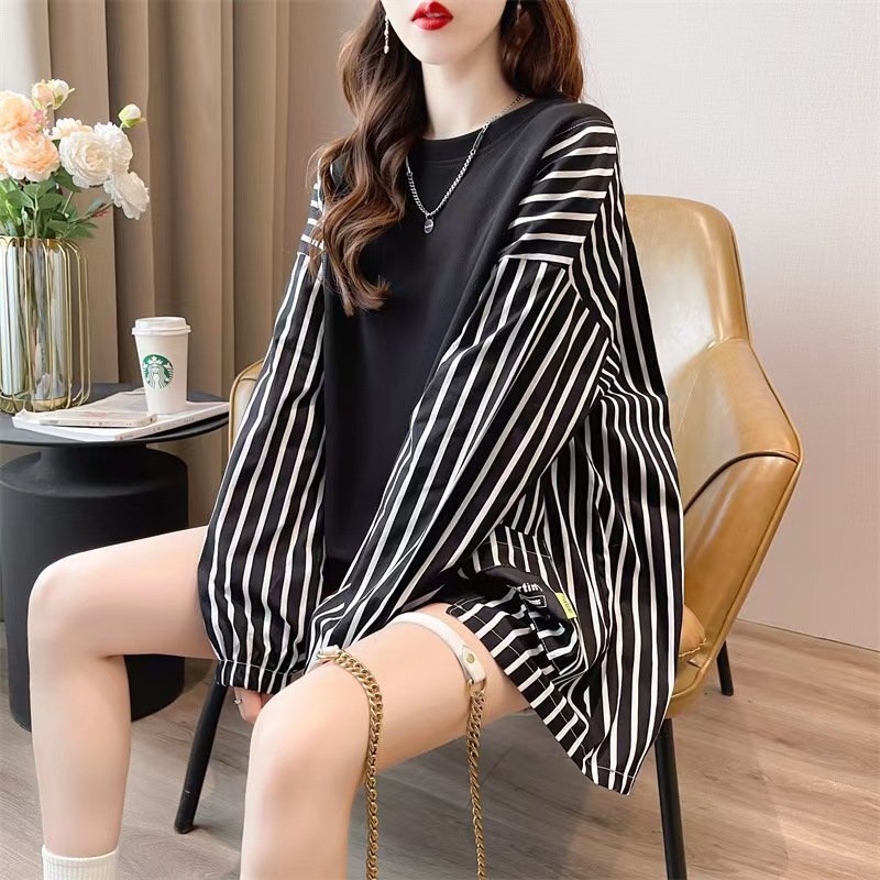 LRM5325★トレーナー トップス 切り替え 薄手 ストレイプ柄 体型カバー カジュアル 春秋 レディース ゆったり