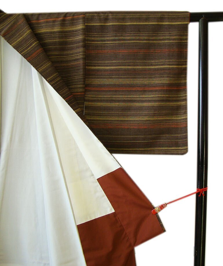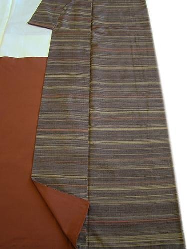 | 商品説明 | こちらのお品は「袷」ですので10月から5月までお召頂ければと思います。 しなやかな紬は、着易く動きも軽く、着くずれしない腰の強さを併せ持った お洒落着としていつでもどこへでもお気軽にお愉しみ頂けご愛用頂けるお品です。 とてもしなやかな肌触りも心地よいふっくらとした真綿紬地は、 渋い赤墨色地に赤茶色等の横段柄の織柄、 八掛は栗皮茶色(正絹)と、幅広い年代の方にお召し頂けます。 |