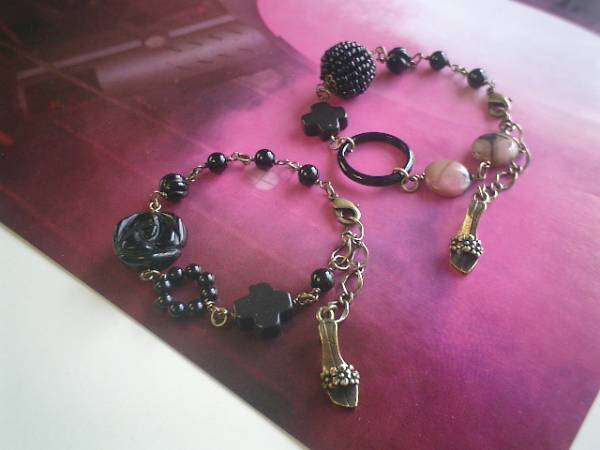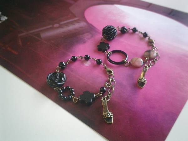 秘めた想い・・シリーズです♪夜の薔薇をイメージして・・シックなオニキスとロードナイトのブレスレット2本セットです♪左側のブレスレットは4ミリの丸玉のリング、6ミリの丸玉、8ミリのSライン、12ミリのクロスのオニキスに18ミリのブラックオブシディアンの薔薇を合わせて可憐な表情です♪長さは全長23センチ位で調節自由です♪右側のブレスレットは10ミリのコインのロードナイトに8ミリのSライン、6ミリの丸玉、12ミリのクロスのオニキス、15ミリのビーズボールを合わせて大人のロマンチックしています♪長さは全長23センチ位で調節自由です♪それぞれ単品でも出品しています♪お揃いのネックレスも出品しています♪♪シンプルで長く着けていただけるデザインを考えて作りました♪♪ハンドメイドをご理解頂いてノークレーム、ノーリターンでお願いします。