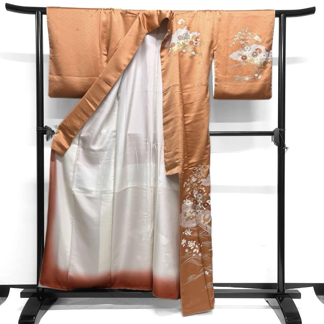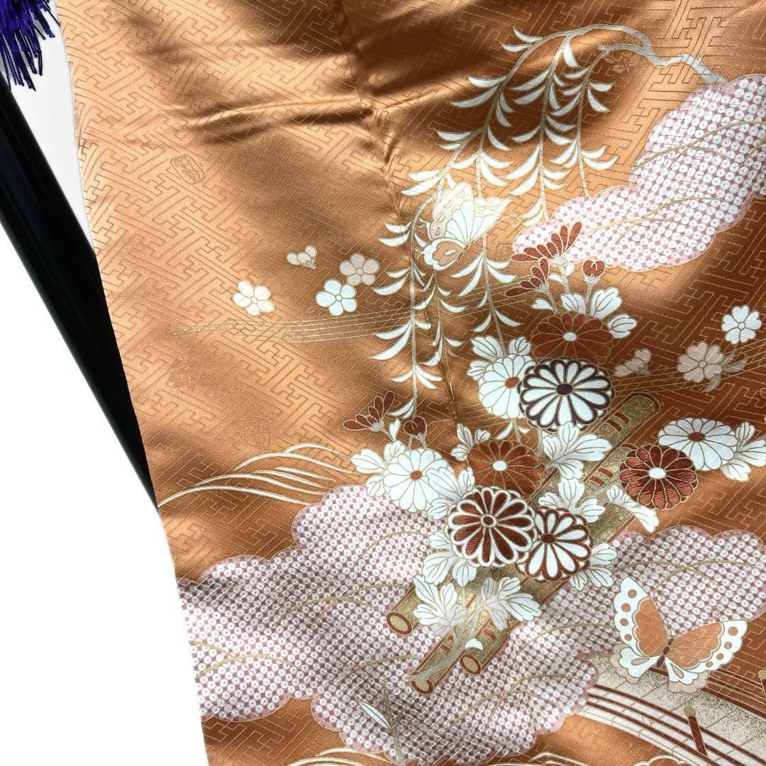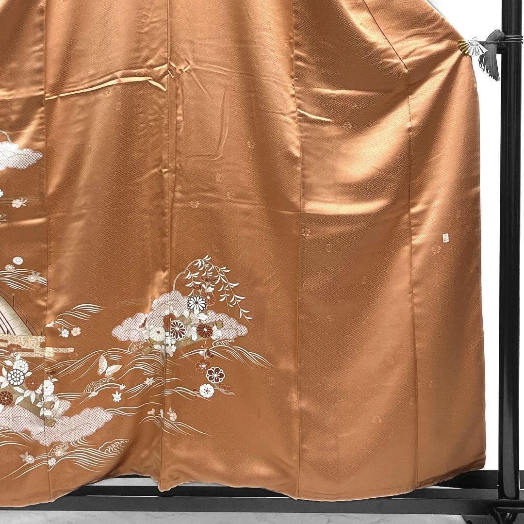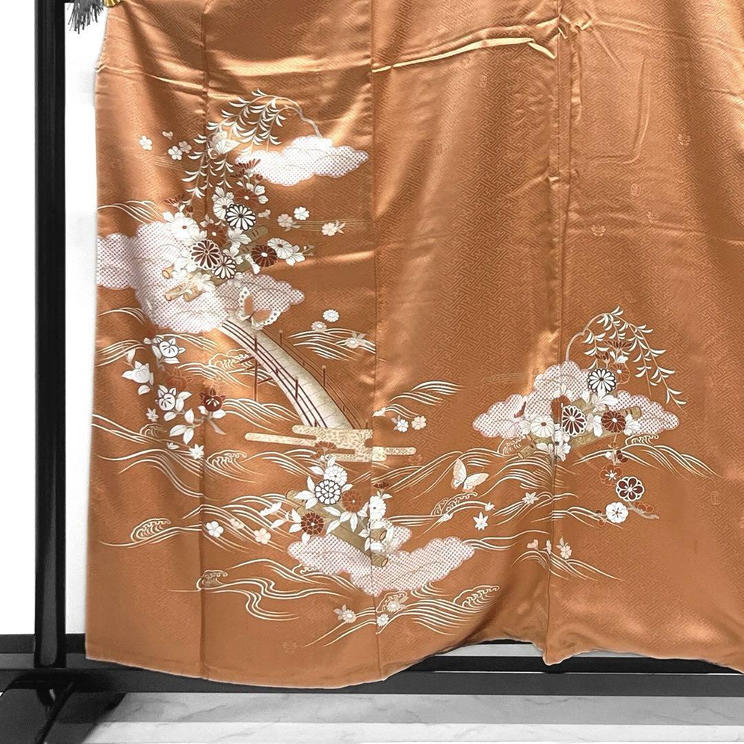 紗綾形地紋の光沢のあるオレンジ地に波に八橋、鹿の子の雲、蝶に菊や牡丹が金彩を交えて描かれた華やかな一着です。