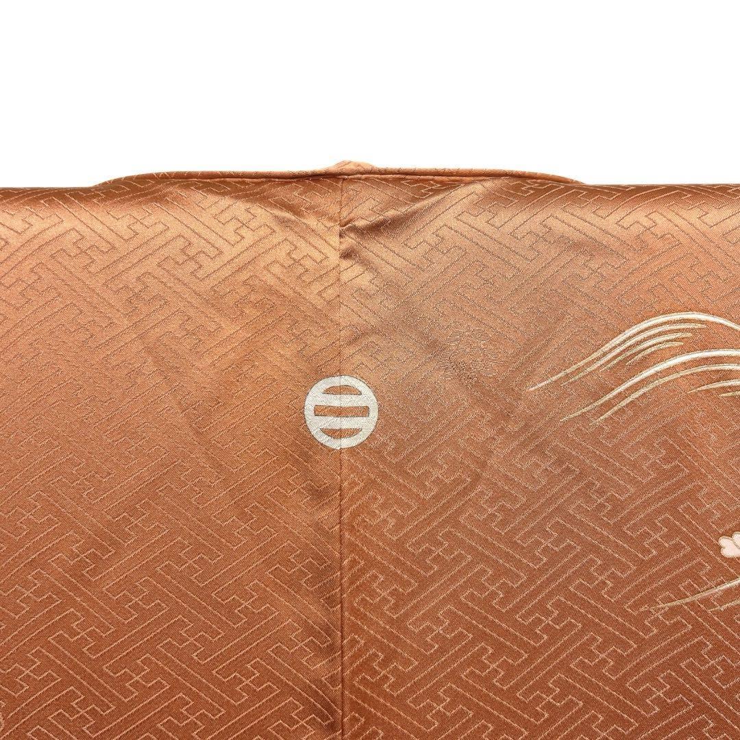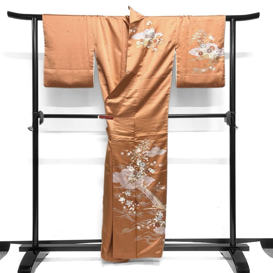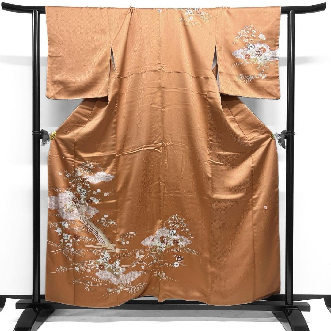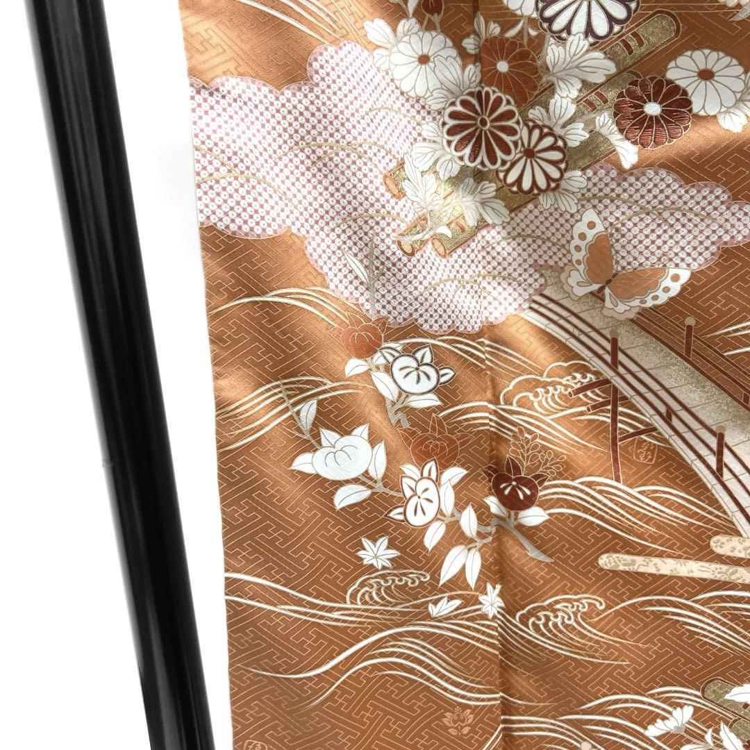 紗綾形地紋の光沢のあるオレンジ地に波に八橋、鹿の子の雲、蝶に菊や牡丹が金彩を交えて描かれた華やかな一着です。