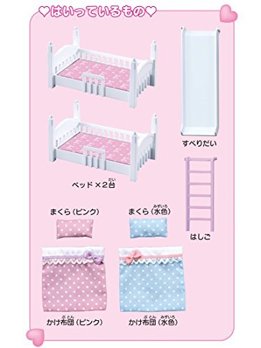 2だんベッド・ top1-ds-1388586・(C) TOMY・対象年齢 :3才以上ミキちゃんとマキちゃんの2段ベッドが登場です。 はしごとすべり台をセットできます。掛布団と枕が付いてるよ!