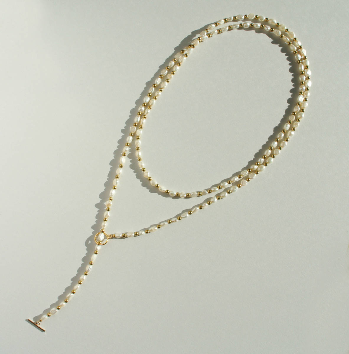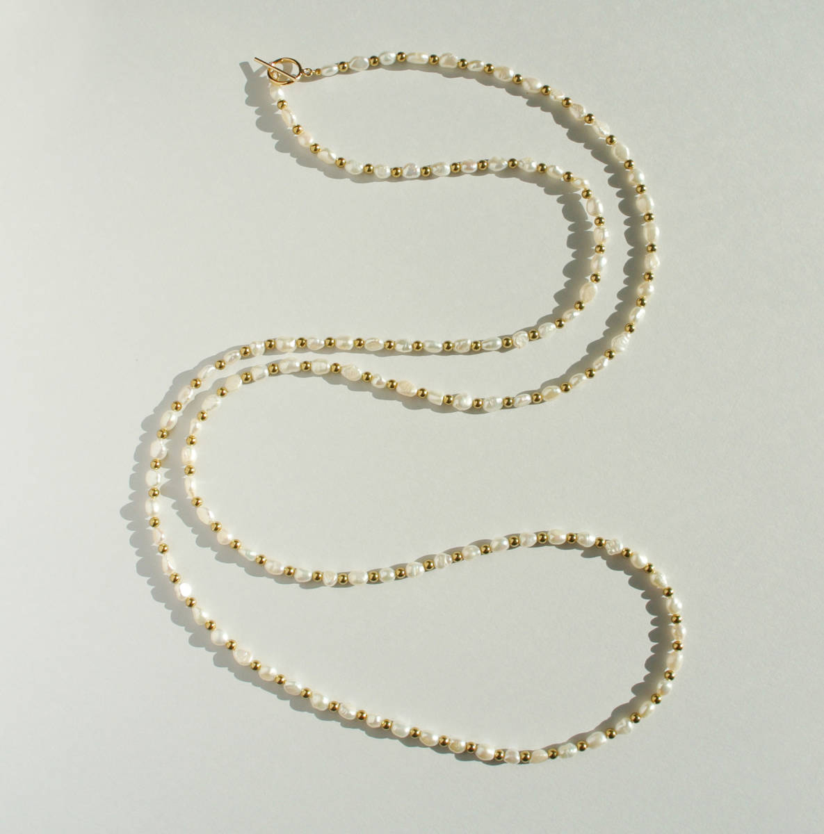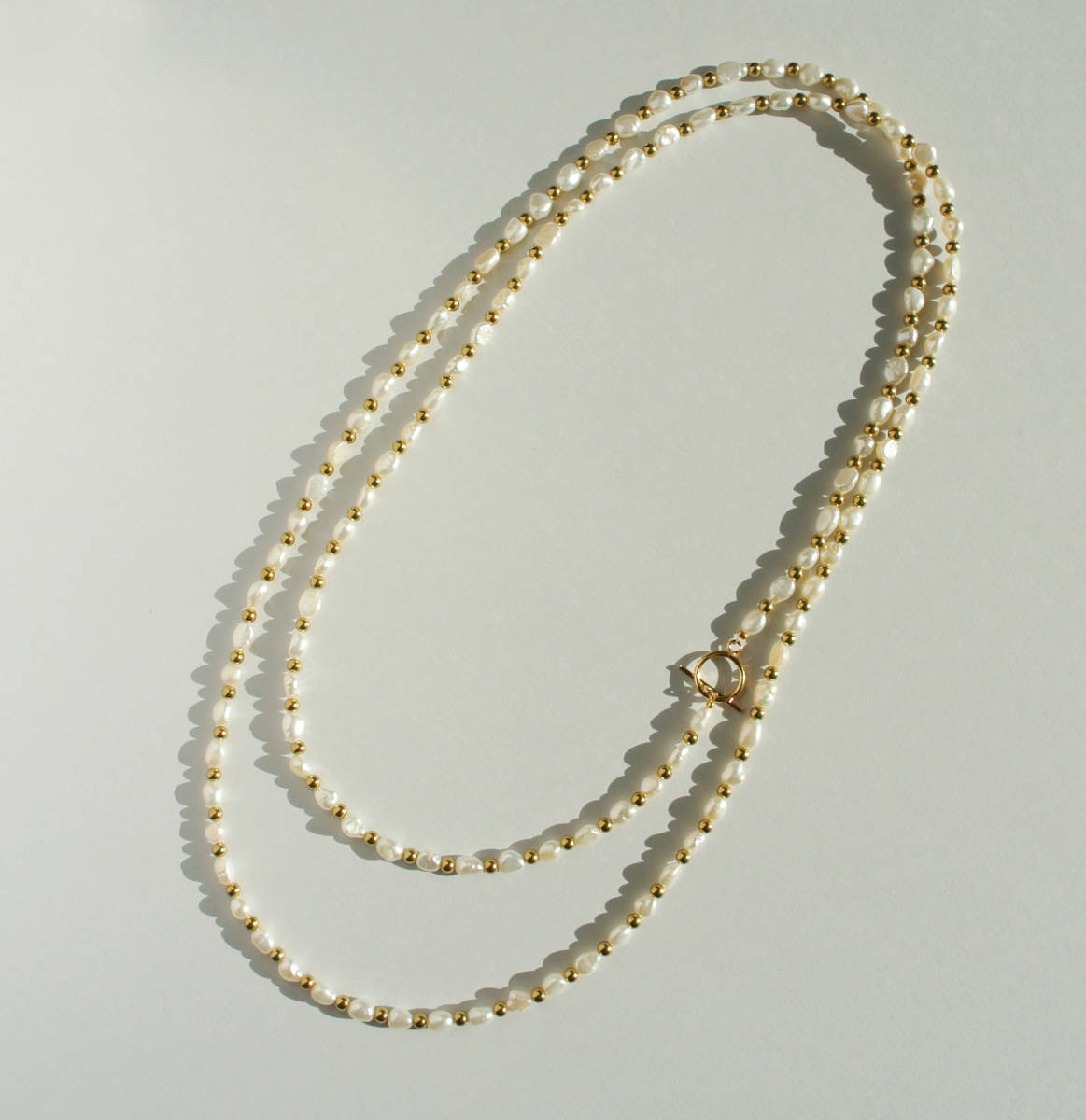 ホワイトの淡水バロックパールと真鍮丸ビーズのロングネックレスです。