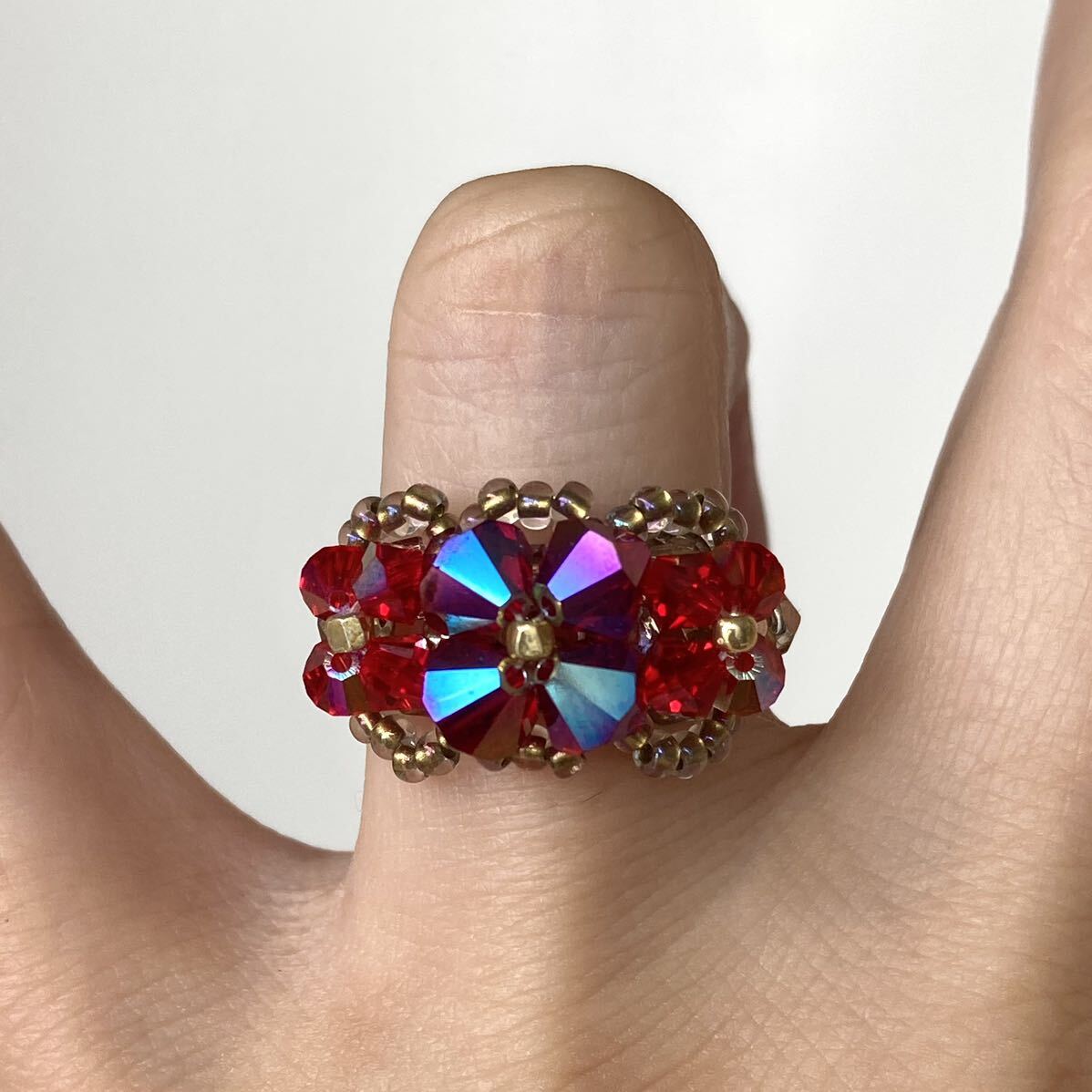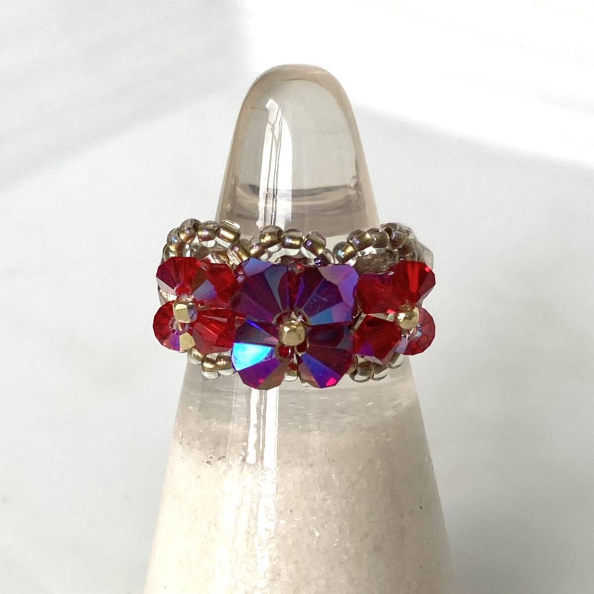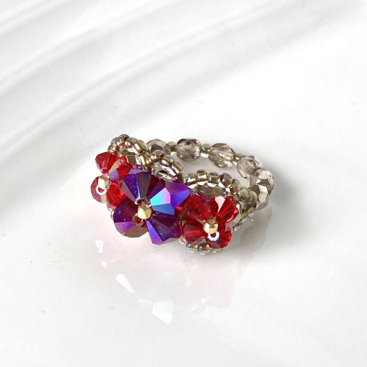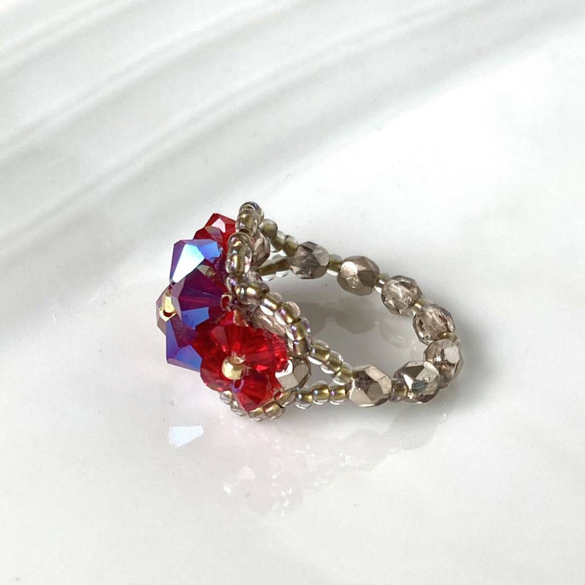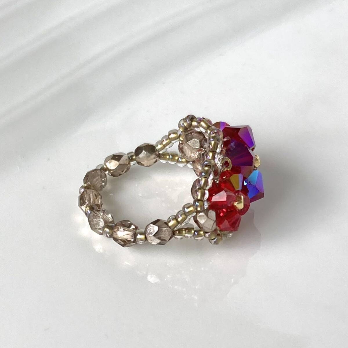 5mmの濃いピンクのスワロフスキー、4mmの赤のスワロフスキー、4mmのクリスタルセルシアンのチェコビーズ、ゴールドのスリーカットビーズ、クリアゴールド系の丸小ビーズで作ったリングです。