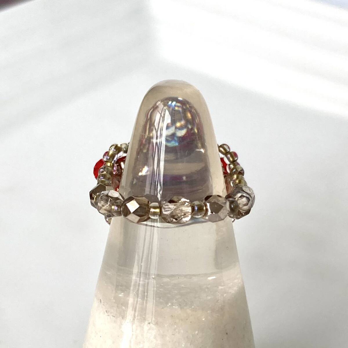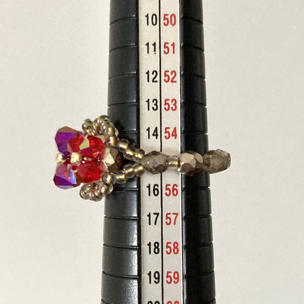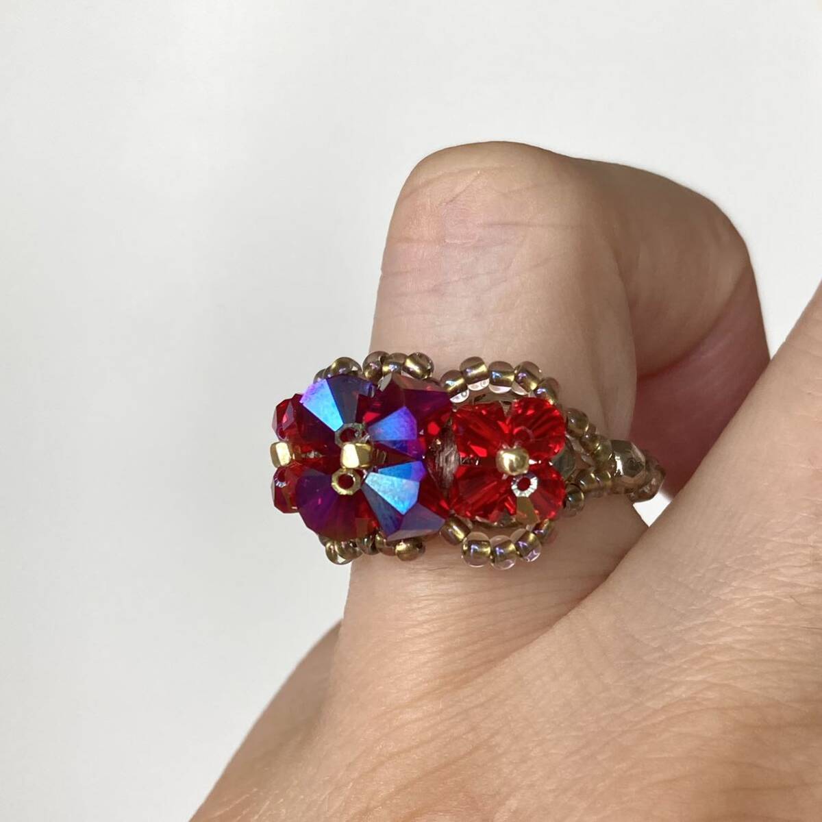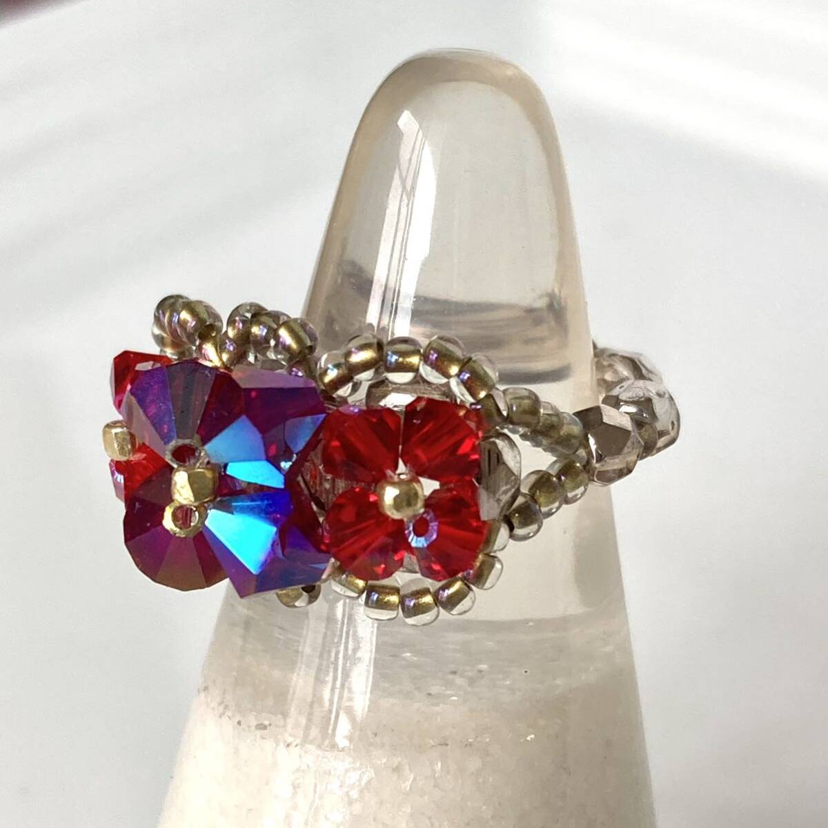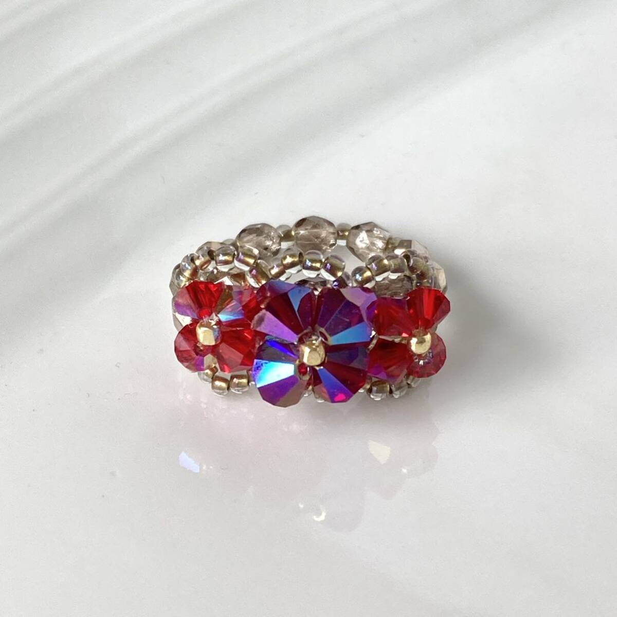 5mmの濃いピンクのスワロフスキー、4mmの赤のスワロフスキー、4mmのクリスタルセルシアンのチェコビーズ、ゴールドのスリーカットビーズ、クリアゴールド系の丸小ビーズで作ったリングです。