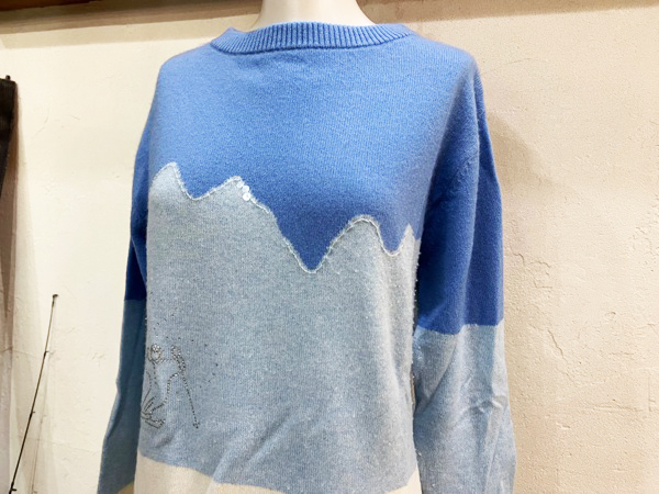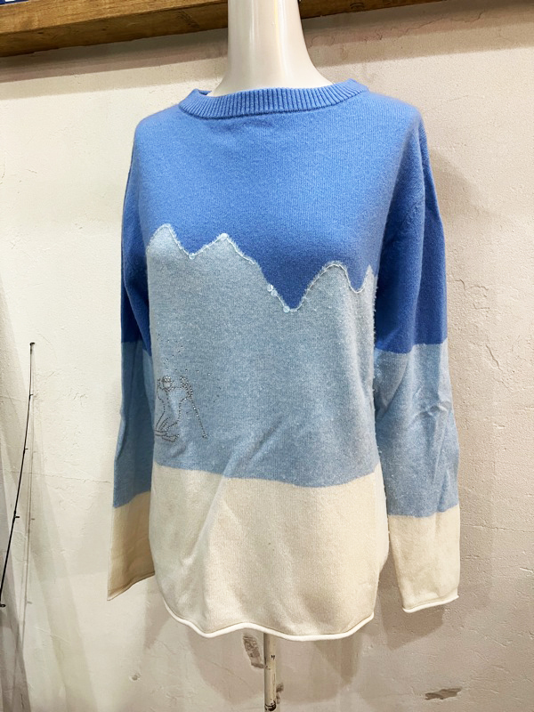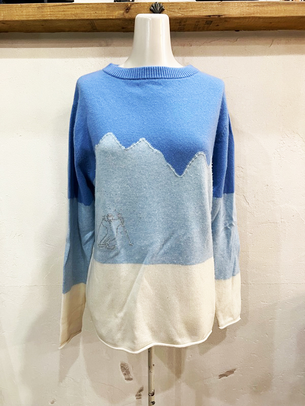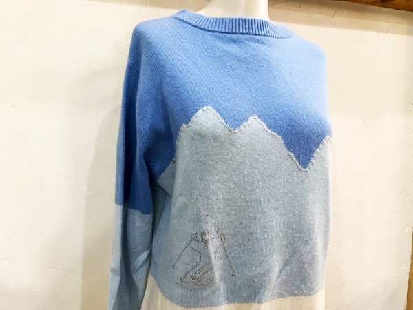 カシミア素材で肌触りの良いニットセーター。ラインストーンでデザインされたスキーヤーが可愛らしい印象です。