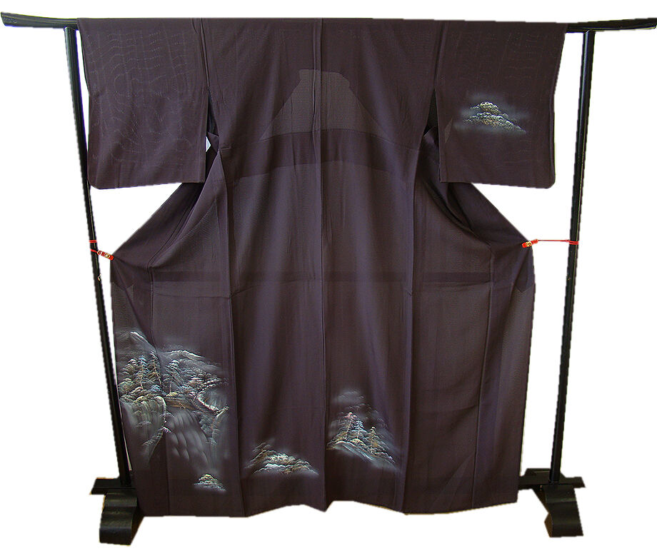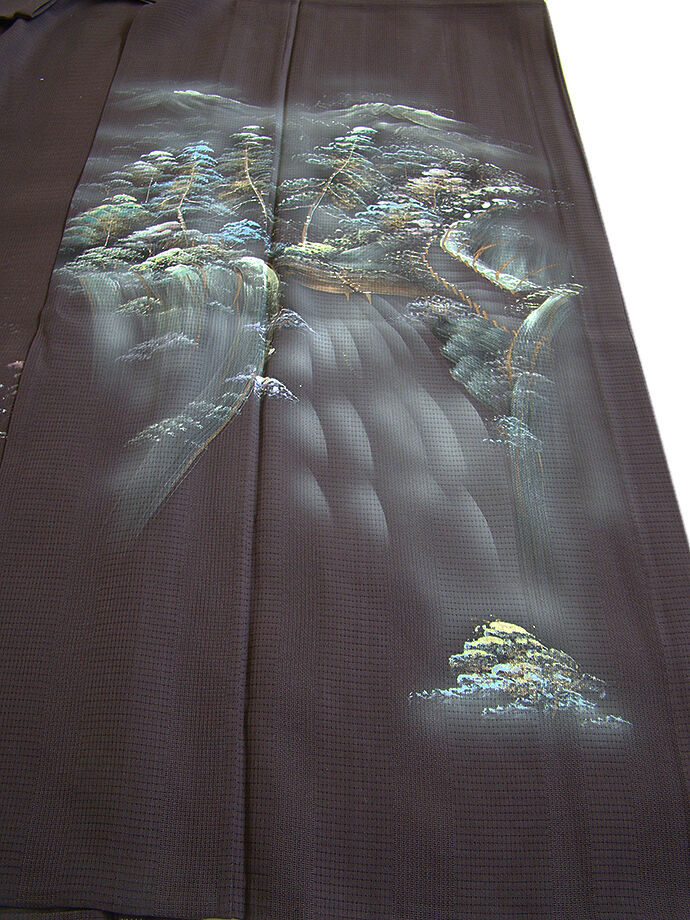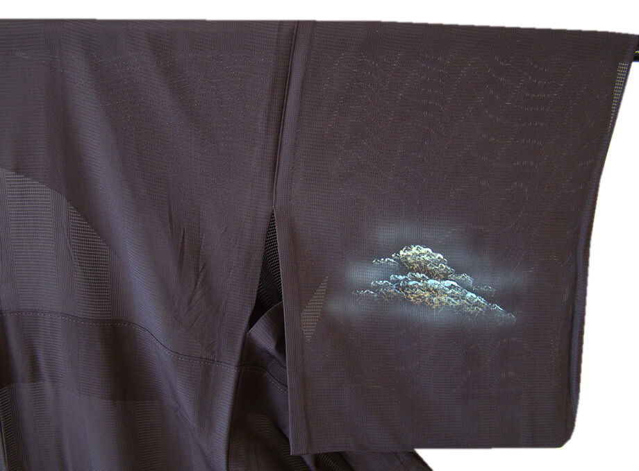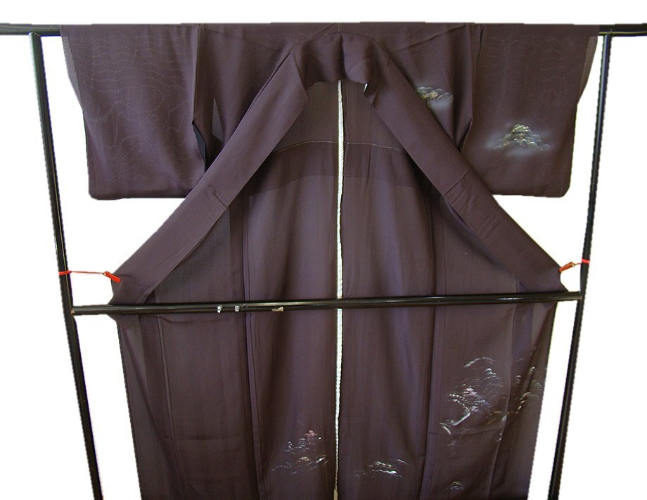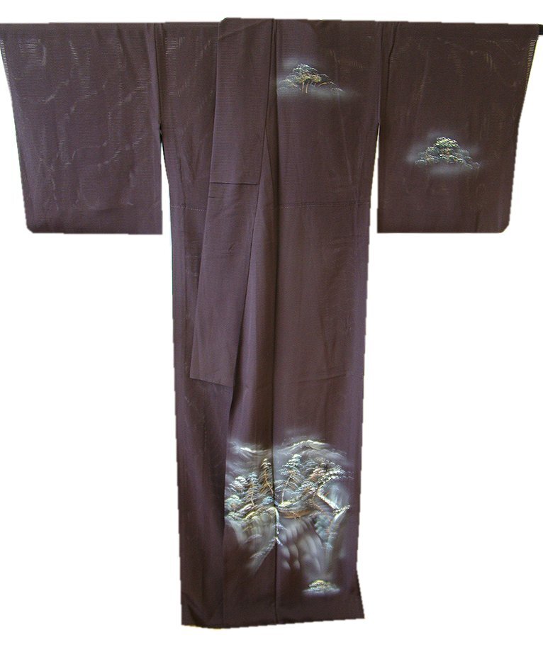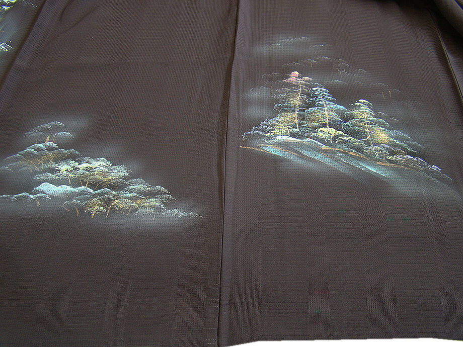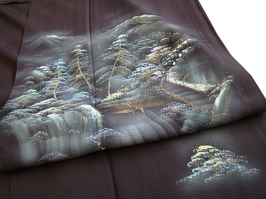 | 商品説明 | こちらのお品は夏物でございますので、7月~8月にお召頂ければと思います。 絽と言えば、紗と双璧を成す夏のお着物の生地で、その最大の魅力は絶妙の透かし加減です。 清涼感溢れる地の風を通すしなやかさは、夏に着物を着るという贅沢を 快適に楽しませてくれることでしょう。 着物には、大きく分けて「袷(あわせ)の着物」と「単衣(ひとえ)の着物」と「夏着物」があります。 反物(表地)を着物に仕立てるときに、裏地類をつけるものを袷の着物、 つけないものを単衣の着物と呼び、胴裏や八掛といった裏地がつかない一枚ものの着物です。 また裏地がないため、座る時などにヒップのラインが目立たないよう、 居敷当て(いしきあて)の生地をつけることもあります。 居敷当てが付いております。 とてもしなやかなさらっとした肌触りが極上の着心地を誘う滑らかな「駒絽」の変り織の生地、 渋い黒鳶色地に木々や風景柄の染柄に金彩加工仕立て、 着る人や見る人を清涼感に包み、女性の凛とした美しさを醸す様な、 洗練された印象を身に着けるお着物に仕上がっております。 |