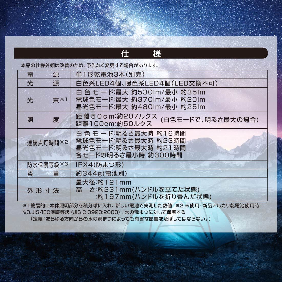 ■ 照度:距離50cm…約207ルクス、距離100cm…約50ルクス(白色モードで明るさ最大の場合)