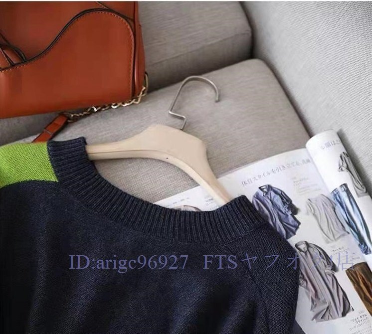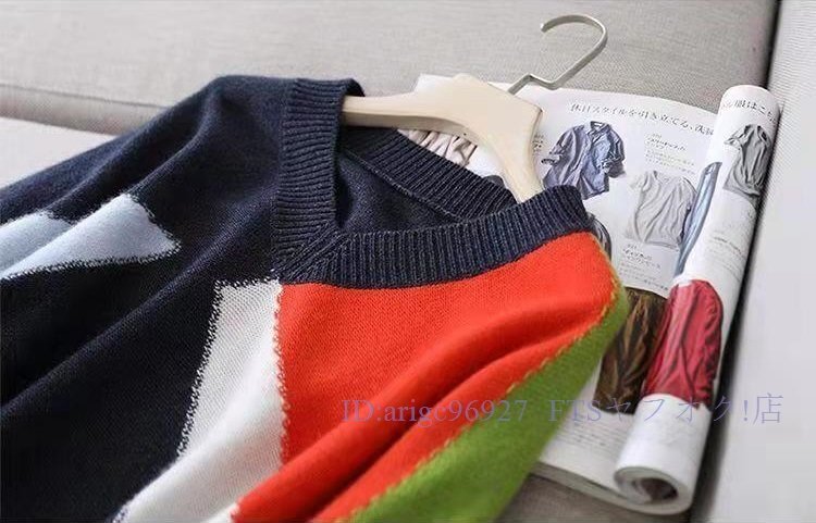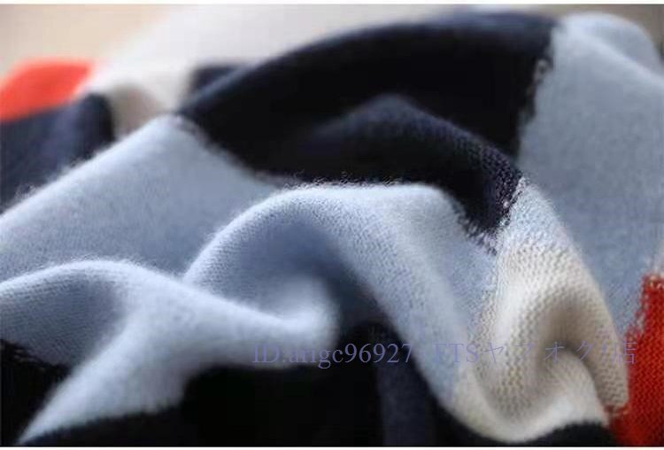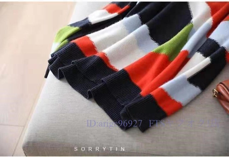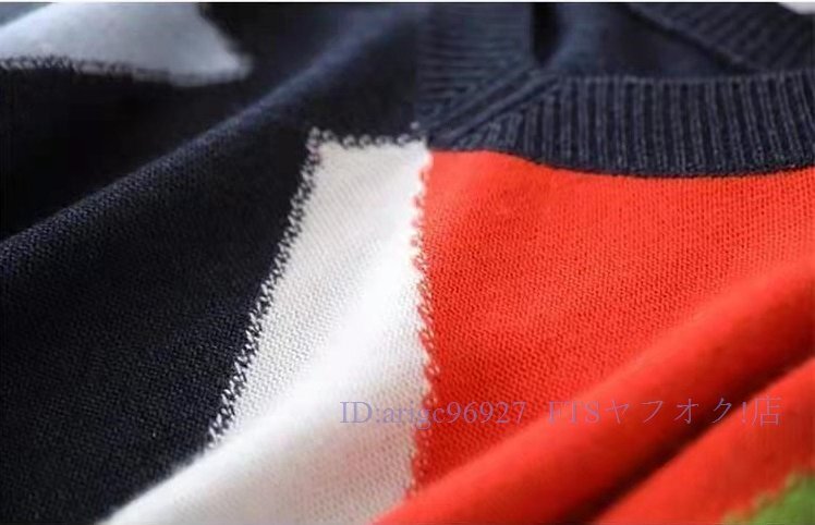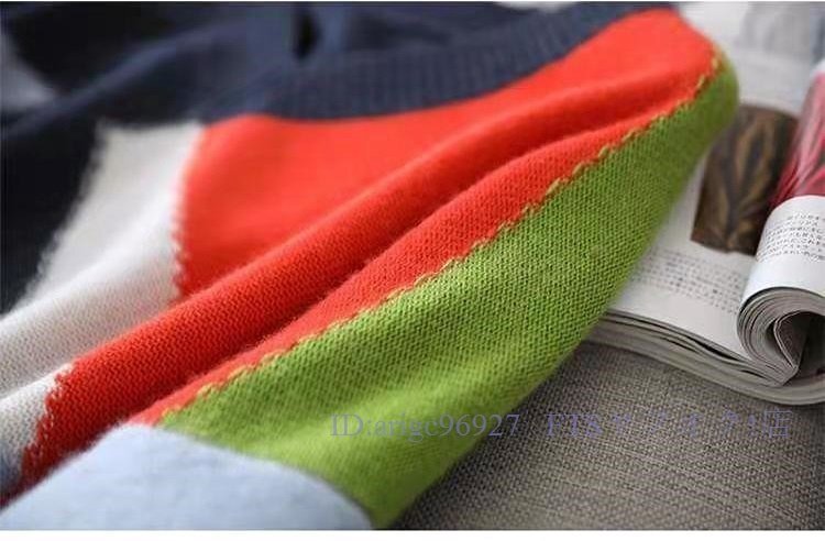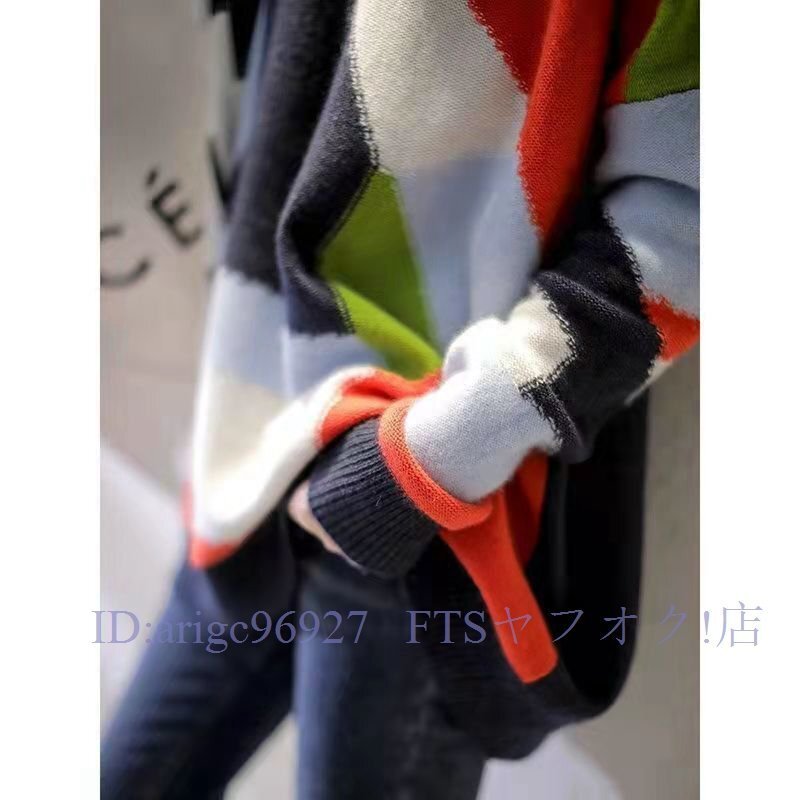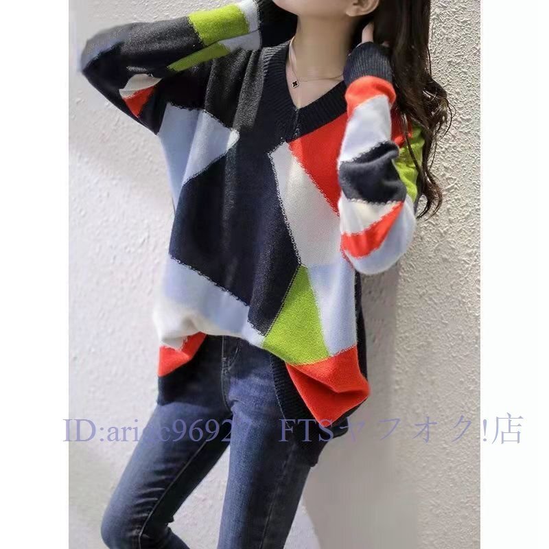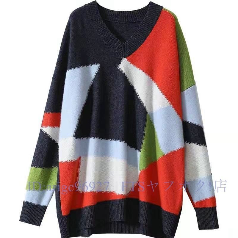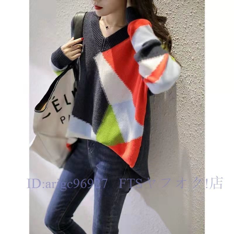 A6461☆新品秋冬 上質 Vネック ミンクカシミヤ混 ニットトップス ゆったり おしゃれ 配色柄 大人女子 長袖 ニットセーター