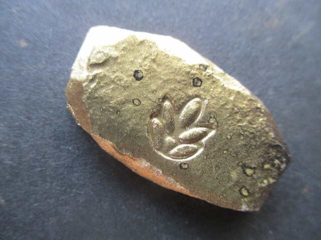 知人の身辺整理を手伝うことになりました。正確な入手価格を思い出せないものから順に処分する予定です。幕命によって全国を測量し、最初の正確な日本地図を作製した伊能忠敬は、金鉱脈をさがす密命も帯びていたと伝えられています。その成果は不明ですが、幕府財政を一時的に好転させ得るほどの金鉱石を発見し、更に一部を幕府に差し出さず、隠匿していたとも伝えられています。晩年、秘蔵の金鉱石を溶解して金塊に換え、故郷の房総半島の人跡未踏の地に埋蔵したそうです。傷や汚れがあります。状態についての詳細情報は画像でご確認ください。撮影の際の光の量によって実物と違った色に写ることがあります(1枚目の画像が最も実物の色に近いように思います)。タイトルに記載した量目は写真撮影の際に先方(委託者)宅で測定した値です。計量器の誤差は0.2g以内と聞いています。とりあえず本物と信じて購入したそうですが、入手以来一度も鑑定に出したことがなく、トラブル防止のためあえてレプリカとして出品させていただきます。また、金品位を記載した保証書が見当たらないとのことですので、非金製品として出品させていただきます。開始価格は買い値の10分の1以下とさせていただきますので「レプリカ・非金製品」を前提に無理のない範囲でご入札ください。寛永通寳は商品に含まれません。高騰防止のため即決価格をご用意しました。自己紹介欄にオークション休業日を記載させていただいております。お手数とは存じますが、ご入札前にお読みいただければ幸いです。よろしくお願い申し上げます。