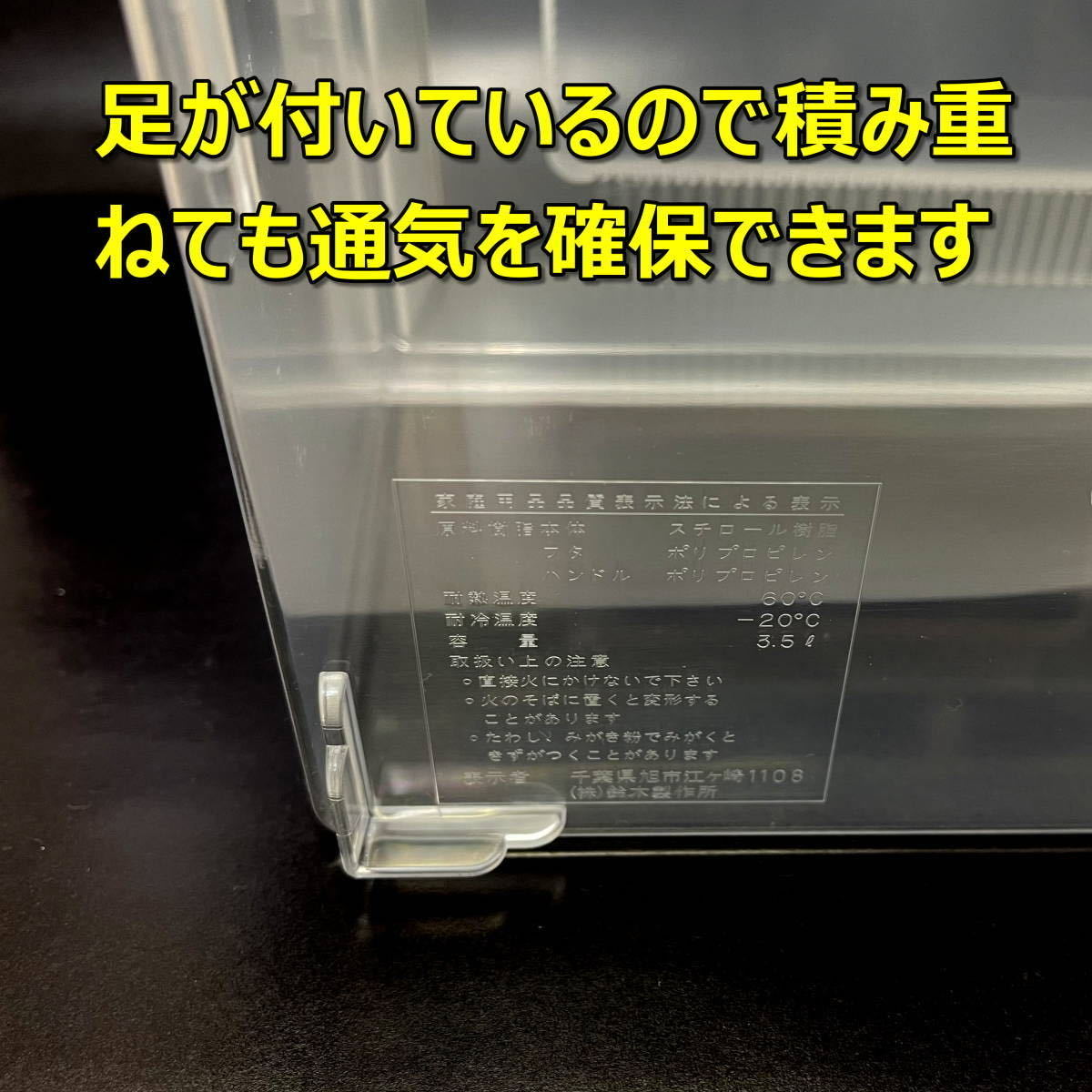 ・ケースに足が付いているので、積み重ねても通気を確保できるます。2段3段と積み重ねて、場所をとらずコンパクトに収納管理ができます。