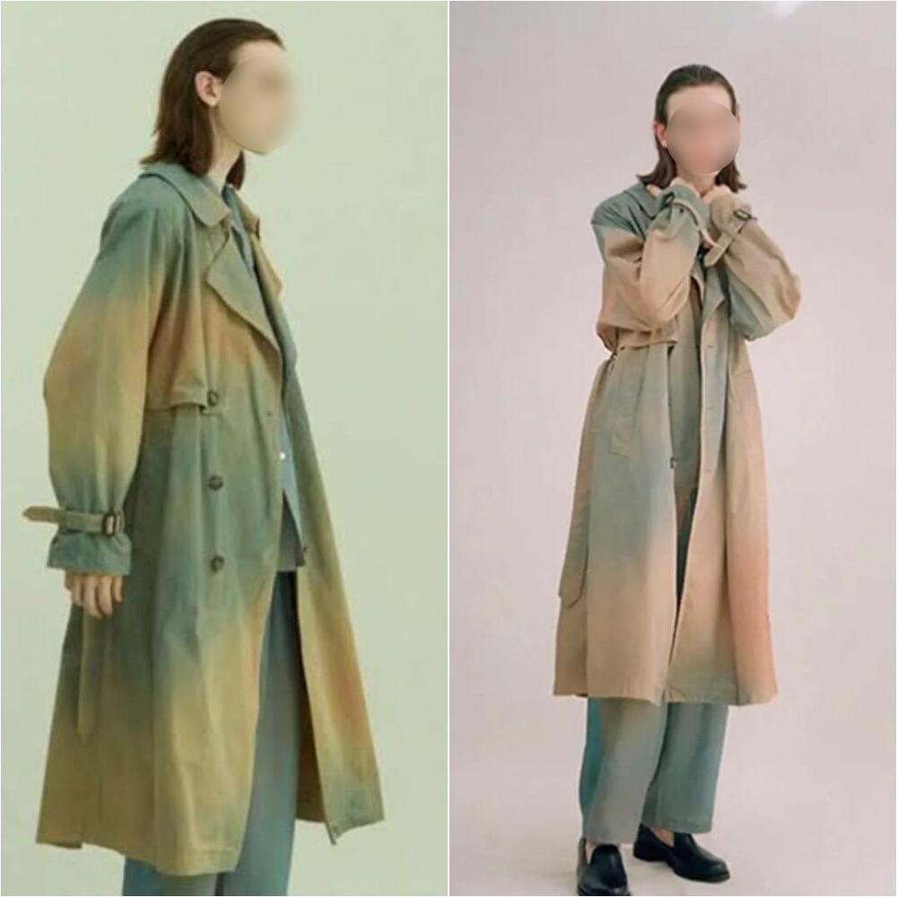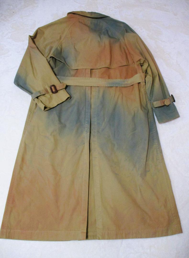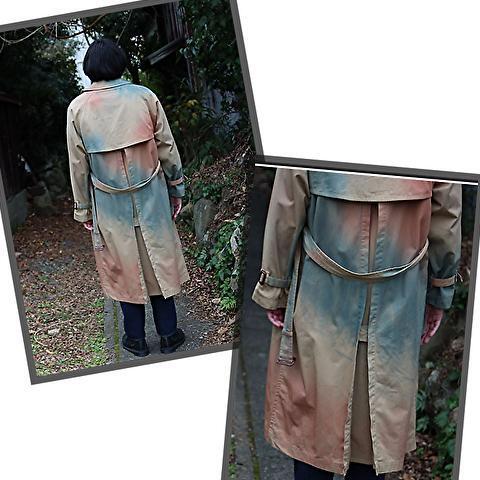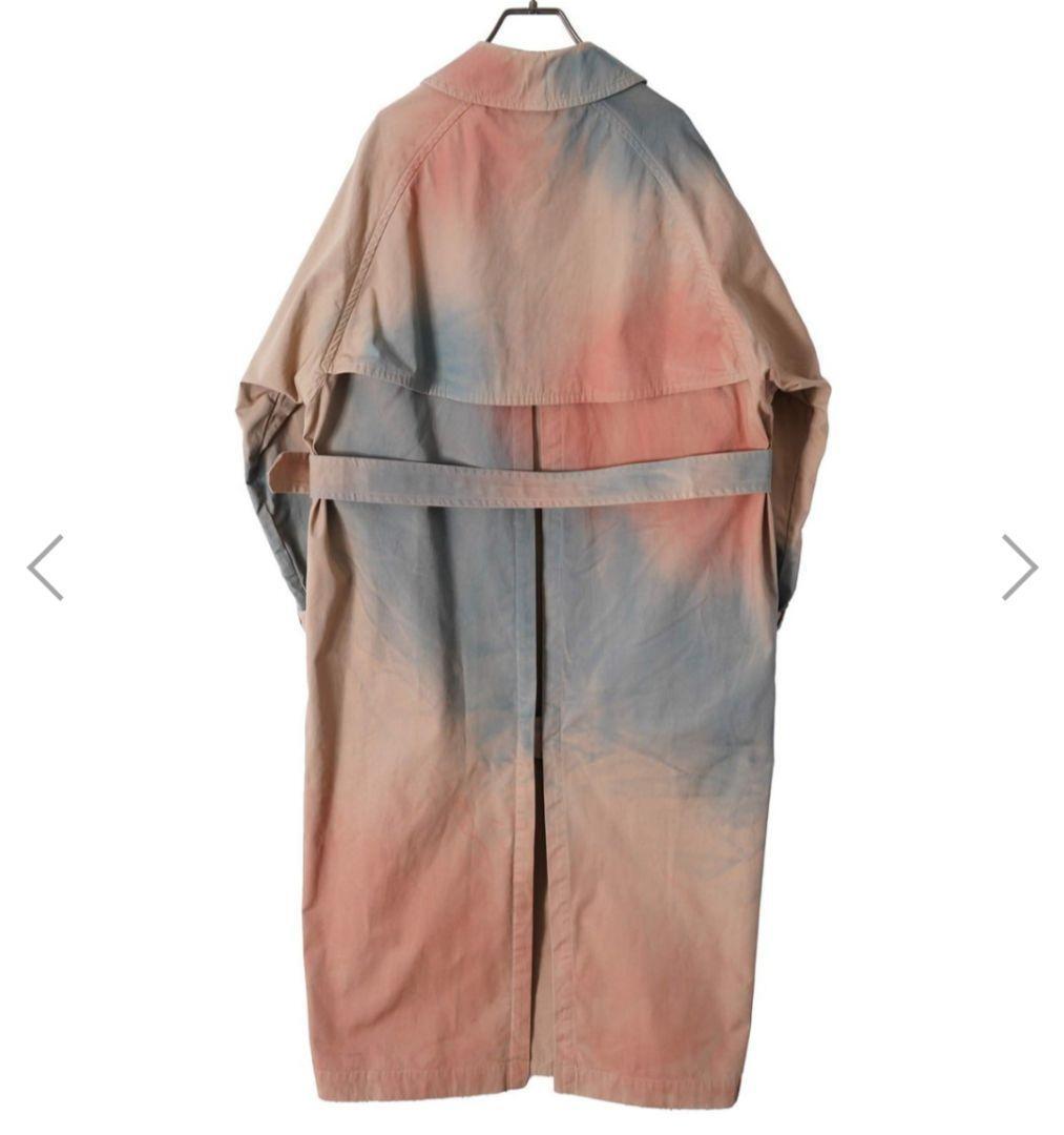 YOKEのレイヤードのトレンチコートのパターンをベースにし、ヘレン・フランケンサーラーの作品の滲みを製品でスプレー染をし表現したトレンチコート