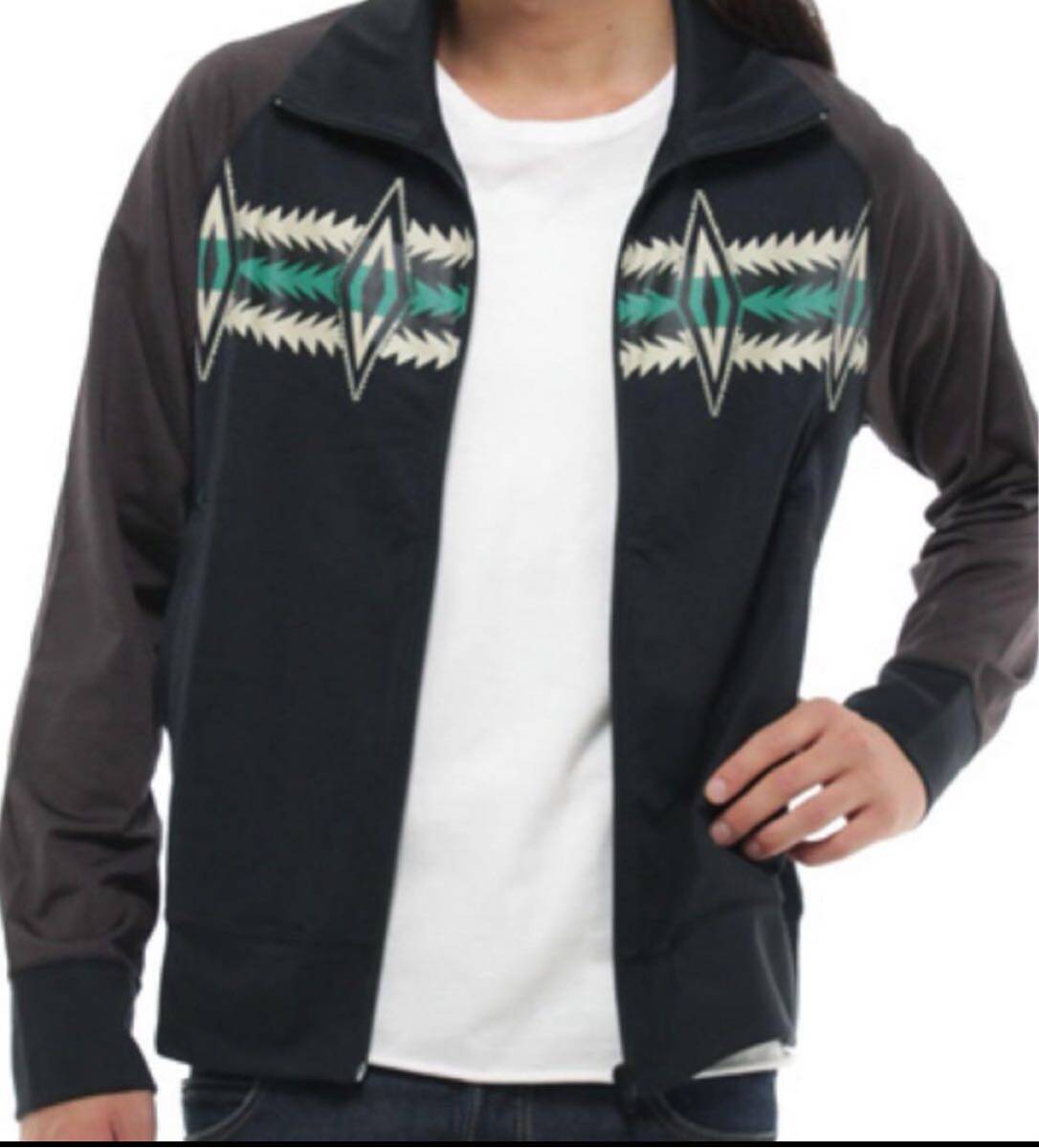 ラグランスリーブのスタンドアップカラージャージ。ラグランに合わせて配色を切り替え、タウンユース向けに仕上げたデザイン。胸元のナバホ柄プリントが存在感を際立たせるアイテム。