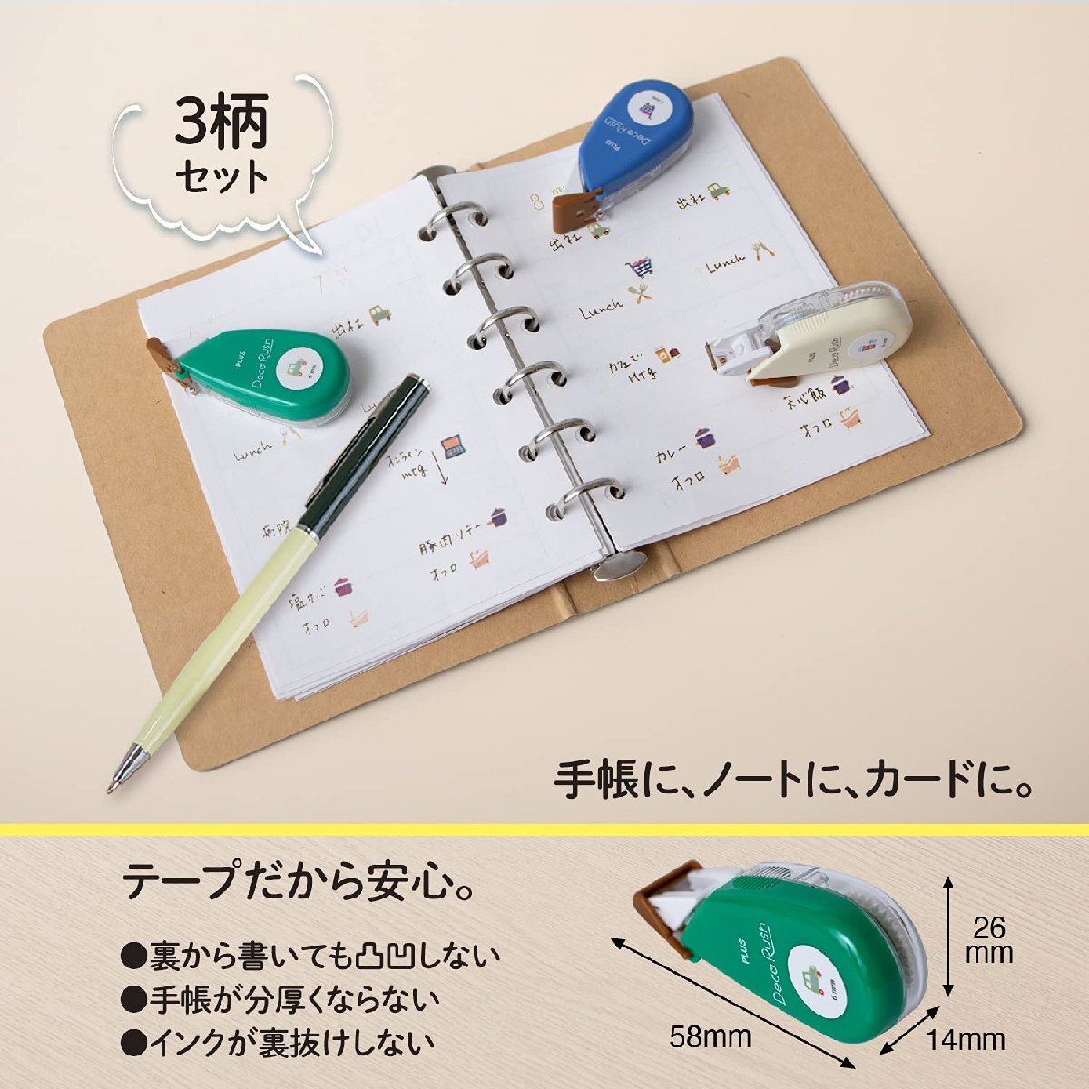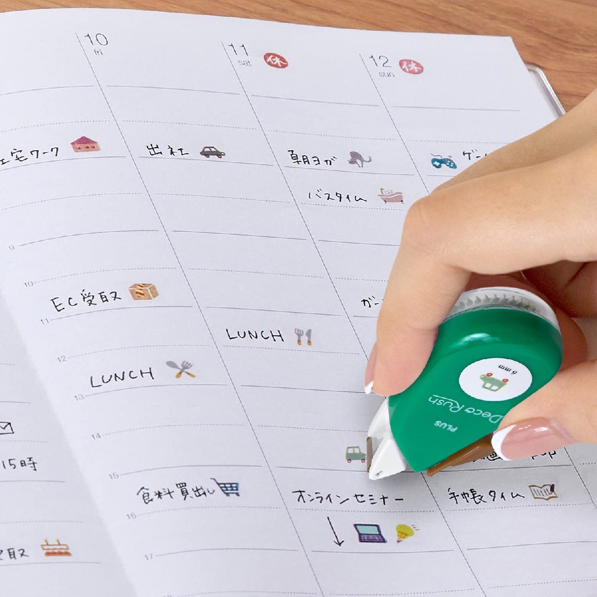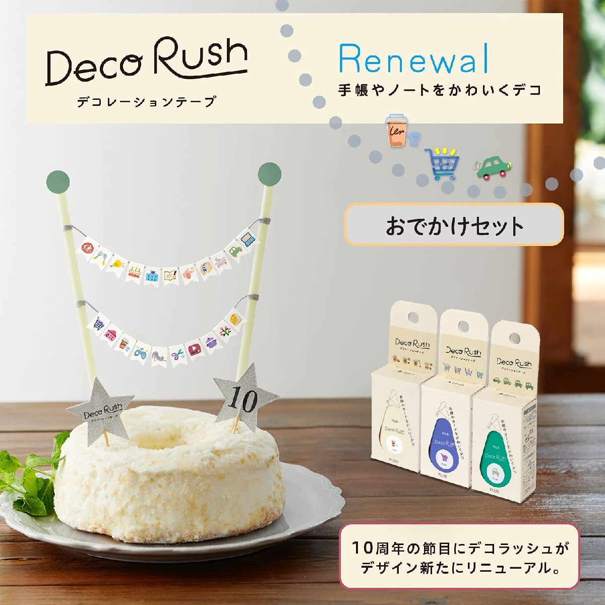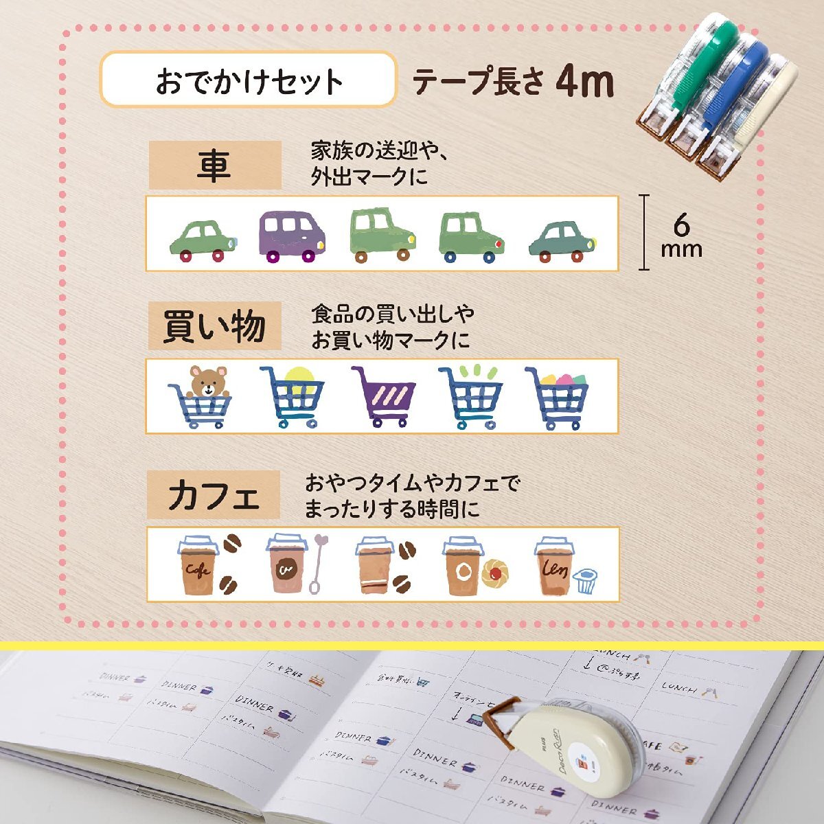 お出かけセット・おでかけ DC-060-10/-12/-14・Style:お出かけセット・かわいさと実用性を兼ね備えたデコレーショングッズ。大人の手帳タイムを彩る新デザインを発売。・定番デザインで手帳にも使いやすいライフスタイル系のアイコンをまとめました・使い切りタイプ・テープ幅6mm・テープ長さ4m・製品外形寸法:W58×D14×H26 mm説明 簡単でオシャレにデコレーションが出来るデコラッシュ。大人の手帳タイムを彩るデザインを発売! 1.テープ幅6mmタイプ。バーチカル手帳等細かく記録、細部の隙間デコに最適! 2.毎日の予定や日々の出来事行動の記録に最適なアイコン柄 3.予定変更や引き間違いにも心強い、専用消しゴム(別売り)で消せる 4.簡単に長さを自由にコントロールできる! 1個使いでワンポイントデコ、長く使えばラインデコに! 5.テープだから、裏から書いても凸凹しない、手帳が分厚くならない、インクの裏抜けがない 6.持ち運びに便利なコンパクトサイズ 7.コレクション心をくすぐるカラーバリエーション、SNS映えする本体カラーで撮影小道具として活躍 8.品質もしっかり! ミニローラーヘッド、ワンタッチ開閉キャップ、スムーズトルク機構搭載
