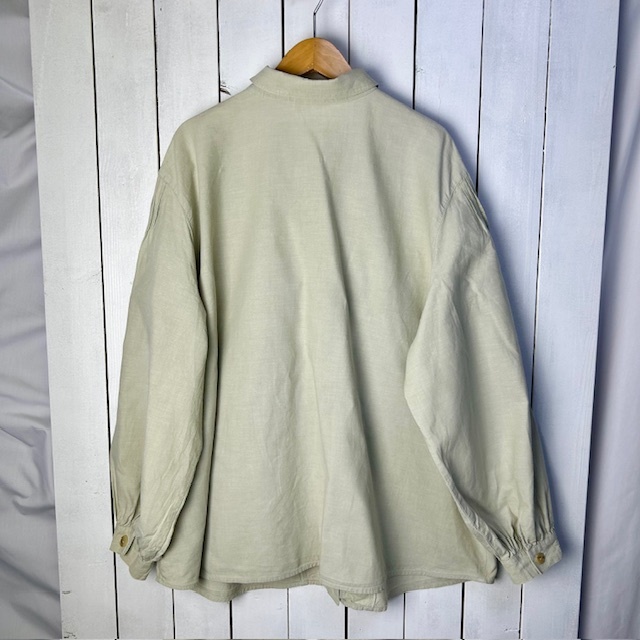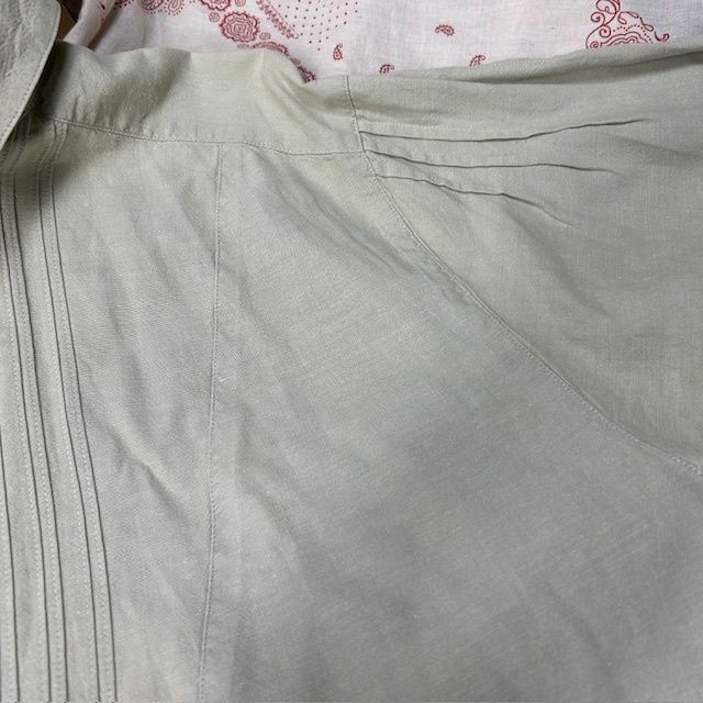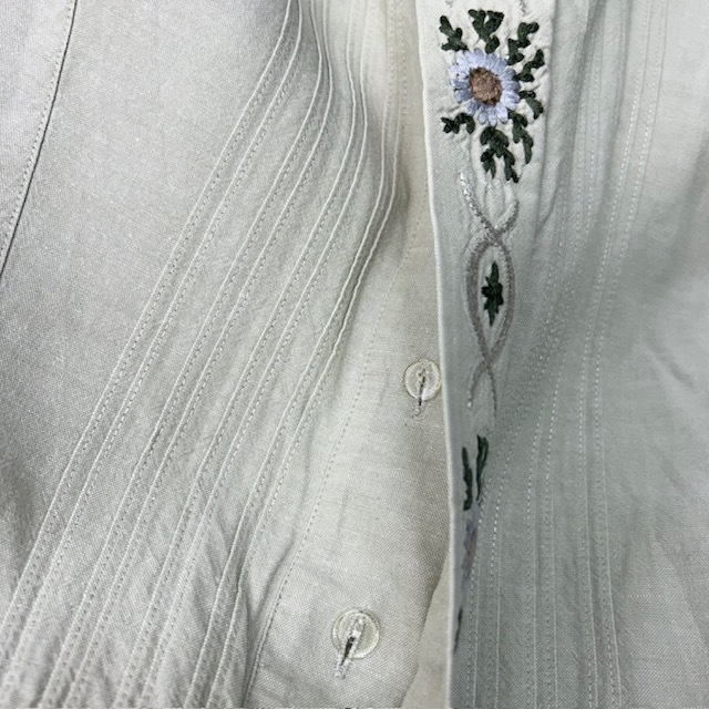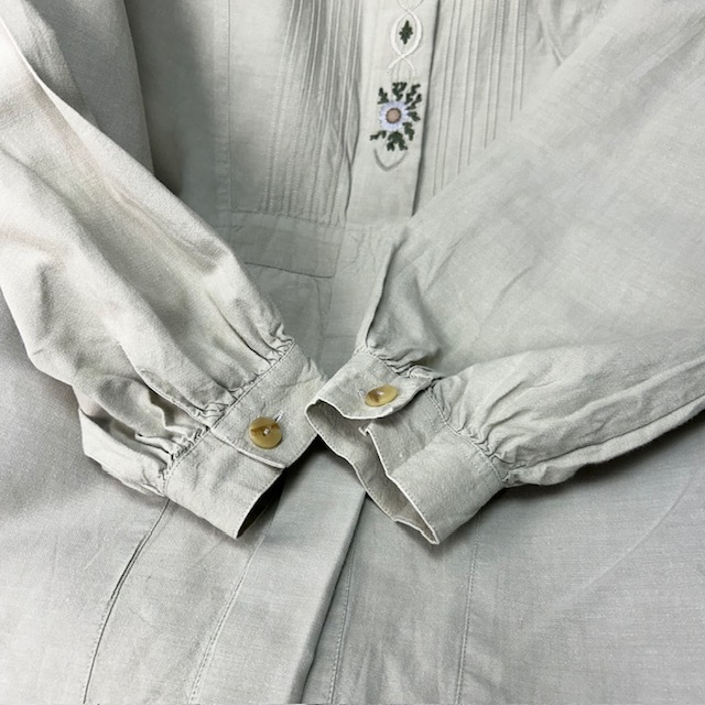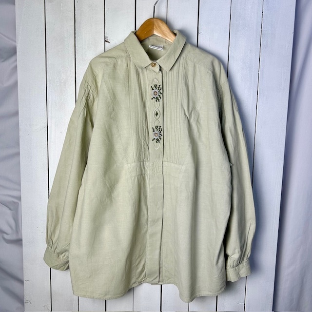 ●商品説明・・・ヨーロッパ古着になります。80年代~90年代頃のオールド・ヴィンテージの比翼仕立ての刺繍・ピンタック入りのチロルシャツ・ブラウスです。身幅の広いゆったりめのリラックスしたシルエット感で、アームホールも太いボリューム感のあるシルエット感です。素材はBaunwolle(コットン)で、やや張り感のあるパリッとしたような生地感です。色はカーキベージュのような感じです。サイズ表記は46で、ゆったりワイドなL~XL・2XL程度のサイズ感で、メンズの方もゆったりめで、ユニセックスで着ていただける感じかと思います。