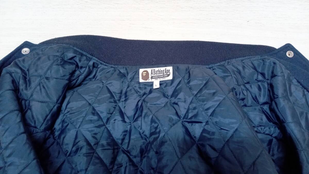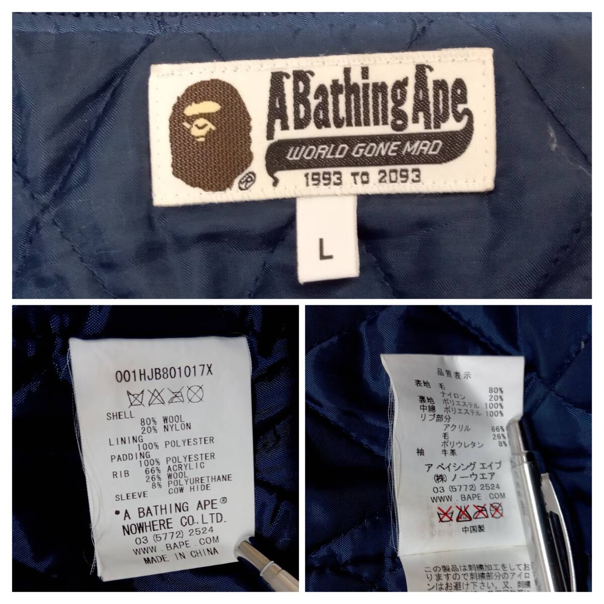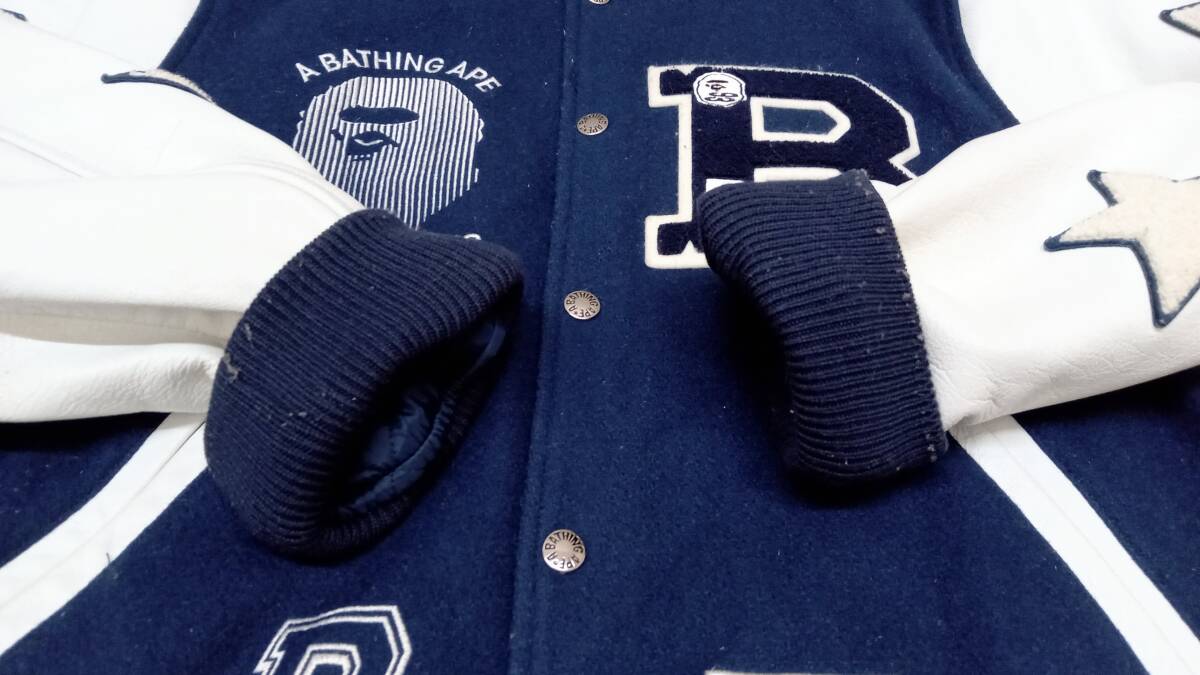 | ・ブランド A BATHING APE/アベイシングエイプ ・カテゴリ スタジャン/001HJB801017X/LETTERED VARSITY JACKET ・カラー ネイビー系 ・サイズ Lサイズ 着丈約66cm 袖丈約65cm 身幅約52cm 肩幅約46cm ・付属品 なし ・状態 全体的に使用感あり 袖に傷汚れあり(写真5) リブ部分毛玉あり(写真6.7) |