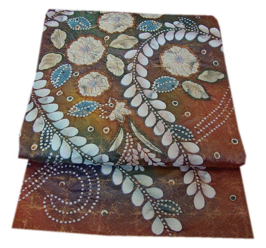| 商品説明 | しなやかな手触り良い扱い易く、〆易い西陣織、辻ヶ花の袋帯。 暗い紅鳶色地に金色ぼかしと灰色、天色、青銅色等の辻ヶ花の織柄。 たいこ柄。 |