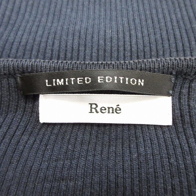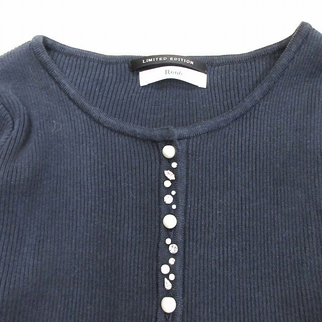 ルネ Rene LIMITED EDITION リブ ニット カーディガン コンパクト セーター 五部袖 ビジュー パール カットソー 34 紺 レディース