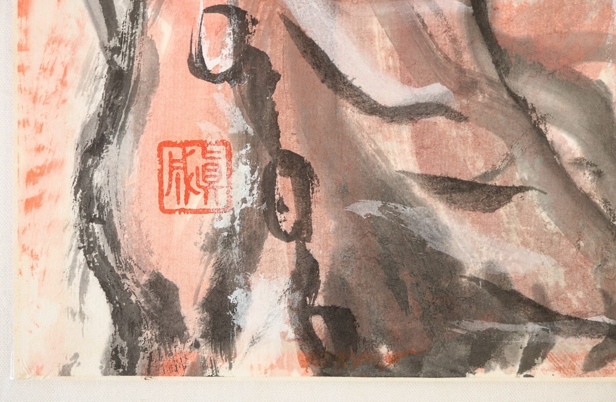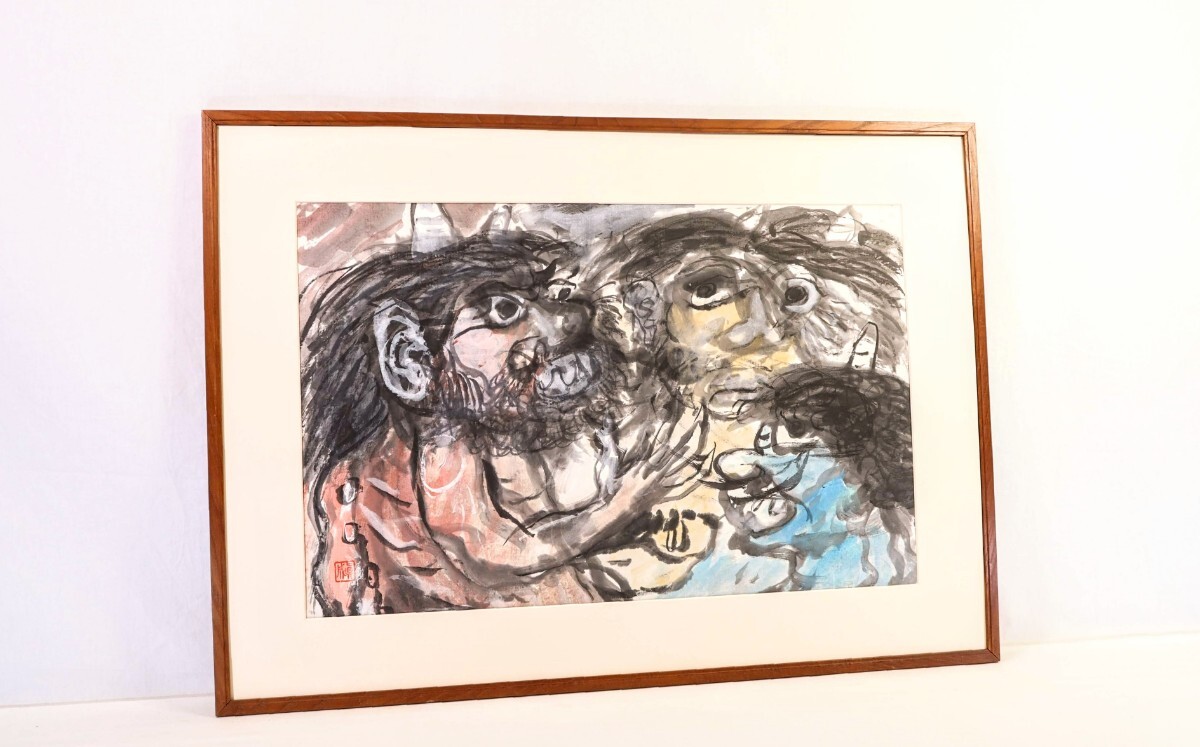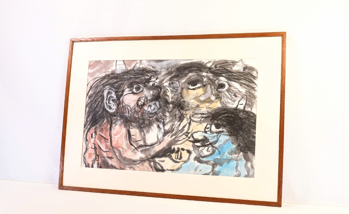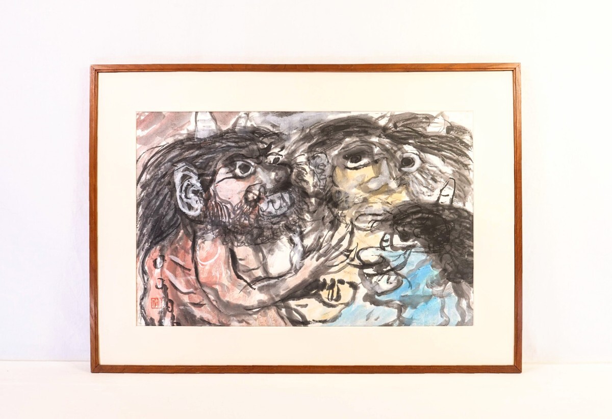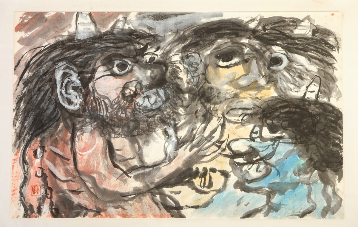 真作 斎藤真成 墨彩「鬼三匹」画寸 69.5cm×45cm 愛知県出身 真正極楽寺貫主 須田国太郎に師事 仏教説話を題材に抽象化した色面構成 9685