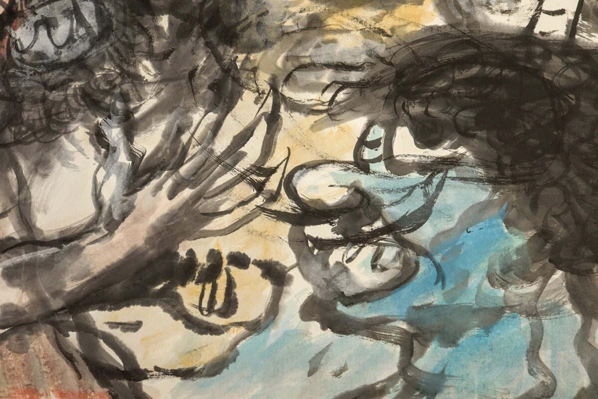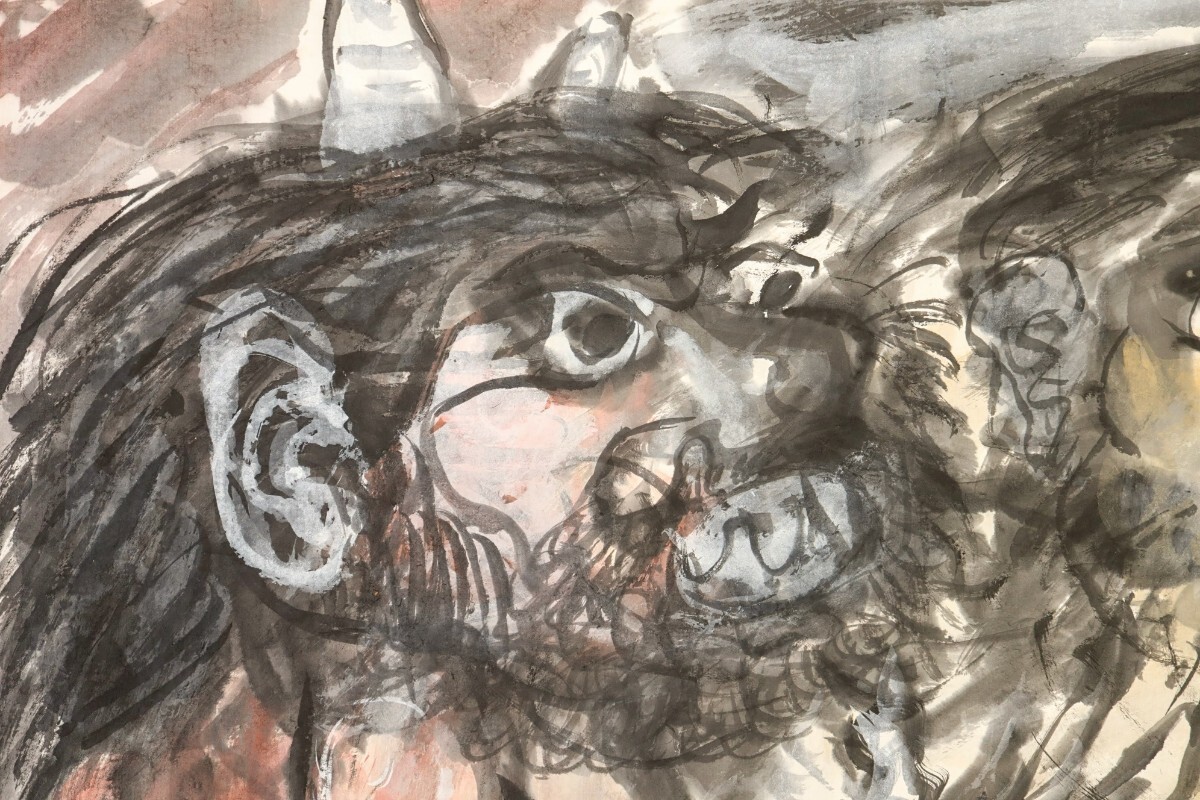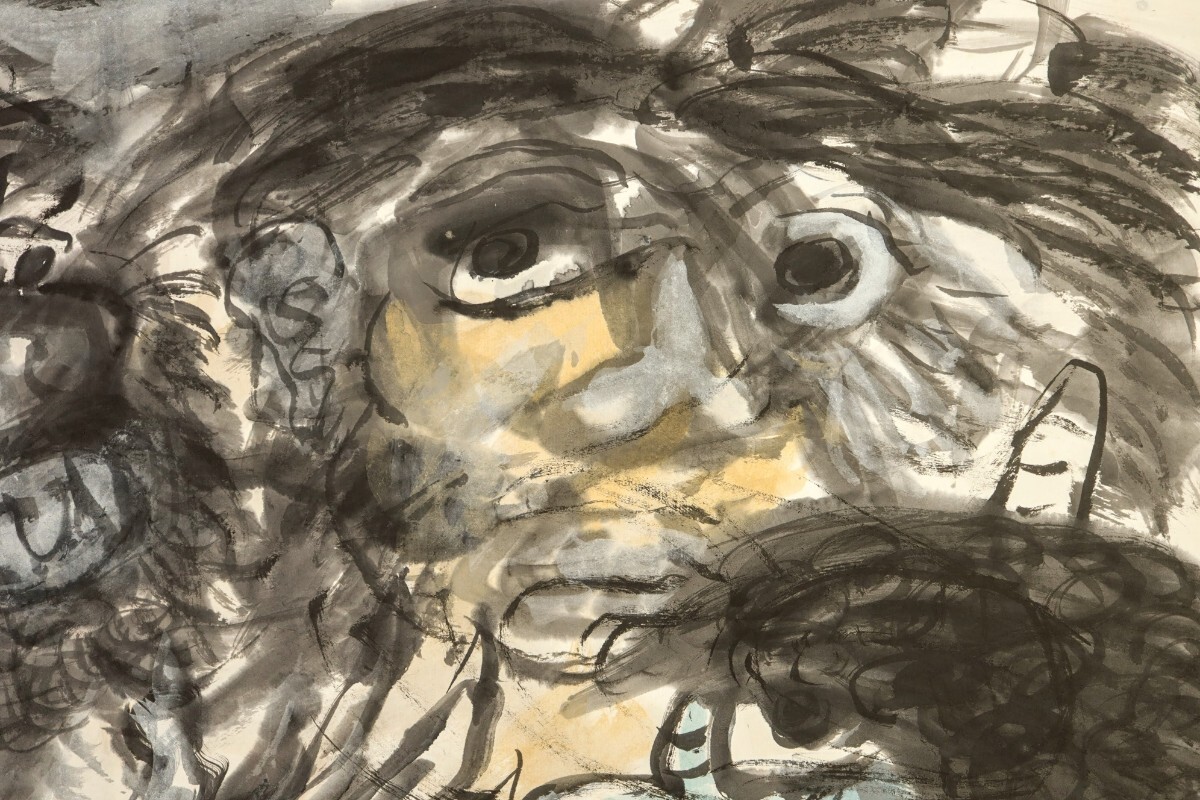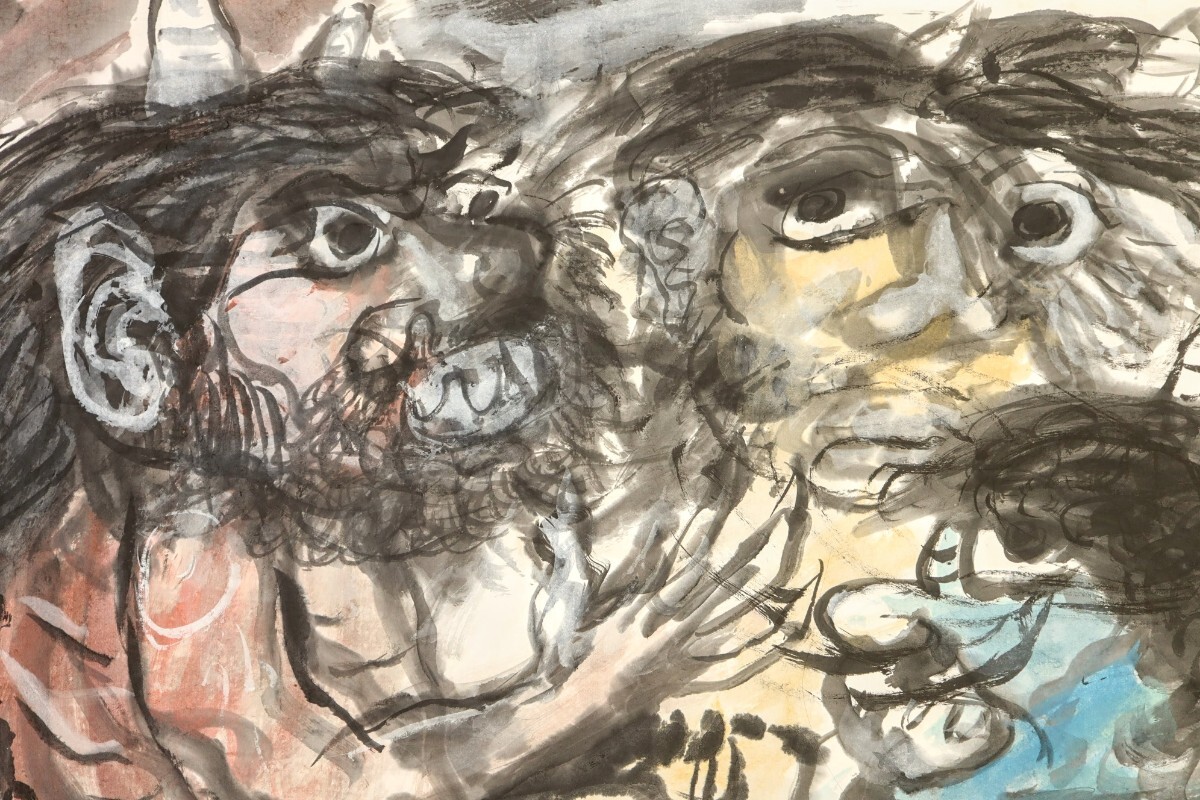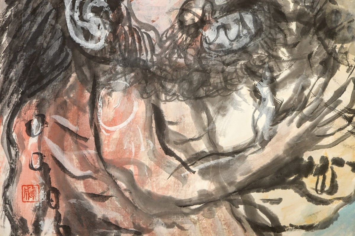 真作 斎藤真成 墨彩「鬼三匹」画寸 69.5cm×45cm 愛知県出身 真正極楽寺貫主 須田国太郎に師事 仏教説話を題材に抽象化した色面構成 9685