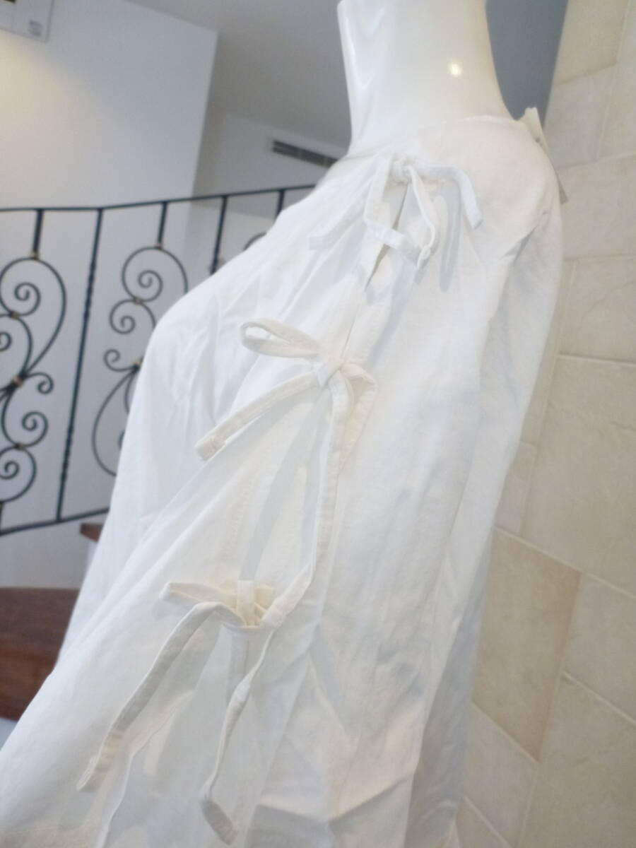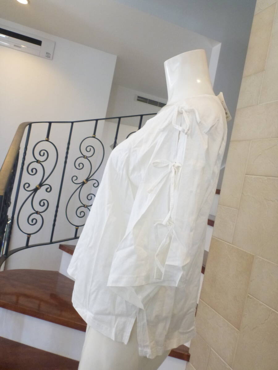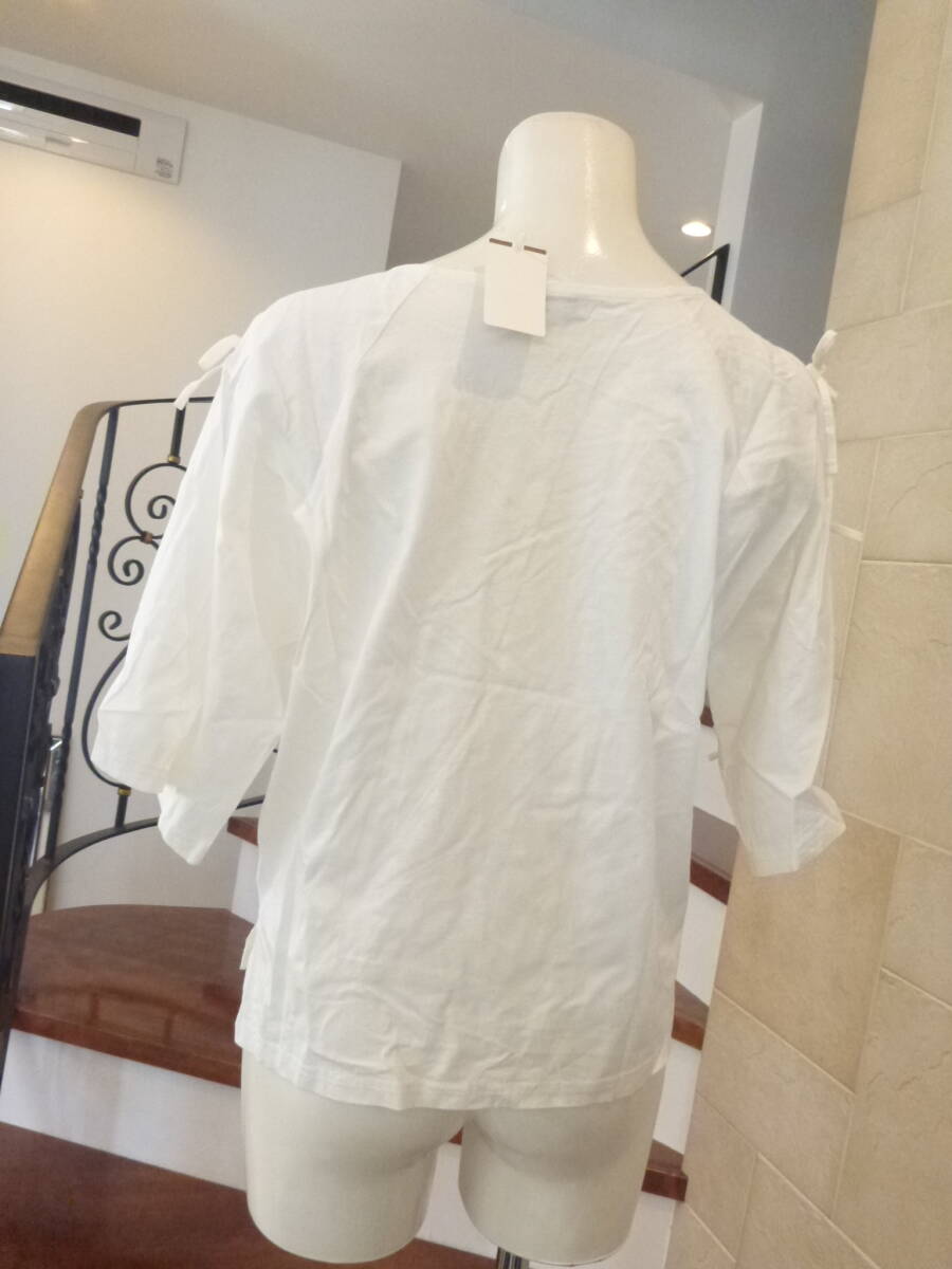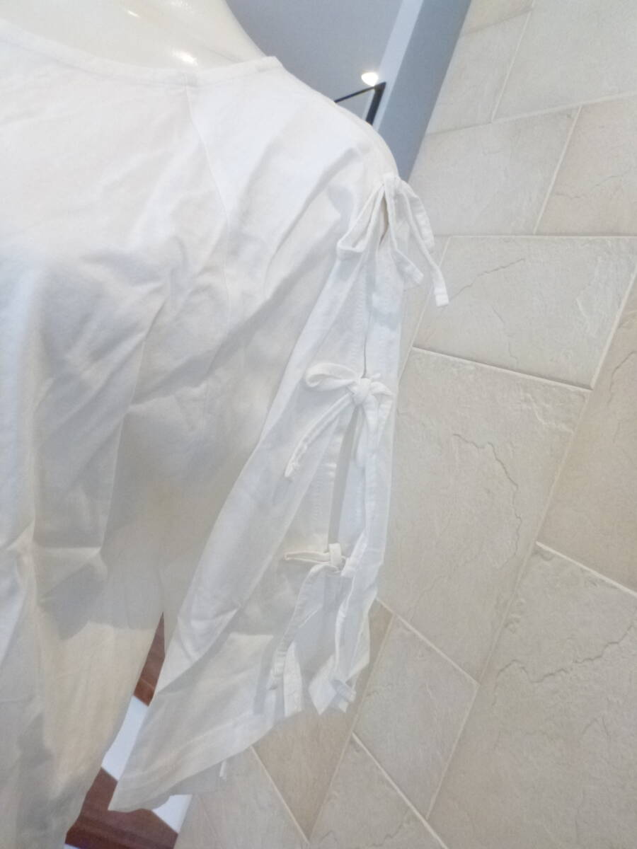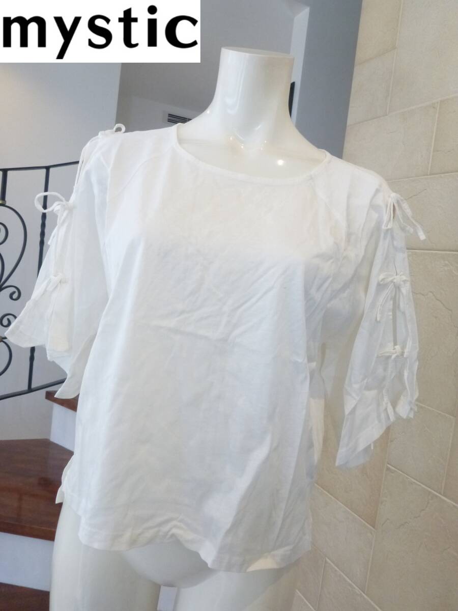 新品 mystic|ミスティック★白 ホワイト 肩スリット+リボン 半袖 カットソー L~LL相当
