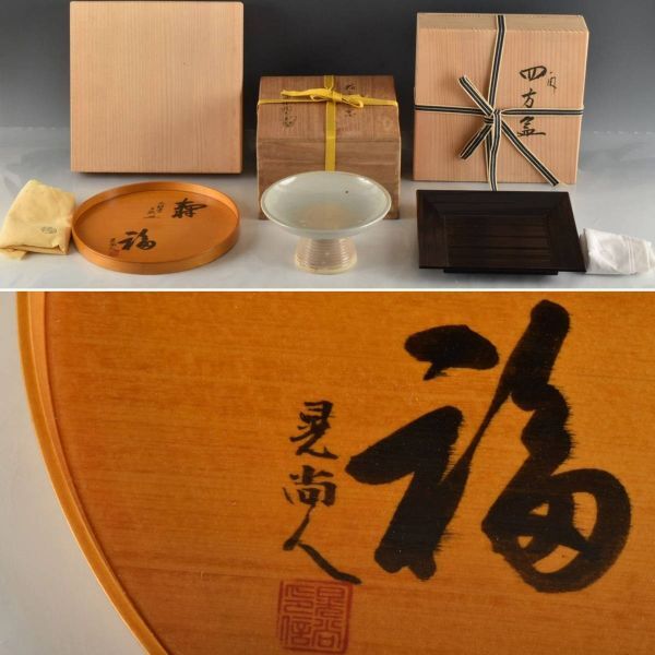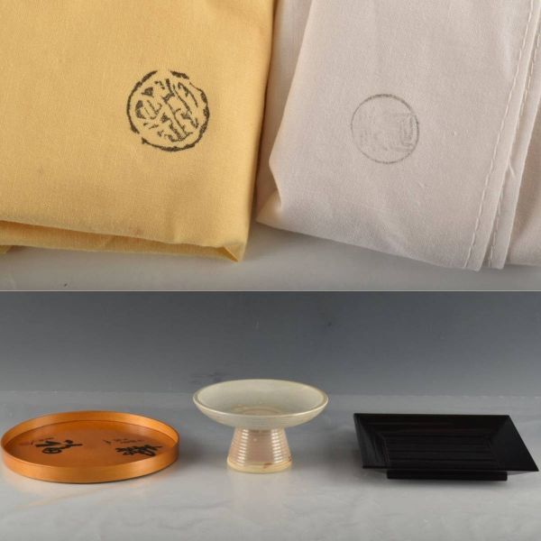 状態:丸盆は反れあり。他、大体良好。菓子器の胴下部に「陶兵衛」と銘あり。四角盆高さ:3.0センチ縦:22.9センチ横:22.9センチ