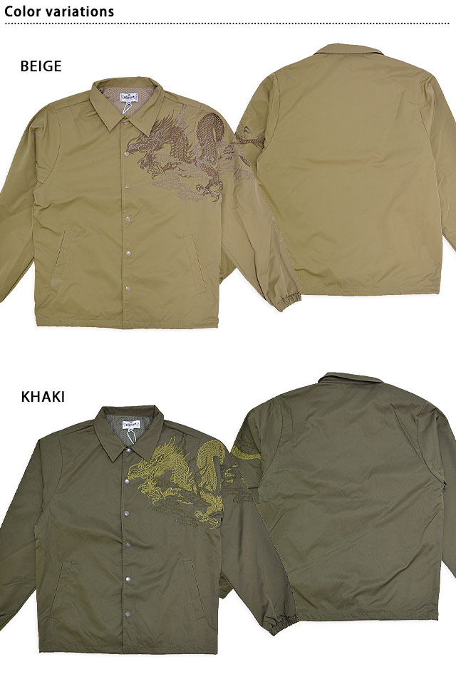 絡繰魂さんから「雲龍コーチジャケット(243086)」のご紹介です。 しゃかしゃかとしたスポーティーな生地をボディーに採用した、コーチジャケットが登場しました! フロントはスナップボタン仕様。 両身頃にはポケットが縫いつけられています。 袖口には絞りを採用。 裾にはドローコードが通されており、寒さ対策もばっちりです。 裏地にはメッシュ生地を切り替えました。 フロント左肩から袖にかけて、雲龍をアウトラインのみの刺繍で表現。 柄は縫い目を跨いで描かれており、実際に着用した際にはより立体感をお楽しみいただけます。 それぞれのボディーカラーに合わせて刺繍の色味にも変化を持たせられた、着こなしに気軽に取り入れられる和柄コーチジャケットです。 | |||||||||||||||||||||||||