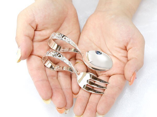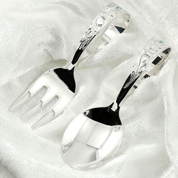 商品コード 160828g01h 発送は3週間程です◆サイズ スプーン 全長 約80mm、皿の幅 27mm フォーク 全長 約80mm、皿の幅 23mm◆素材 シルバー(silver)925◆宝石 天然石 2.5ミリ※天然石によりお値段が追加となります 予めご了承下さい◆付属品 ギフトボックス お手入れ方法説明書※文字入れの内容は備考欄にお願いします赤ちゃんのお誕生祝いや「お食い初め」を祝うギフトにお勧めの、銀製ベビースプーンとフォークのセットです持ち手部分には誕生石とハワイアン彫り、先端にお名前(下のお名前)と誕生日を刻印しますヨーロッパでは、古くから「銀のスプーンをくわえて生まれた赤ちゃんは幸せになる」という言い伝えがあり、ベビーギフトとして銀のスプーンを贈る習慣があります日本においても「一生食べる物に困らないように」との願いを込めたベビーギフト お食い初めギフトに人気ですご注意銀はアレルギーとなることが少ない金属ですが、赤ちゃんの安全のため、実際に口へ運んだり等はせず、記念品としてお使いください送料無料 ギフト ポイント消化にオススメ フリースタイル ニッケルフリープレゼントとして最適 安い 福袋 30代 40代 50代