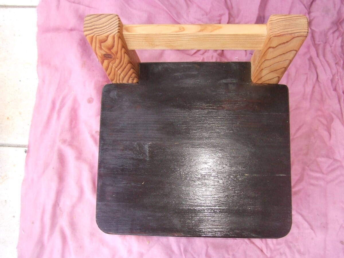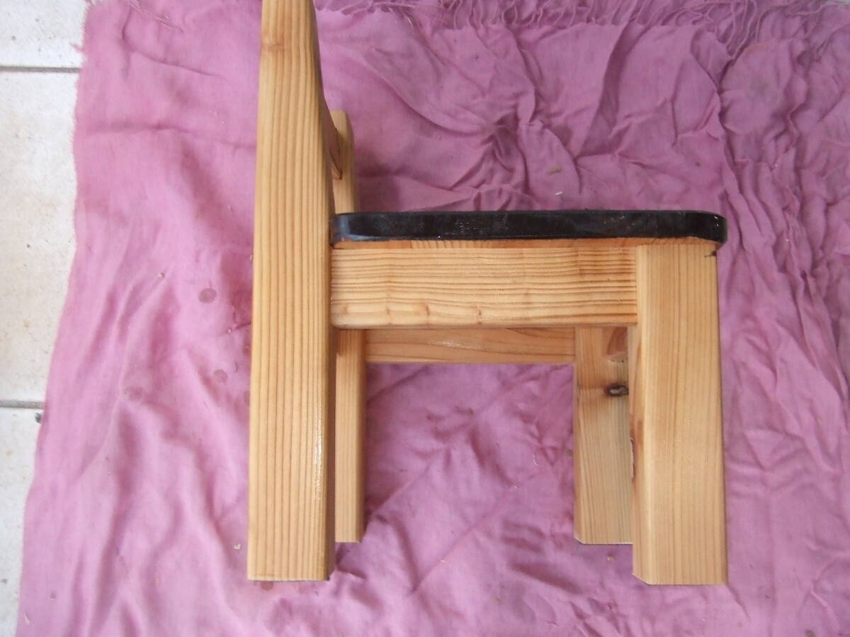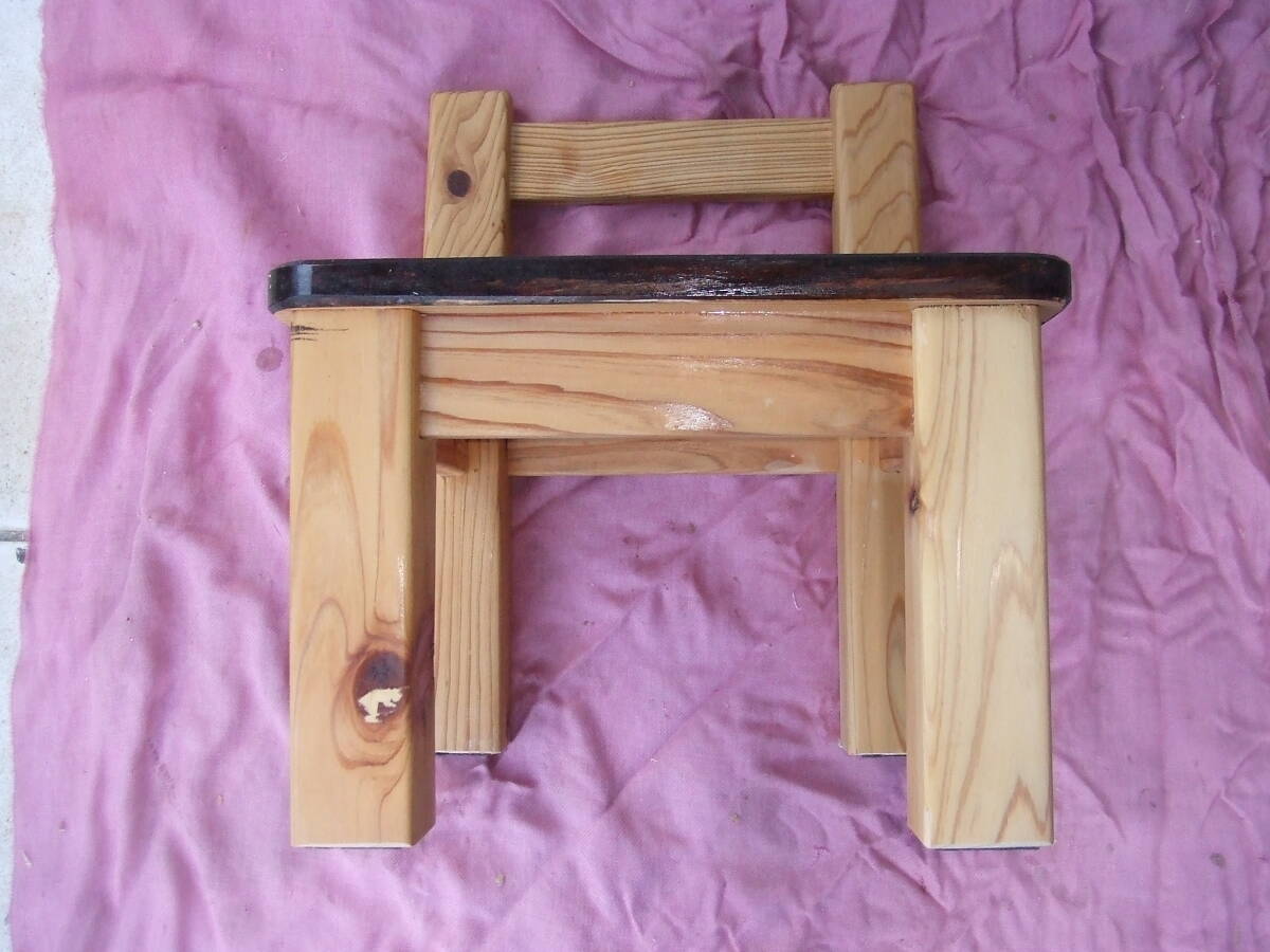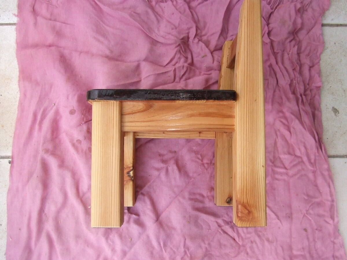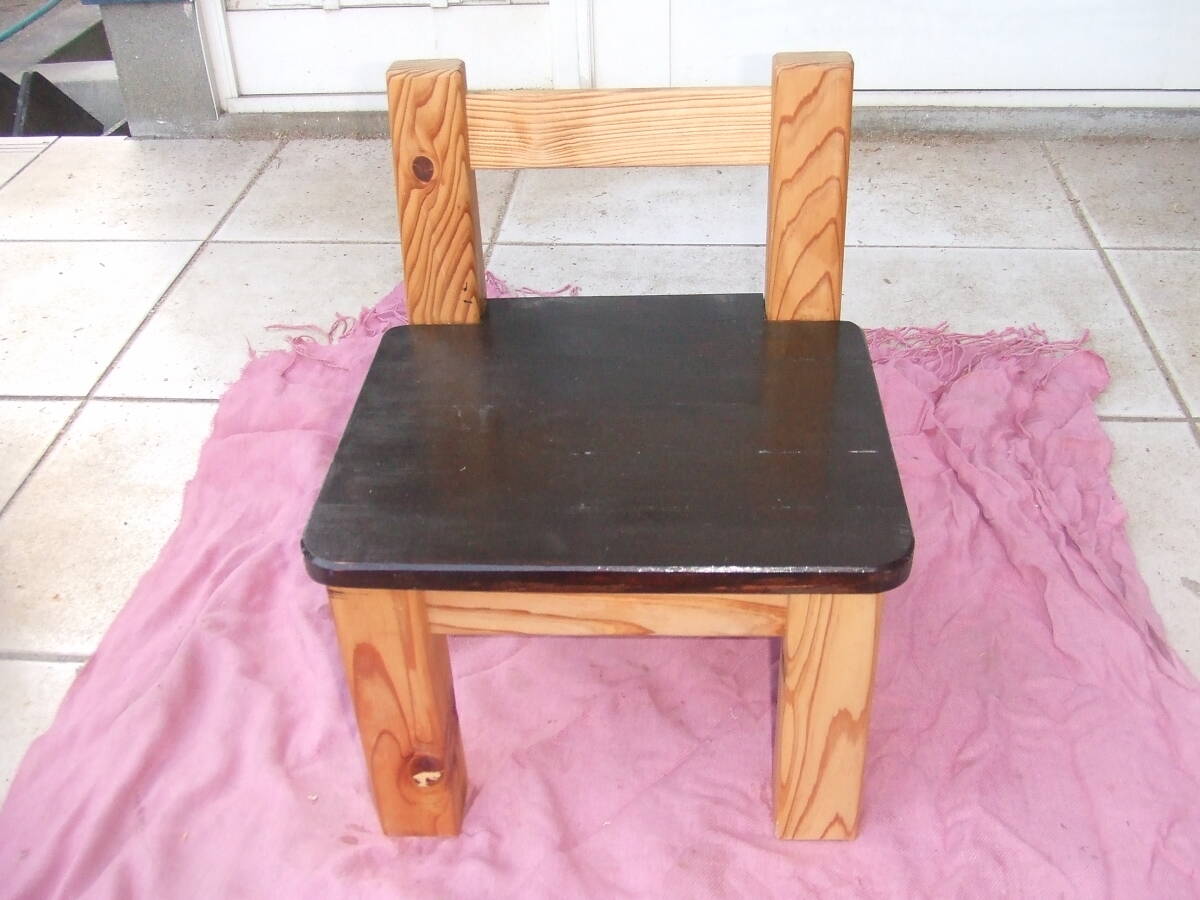 趣味で木工しています。 木材はホームセンターの杉を使用しています。 仕上げの方は座面のみオイルステインで着色後ウレタン塗装足をウレタン塗装仕上げです。自然素材なので節やシミ又趣味の手作りなので多少の傷・パテ埋め・汚れ・隙間・磨き不足・塗装へたくそはあります。 座面は285mm×265mmで高さ200mmです。 背もたれを含めた全体の高さは340mで奥行き275mmで横幅285mmです。(およそです) 素人の作品ですが、ビスや釘等金具は一切使わず本格ほぞ組構造で作って居ますのでガッチリしていますので子供さんに安心して座ってもらえるかと思います。 素人の手作り品ですので、家具屋さんで見るような高級家具と比較されては困ります。 最後の画像のごっつ盛りはサイズ比較用です。 子供椅子のほかに鉢植え・ぬいぐるみ・小物雑貨などオシャレに飾ってお楽しみください。