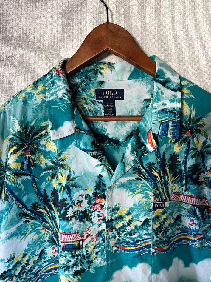 ポロ ラルフローレン ハワイアンシャツです。ユーズドですが殆ど使用感もなく美ユーズド状態です。ヨット&パームツリー柄でラルフローレンのアロハシャツの中でも人気のある柄です。サイズもゆったり着れるサイズのLサイズです。