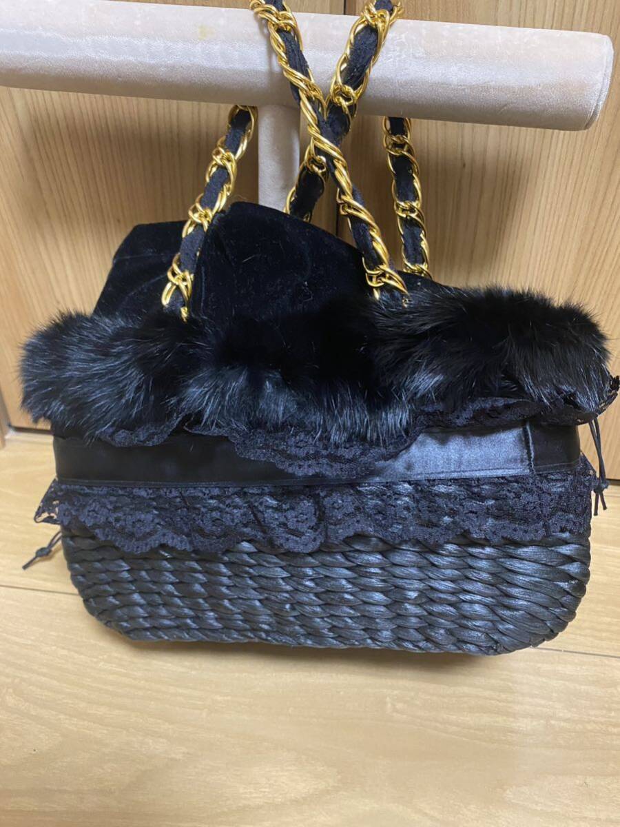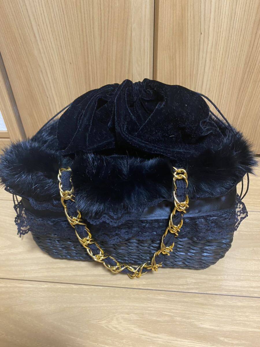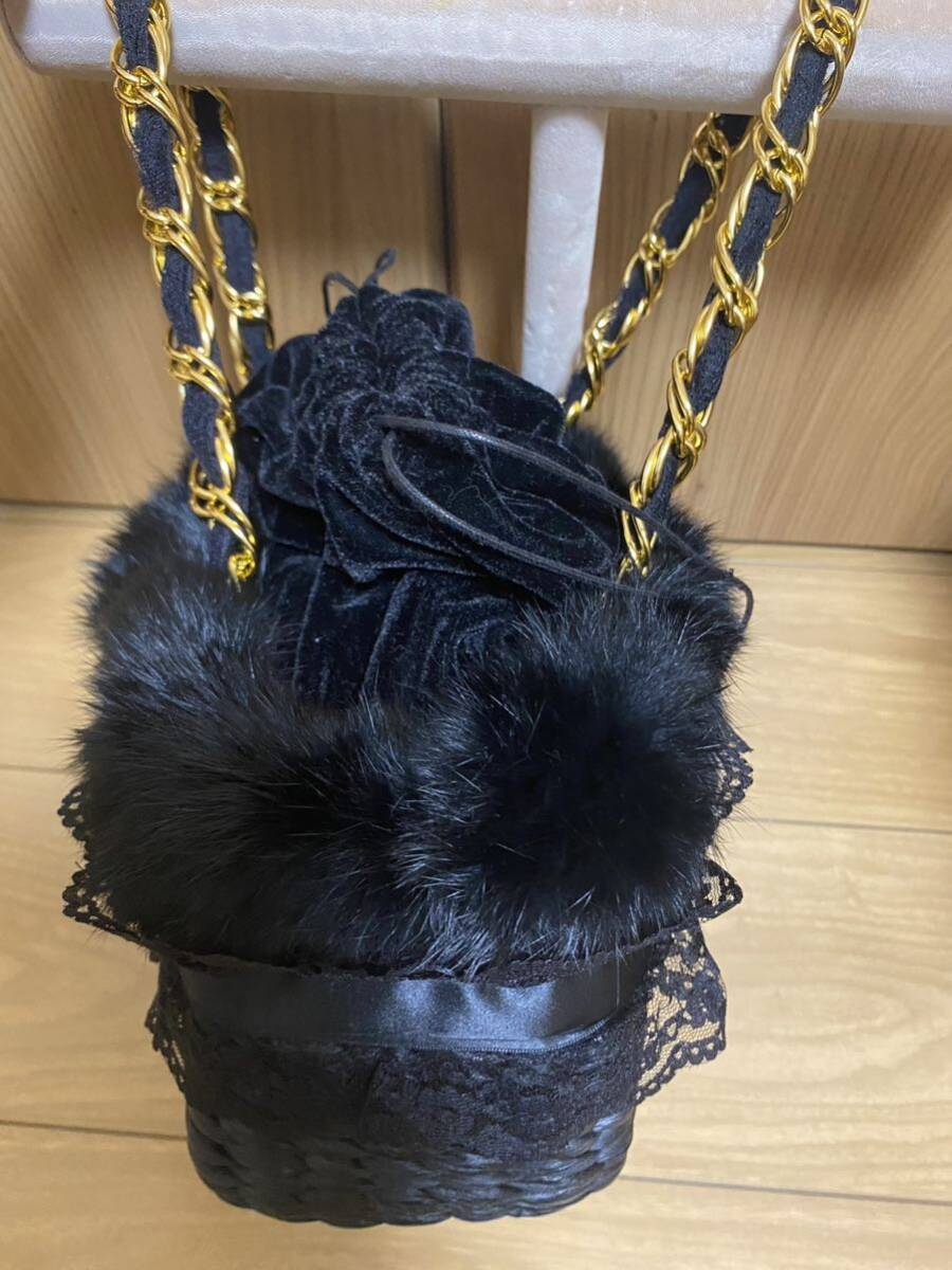 かごバッグに、レースとファーが付いています。持ち手はチェーンとレースで長さは約43cmです。バッグの形は台形型で高さ15cm 横約27cm 厚みは10〜12cmです。上部はベロアの巾着になっています。新品未使用ですが自宅保管ですのでその点ご理解頂ける方よろしくお願いします。