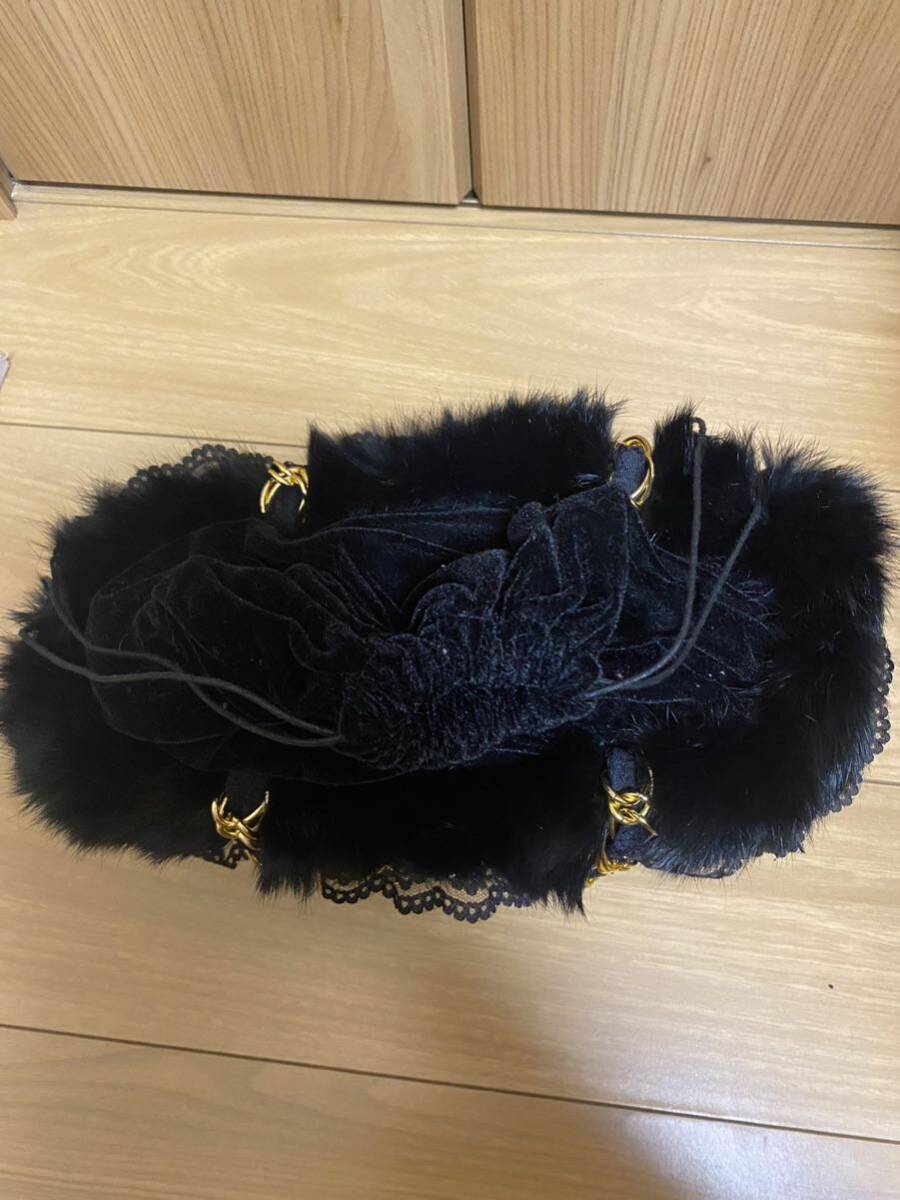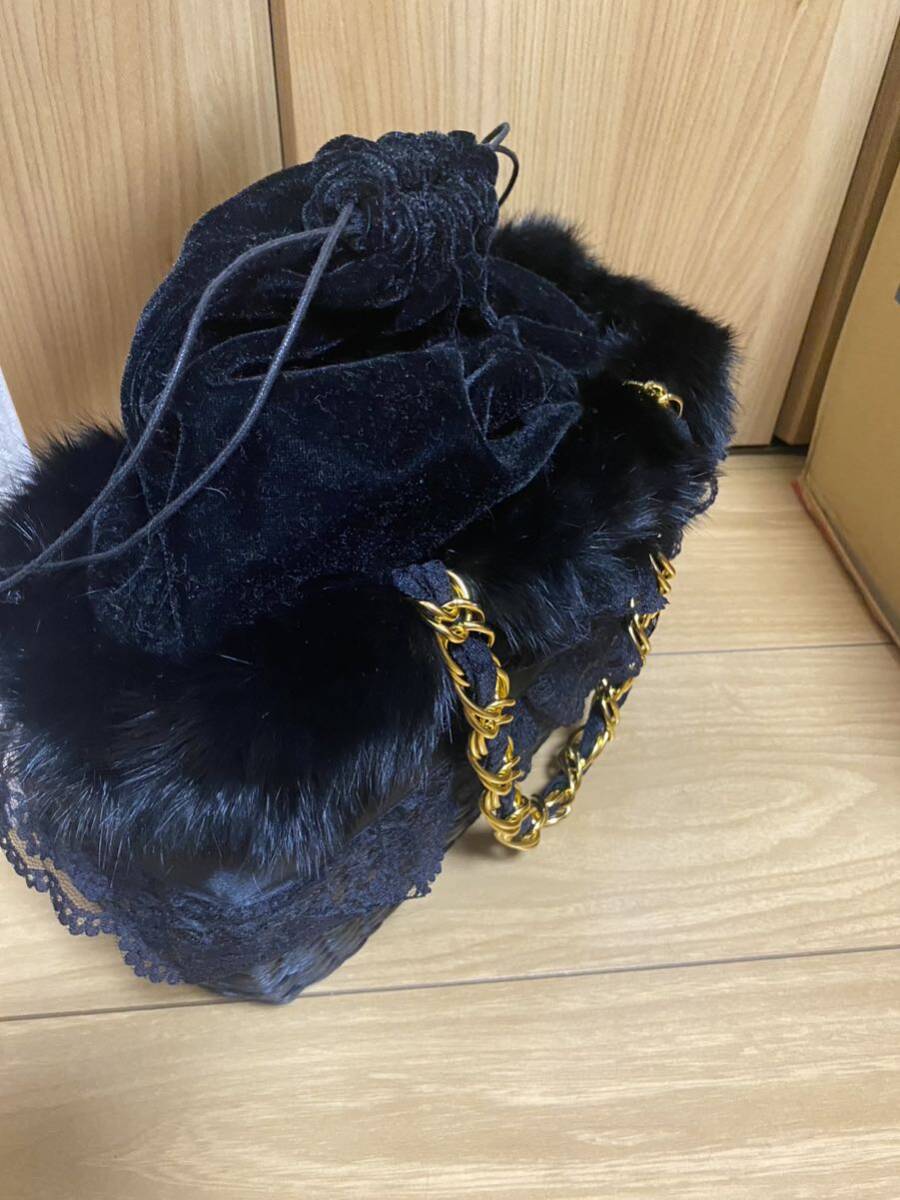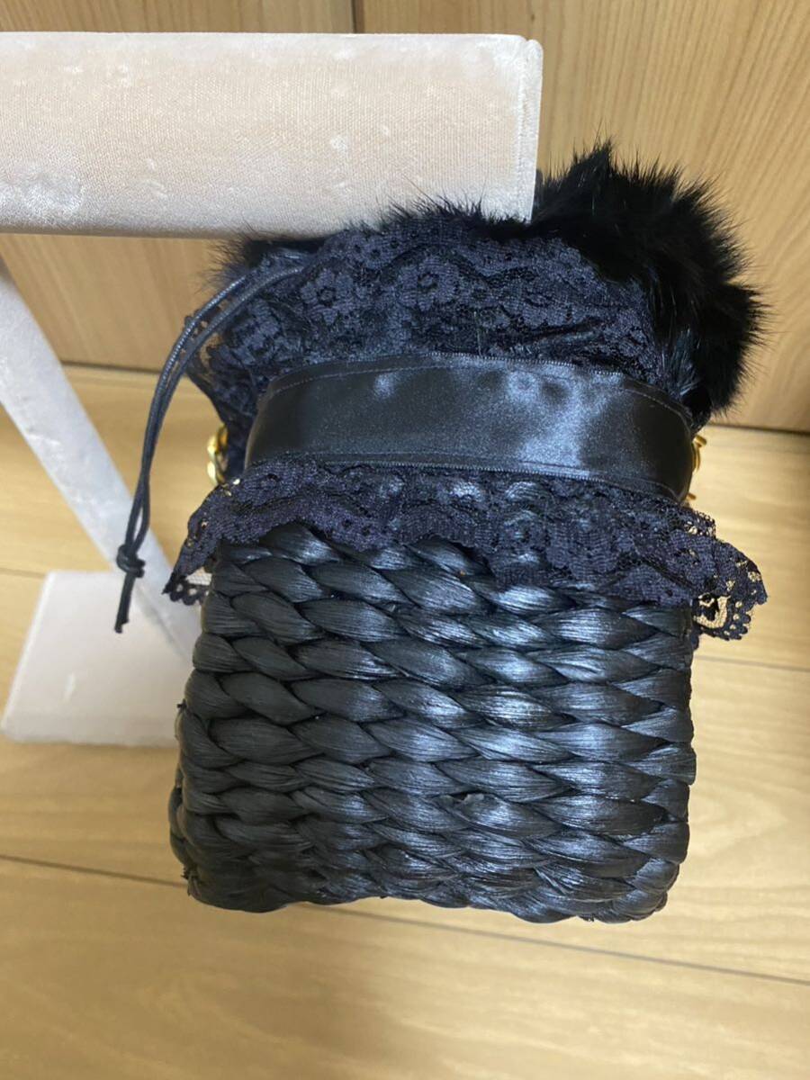 かごバッグに、レースとファーが付いています。持ち手はチェーンとレースで長さは約43cmです。バッグの形は台形型で高さ15cm 横約27cm 厚みは10〜12cmです。上部はベロアの巾着になっています。新品未使用ですが自宅保管ですのでその点ご理解頂ける方よろしくお願いします。
